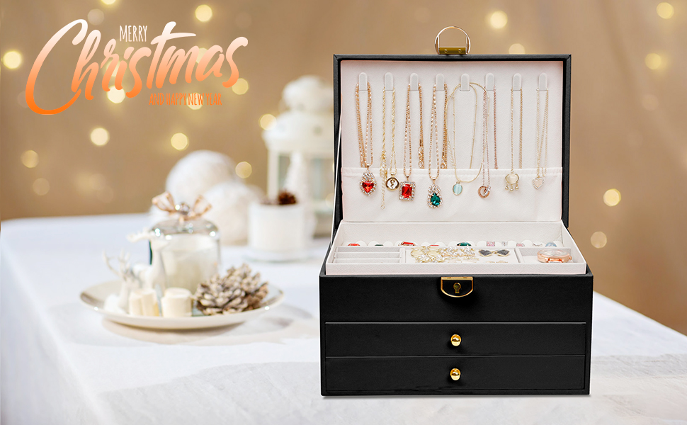 [هدية مثالية رائعة]: تأتي حقيبة تخزين المجوهرات بثلاثة ألوان بينك/أبيض/أسود، أنيقة وواسعة. يضيف قفل الأمان مع المفتاح الأناقة والأمان، هدية مثالية لأعياد الميلاد أو الكريسماس أو عيد الحب أو عيد الشكر أو يوم الذكرى الخاصة.