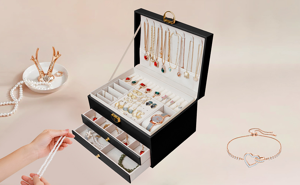 [جلد صناعي عالي الجودة]: صندوق المجوهرات مصنوع من جلد البولي يوريثين عالي الجودة، مقاوم للماء والغبار وسهل التنظيف، مما يوفر حماية شاملة من الخدوش أو التلف لجميع مجوهراتك العزيزة.