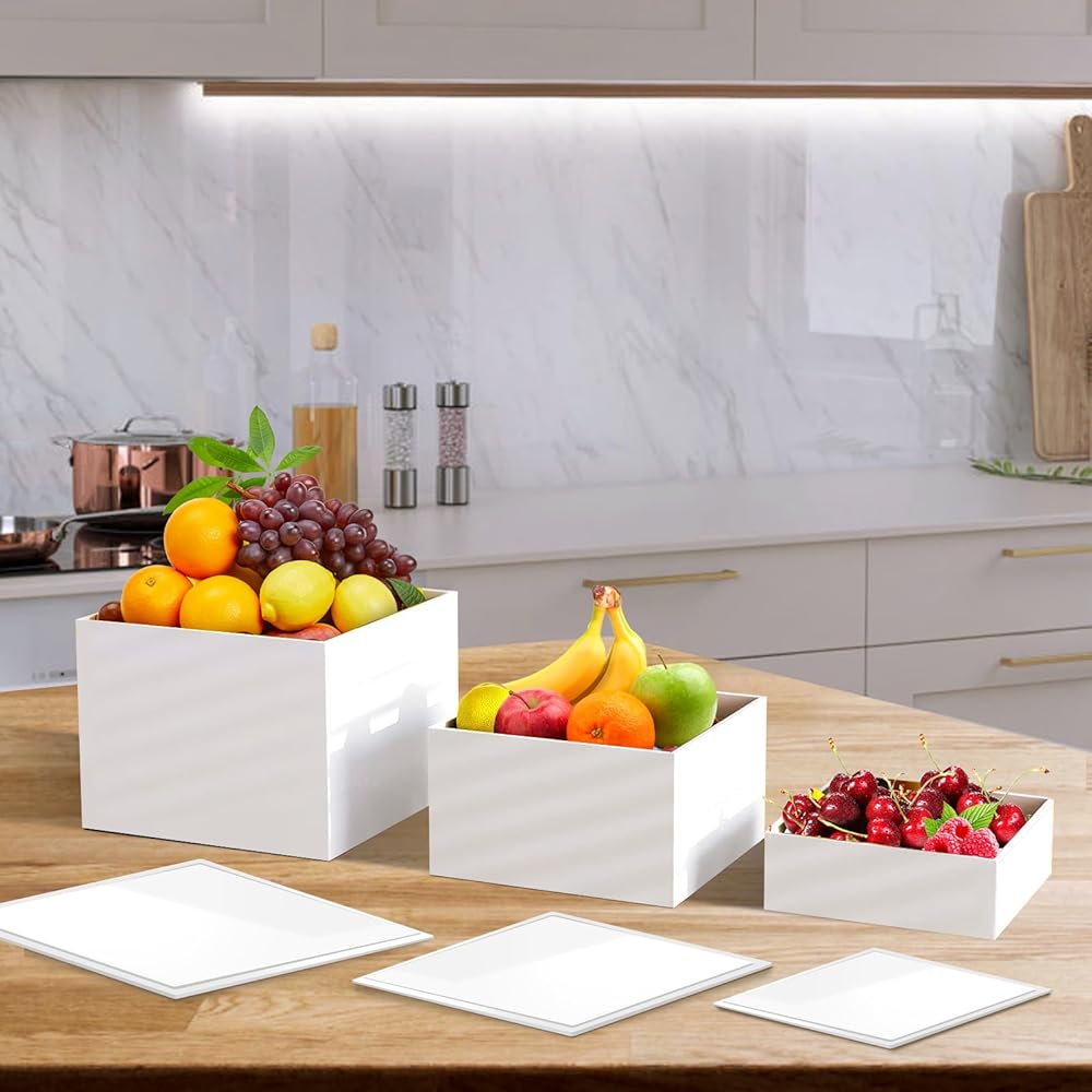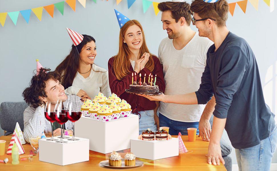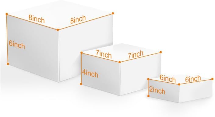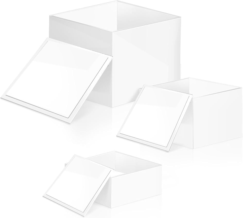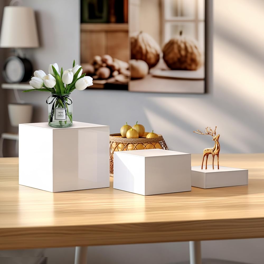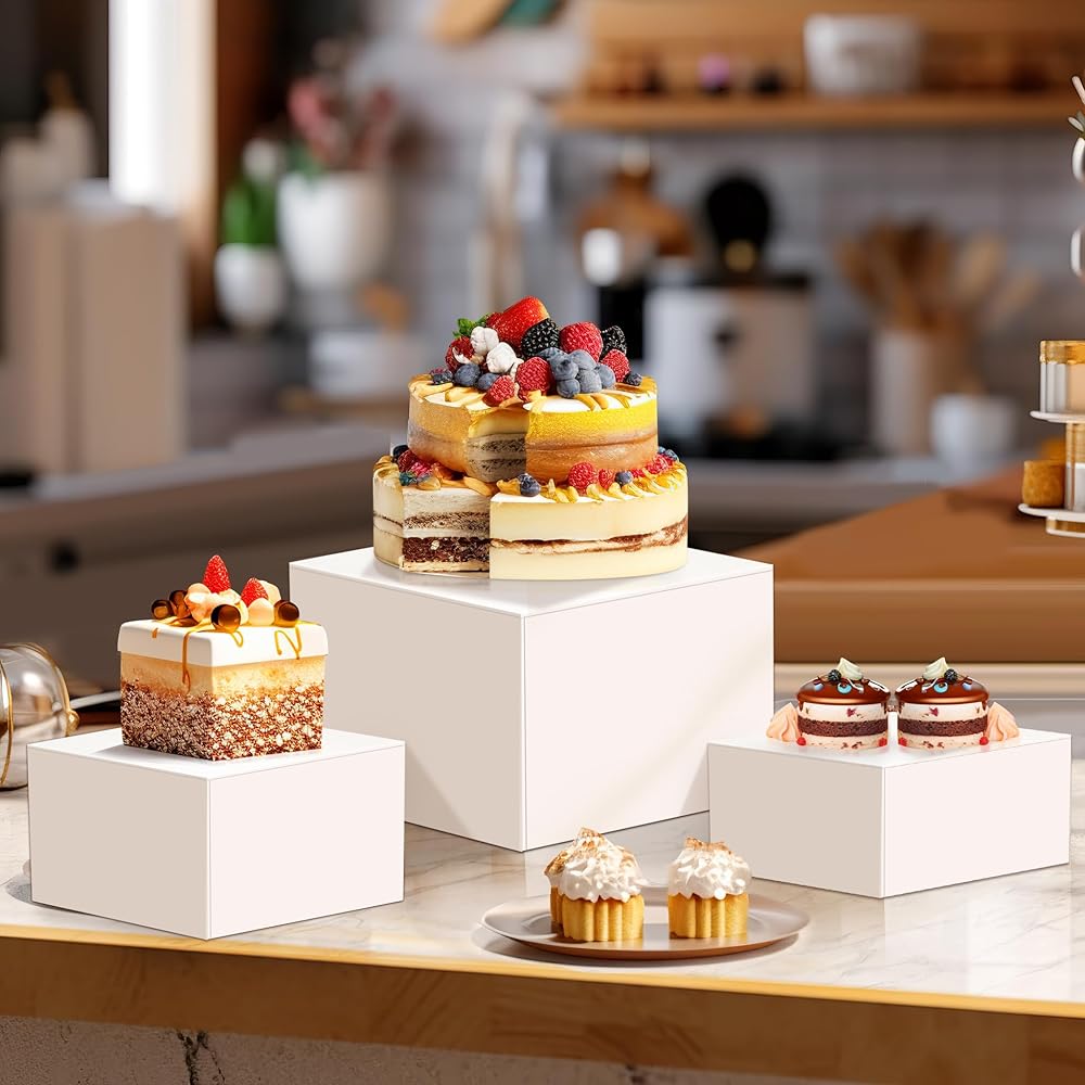 مجموعة رافعات بوفيه من 3 قطع من الاكريليك مع اغطية سفلية، صناديق اكريليك، مكعبات عرض متداخلة من الاكريليك 6 جوانب، مكعبات عرض اكريليك بيضاء، رافعات متداخلة لعرض الكيك ومقتنيات المجوهرات