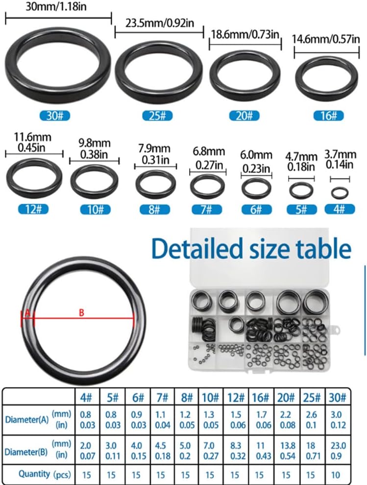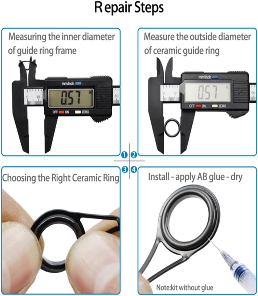 • 11 Sizes Guides Rings: Fishing eyelet repair kit covers 11 different sizes, outer diamater from large to small - 1.18in, 0.92in, 0.73in, 0.57in, 0.45in, 0.38in, 0.3in, 0.27in, 0.23in, 0.18in, 0.12in, Ceramic guides rings to repair average freshwater and saltwater rod, small sizes for micro rods.