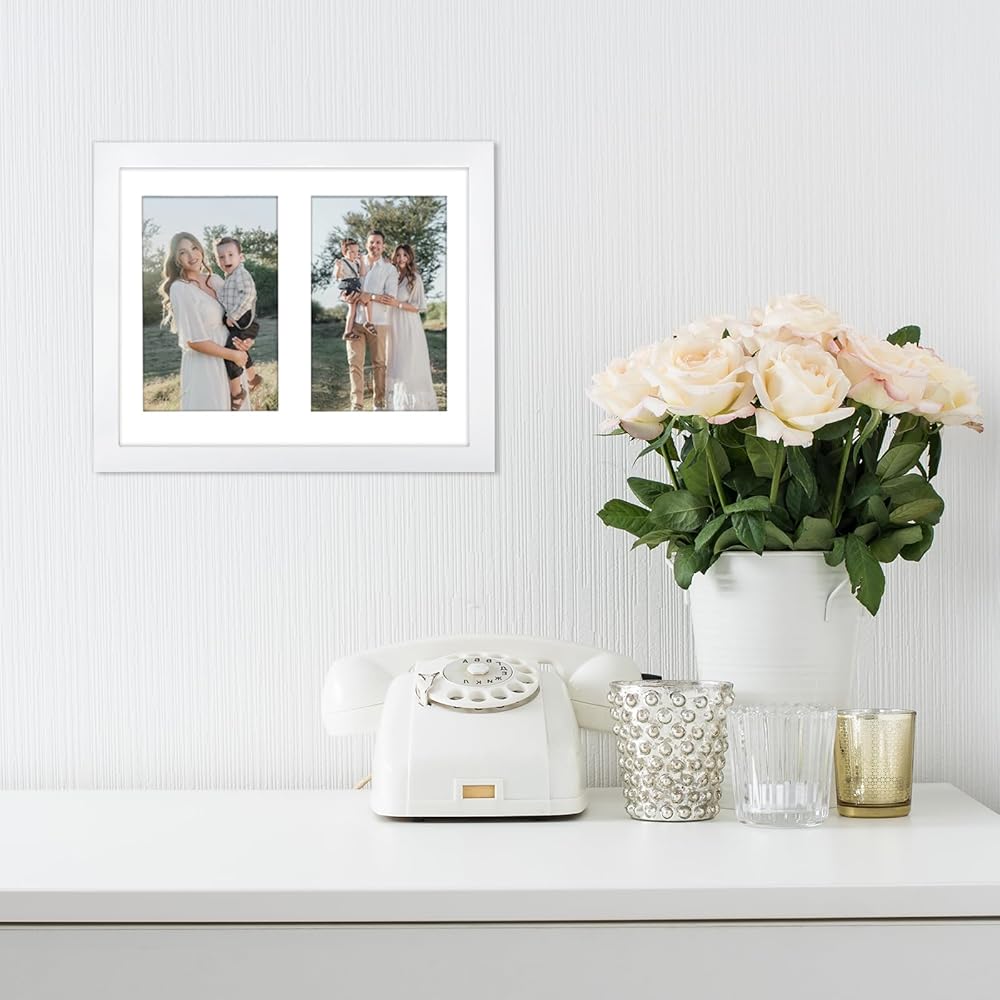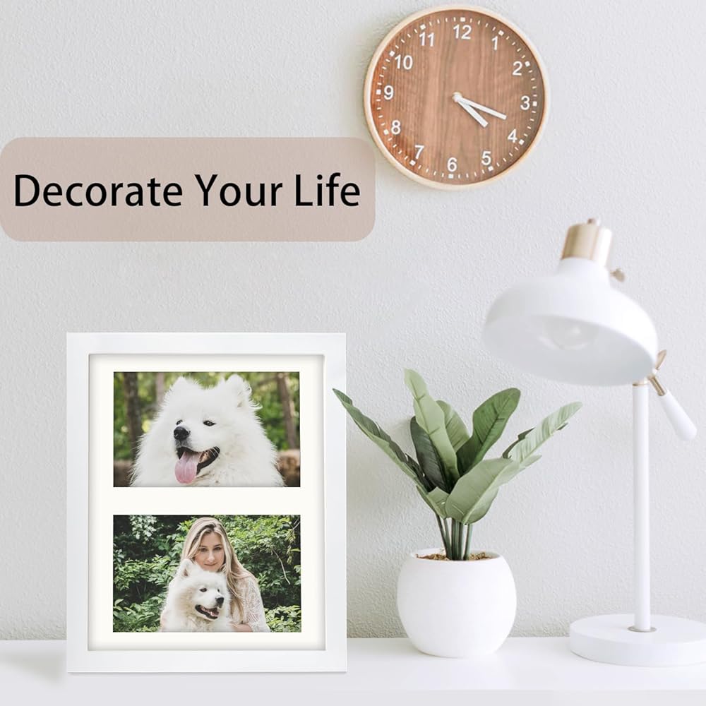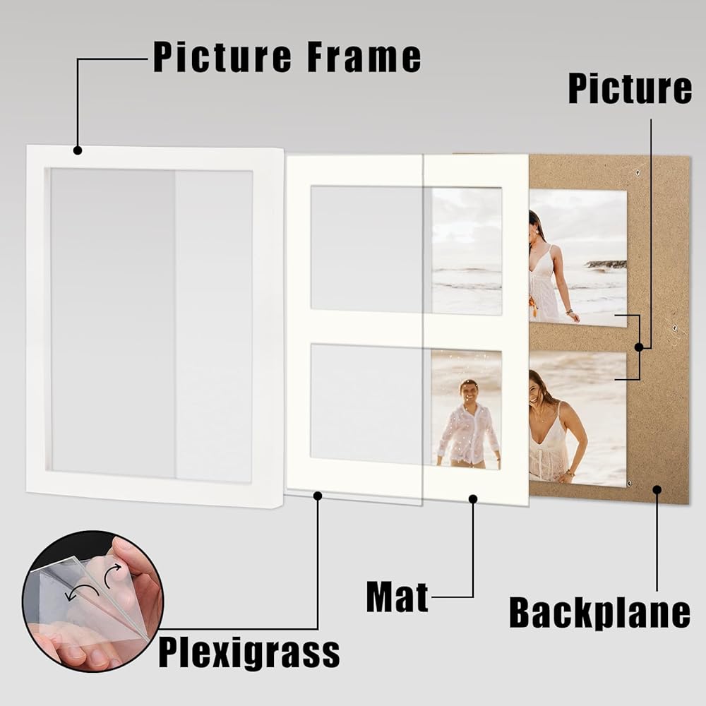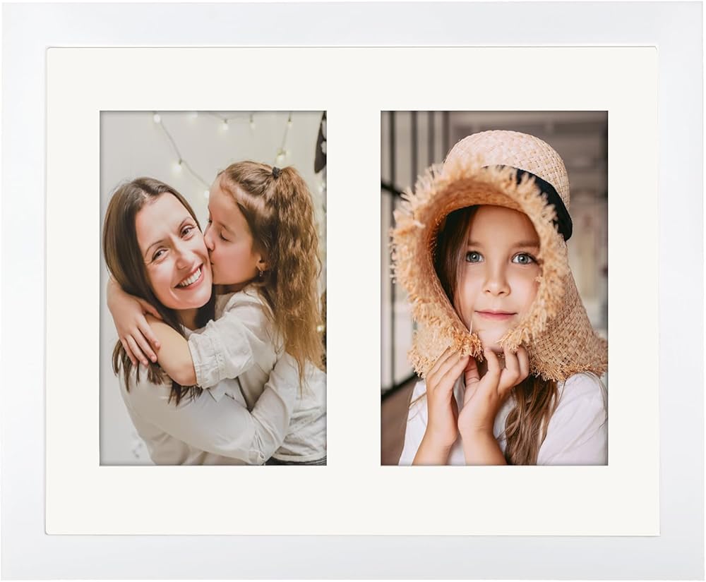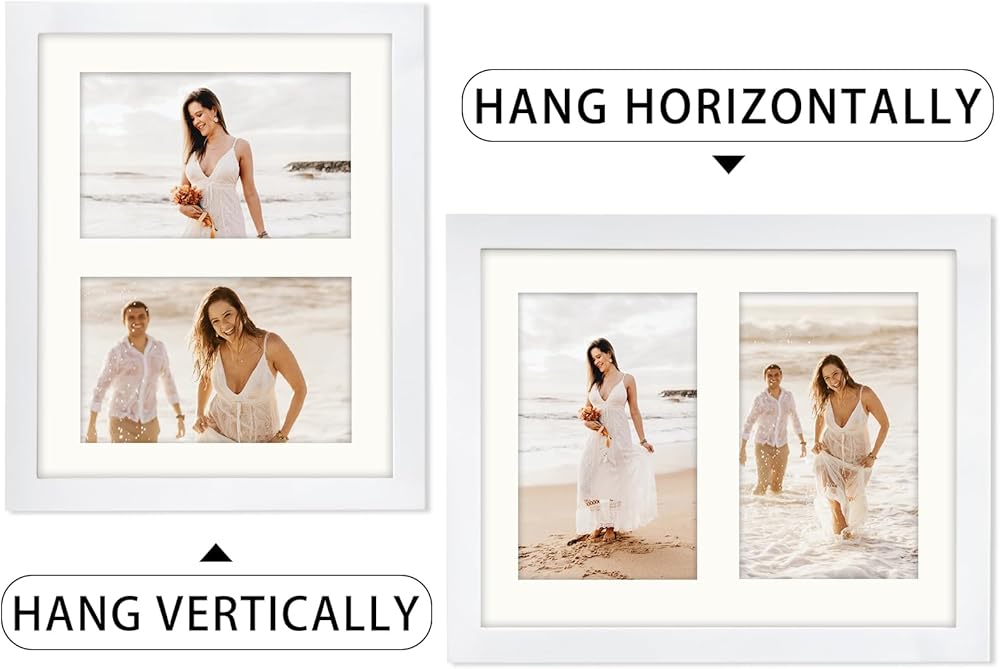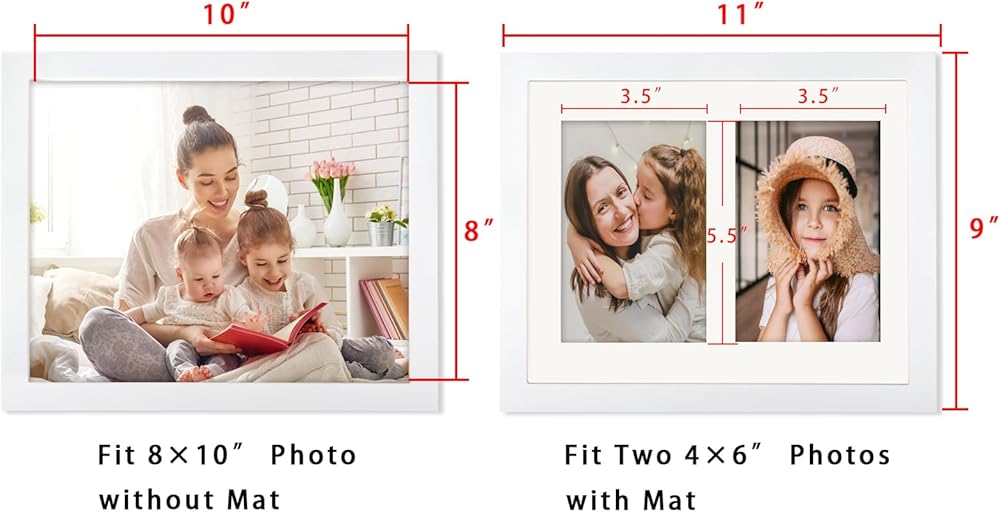 • 8x10 Black Picture Frame: Fits 2 photos Horizontal and Vertical in a frame, Holds double 4x6 photos with warm white mat, or 8x10 picture without mat. PS: Mat opening was slightly smaller than photo for better fix.