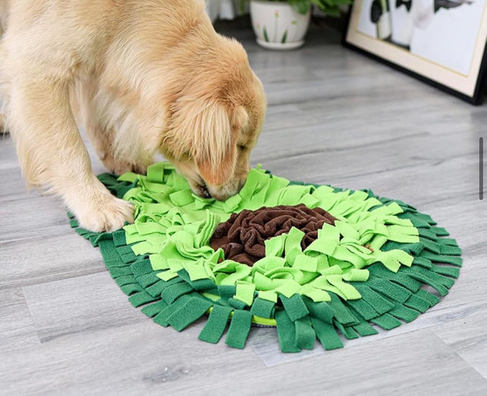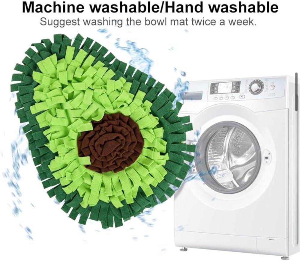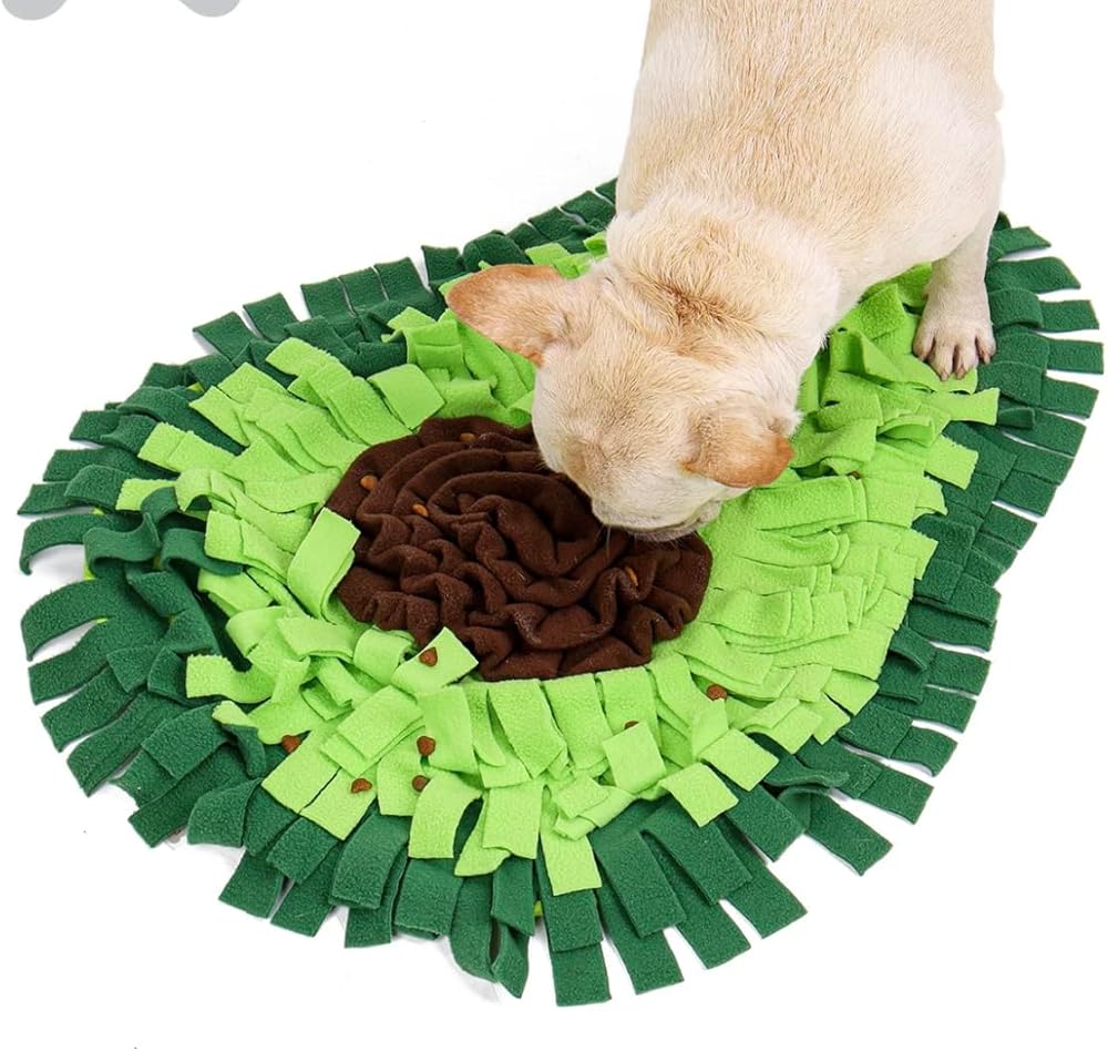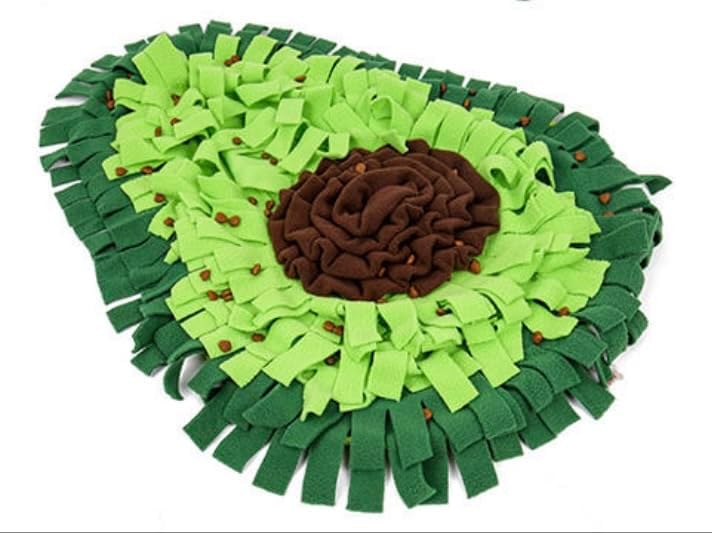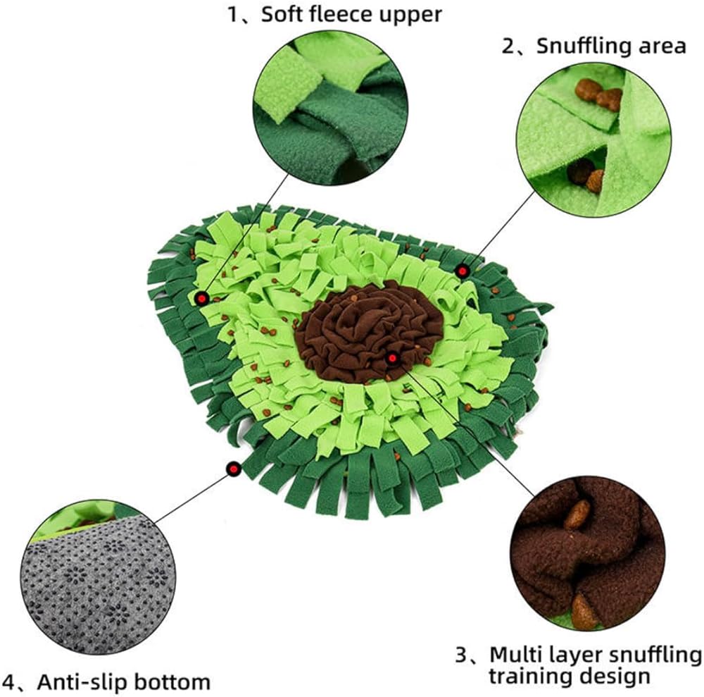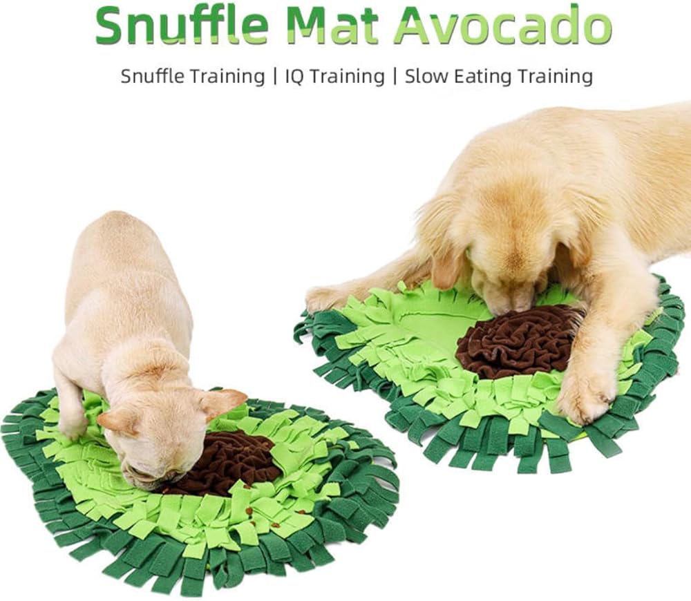 Paw It Forward pet products- Avocado dog sniffing/snuffle mat. This super soft sniffing mat helps keep your dog busy and slows down his/her eating habits. This fun avocado design is a good size (27 by 21 inches) for dogs of all sizes. Just hide the food and treats and watch your furry friend wag their tail while searching for every last bit. With multiple layers on this mat for hiding treats your dog will be excited to search for. E-co friendly soft fleece upper with ant -slip bottom is easily cleaned by hand or in the washing machine. These mats have been proven to release extra energy and help keep your pet calm. Pet experts says 10 minutes of snuffle training is the equivalent of one hour of exercise.