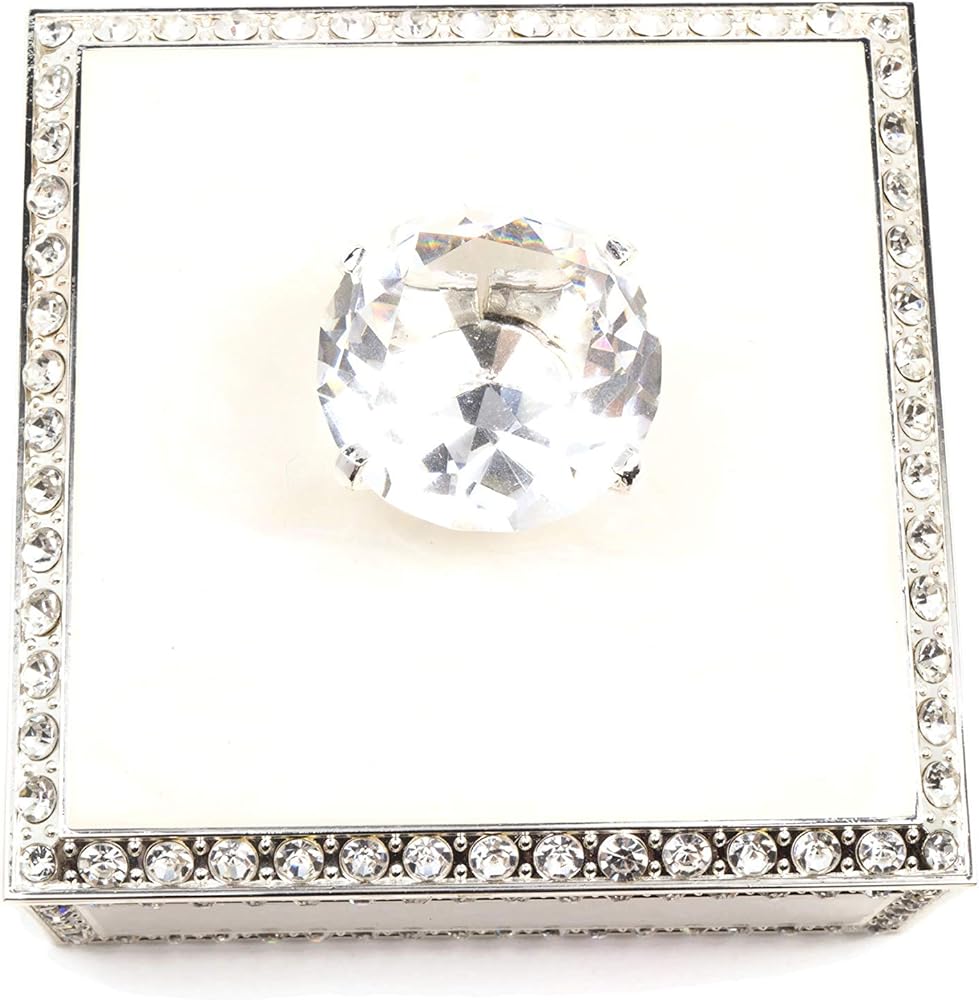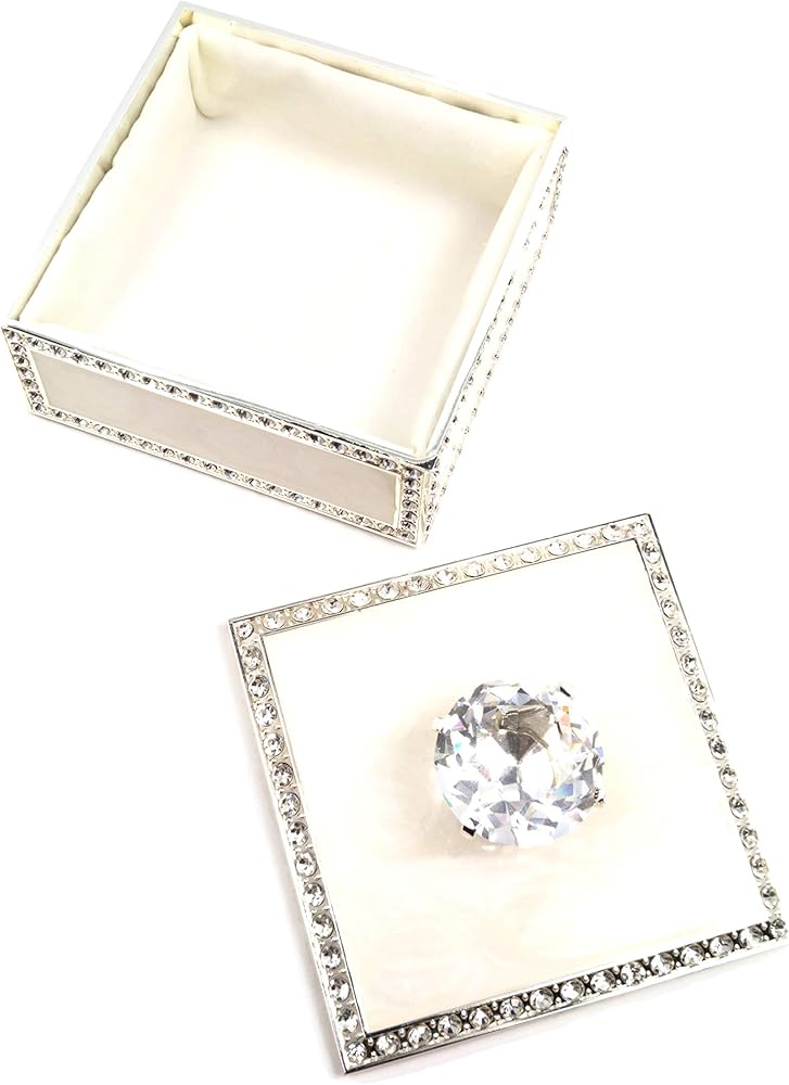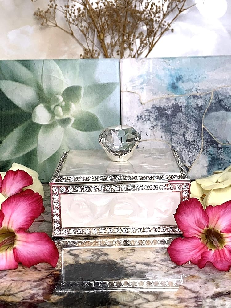 مزين: تم تصميم صندوق المجوهرات هذا ليكون بسيطًا، وهو مزين بشكل خفيف بأحجار الراين الفضية وجوهرة كبيرة على الغطاء