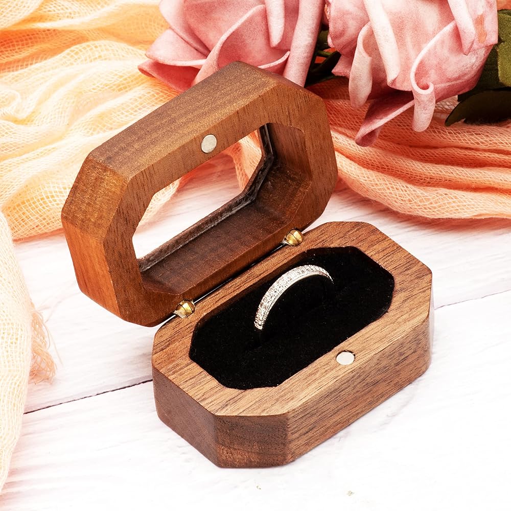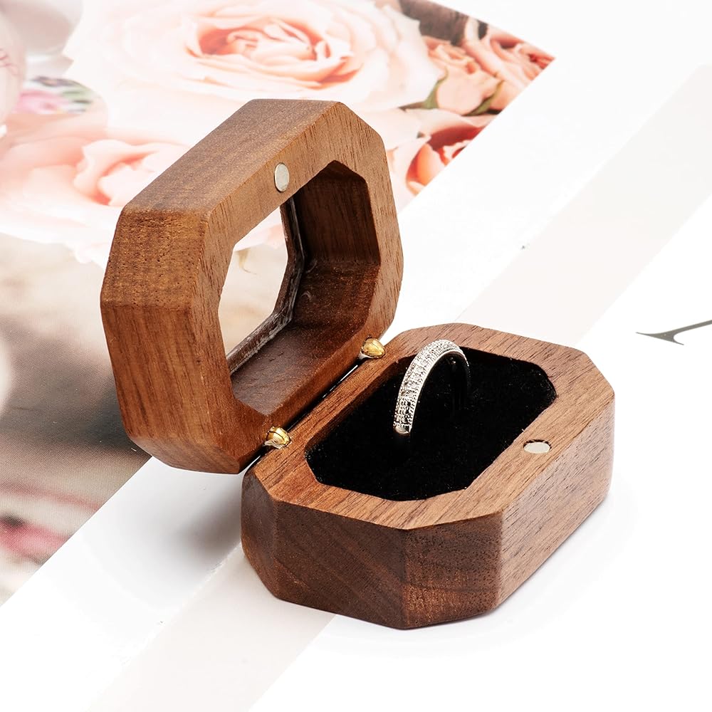 • مواد عالية الجودة: صندوق الخاتم الفريد مصنوع من خشب الجوز الطبيعي المبطن بالمخمل الناعم ومفتاح مغناطيسي محكم الغلق لحماية الخاتم بشكل أفضل من الانزلاق.