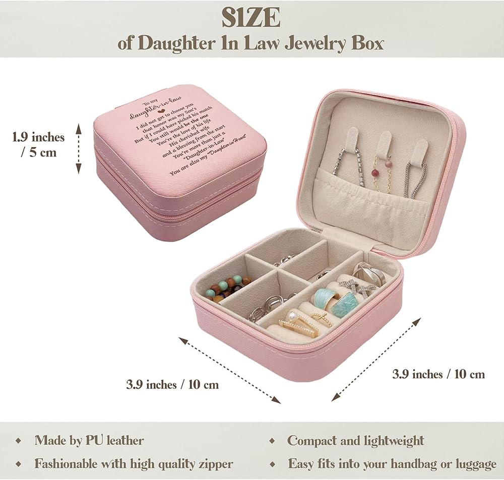• سطح صندوق مجوهرات Daughter in Law مصنوع من جلد البولي يوريثان مع فاصلين قابلين للإزالة لتلبية الاحتياجات المختلفة. يبلغ مقاسها تقريبًا 3.9 × 3.9 × 2 بوصة، وهي خفيفة الوزن وسهلة الحمل عند السفر، ولا تقلق أبدًا بشأن العثور على المجوهرات أو فقدانها في كل مكان.
