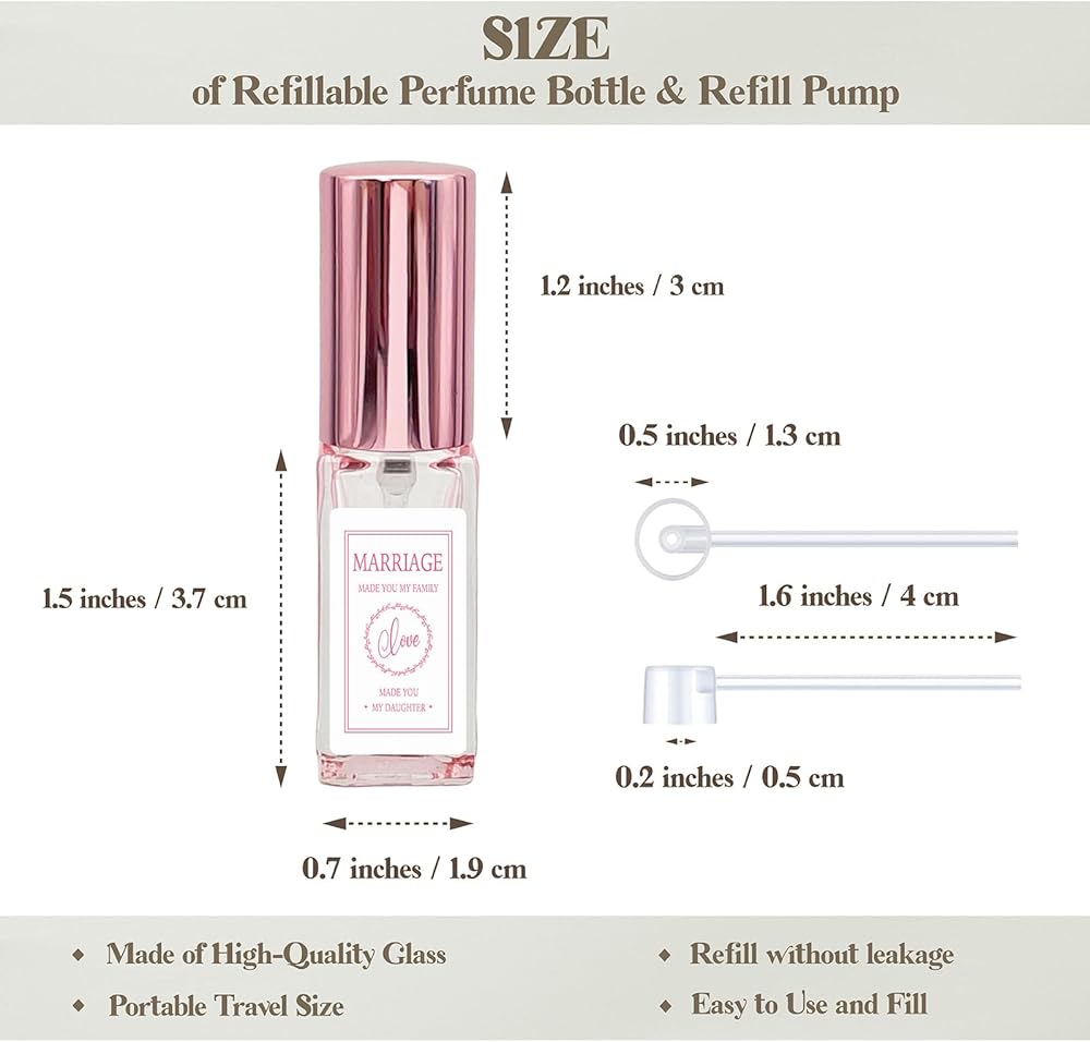 • زجاجات العطور الفارغة القابلة لإعادة الملء هذه مطبوعة برسالة حب "الزواج جعلك عائلتي، الحب جعلك ابنتي" تتوافق مع صندوق مجوهرات عيد ميلاد ابنة الابن، سهل الحمل والنقل، رذاذ عطر قابل لإعادة التعبئة سعة 10 مل مثالي للابنة. في حفلة عيد ميلاد القانون، والسفر، وصالة الألعاب الرياضية، ورحلة العمل وما إلى ذلك
