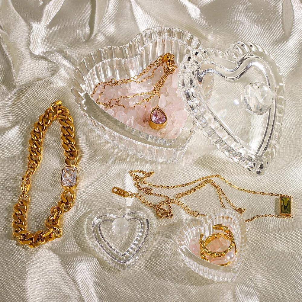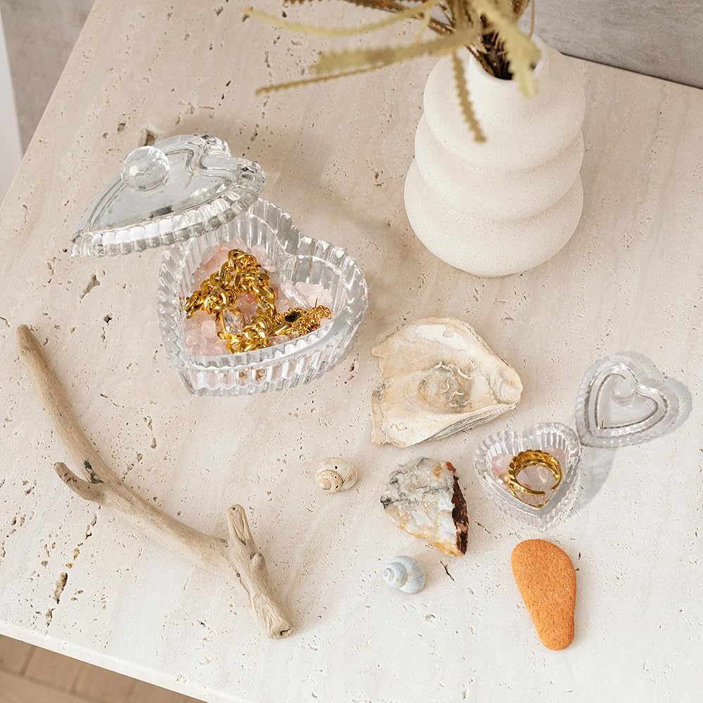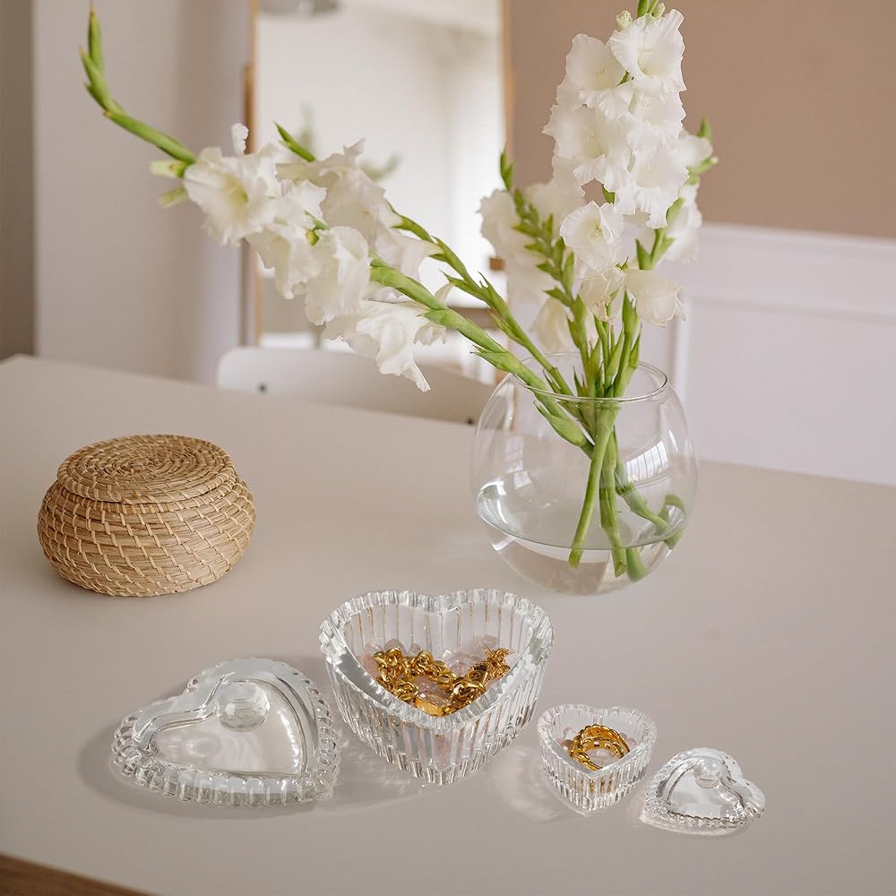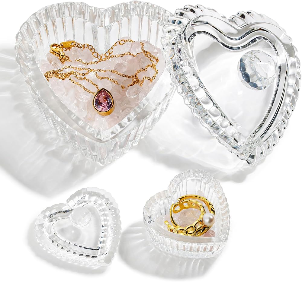 زين بليس صندوق مجوهرات على شكل قلب من الزجاج الكريستالي مع غطاء، صندوق على شكل قلب بتصميم منقوش رائع، صناديق حلي لطيفة مثالية لتخزين الاقراط والقلائد والخواتم وترتر الاظافر والحلوى