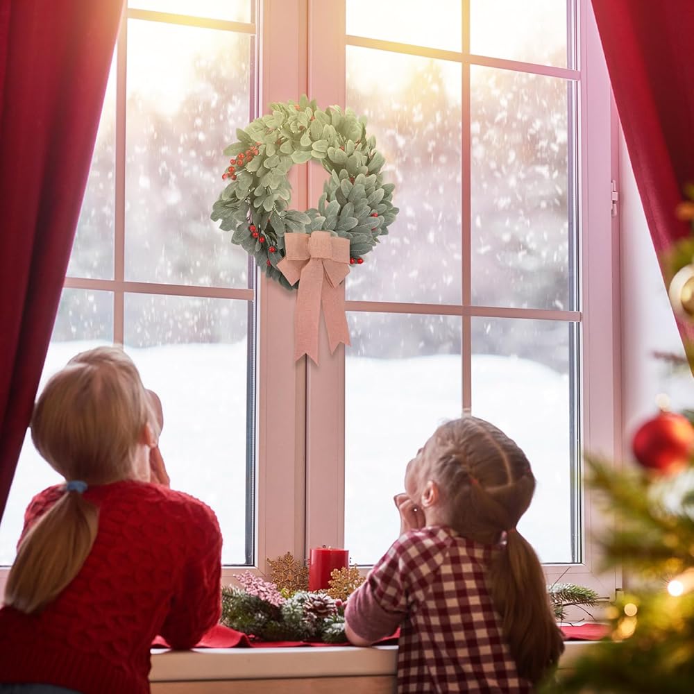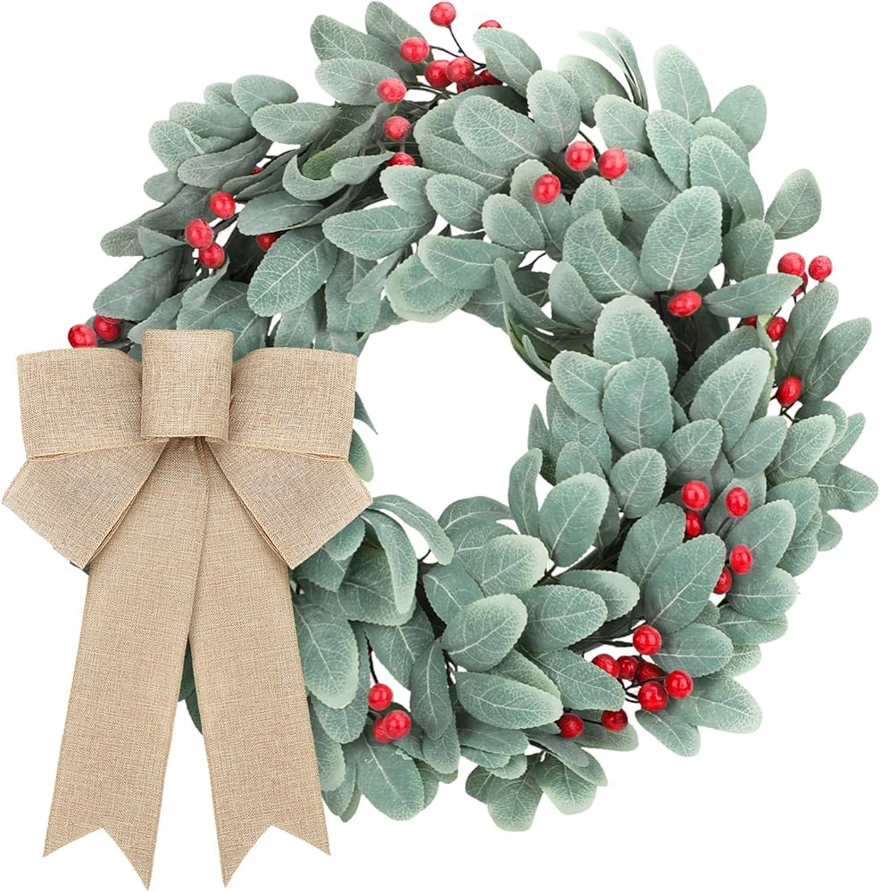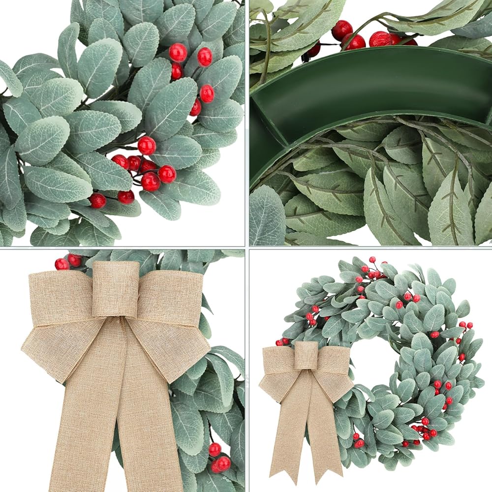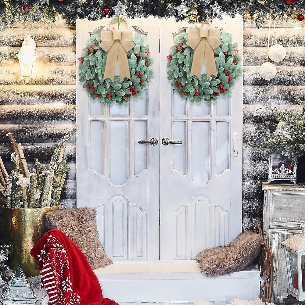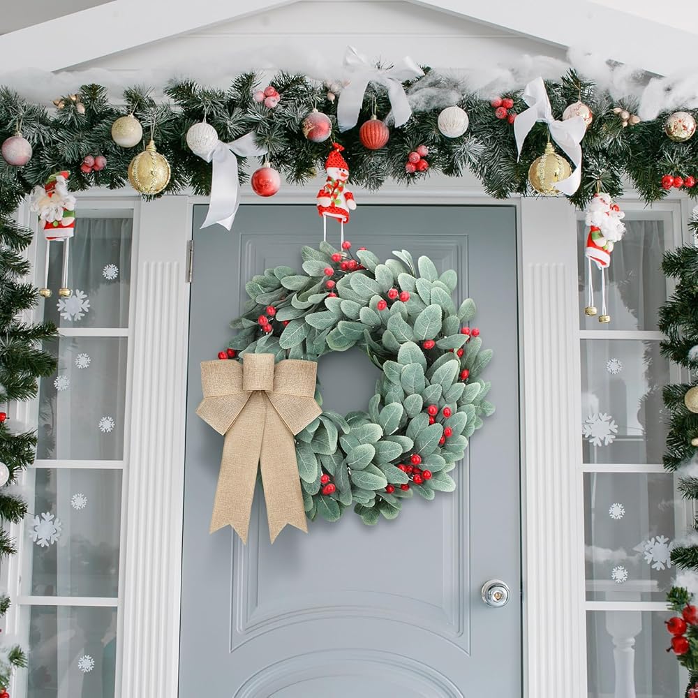 اكاليل زينة الكريسماس من كرافت ساتان، 19 انش، اكاليل اذن الحملان المتدفقة لجميع المواسم مع فيونكات توت على الباب، اكليل زهور الكريسماس الاصطناعي للمنزل الريفي في الهواء الطلق في الشتاء ديكور المنزل