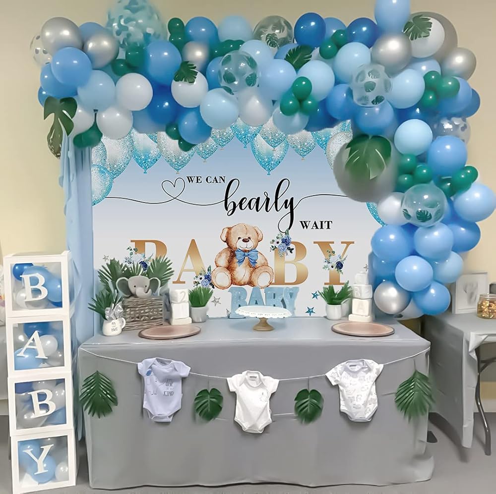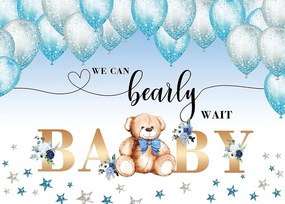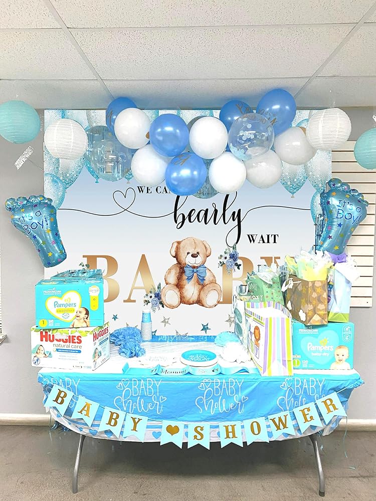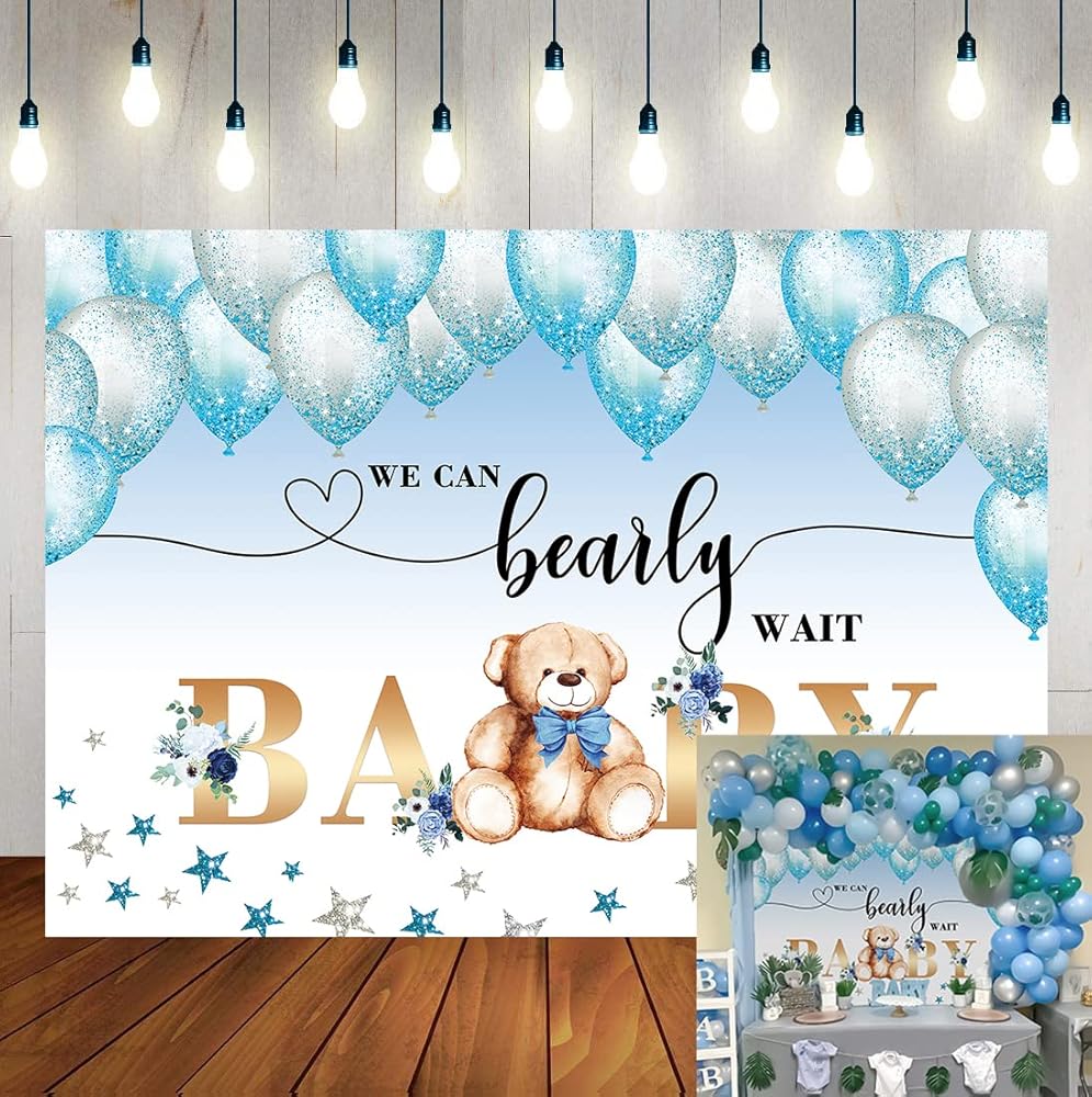 Applicable scene:Bear Baby Shower Party Backdrop,We Can Bearly Wait Watercolor Blue Balloons Star Leaves Background,Baby Shower Boy birthday party Cake Table Decoration Photo Booth Props,instantly liven up your party setting!