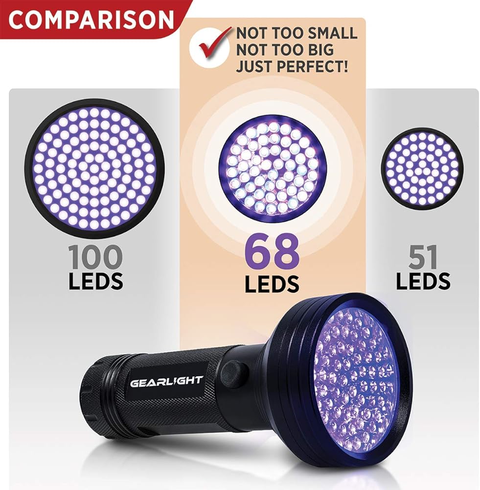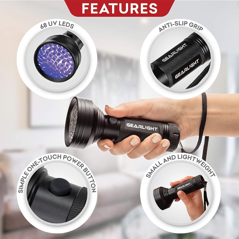 مصباح الأشعة فوق البنفسجية الأسود هو الأداة المثالية للكشف عن البول الجاف للكلاب والقطط وبقع القوارض والبقع المخفية التي تُترك دون اكتشاف تحت عيون الإنسان الطبيعية. يعد اكتشاف العقارب ومصادقة العملات وبطاقات الهوية وجوازات السفر مجرد عدد قليل من تطبيقات المصباح اليدوي ذو الضوء الأسود. يمكن أن يعمل هذا الجهاز متعدد الوظائف أيضًا كمجفف للأظافر.