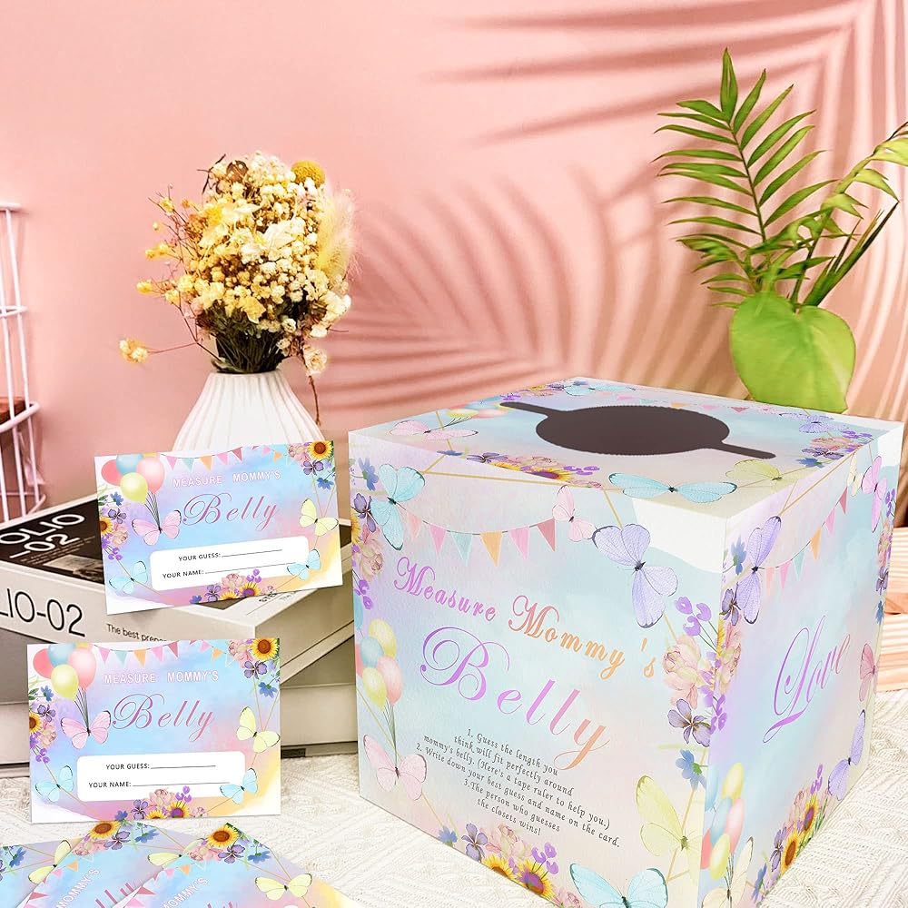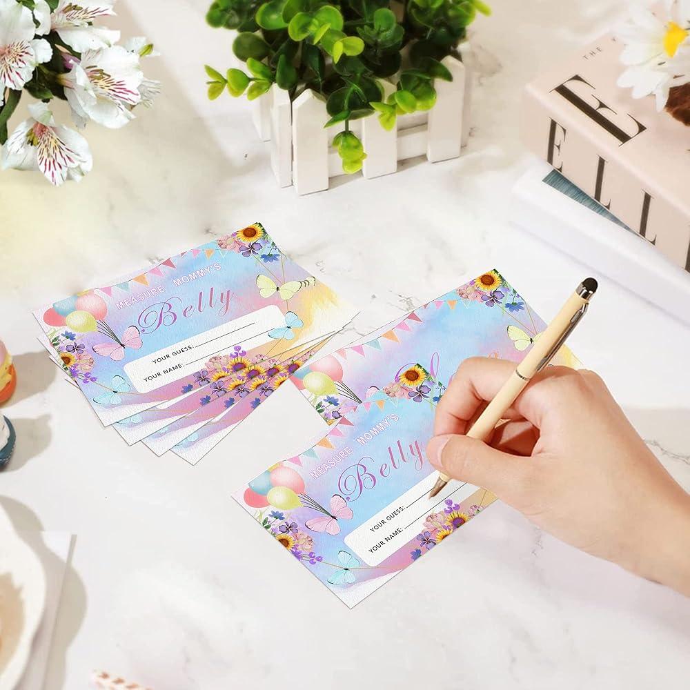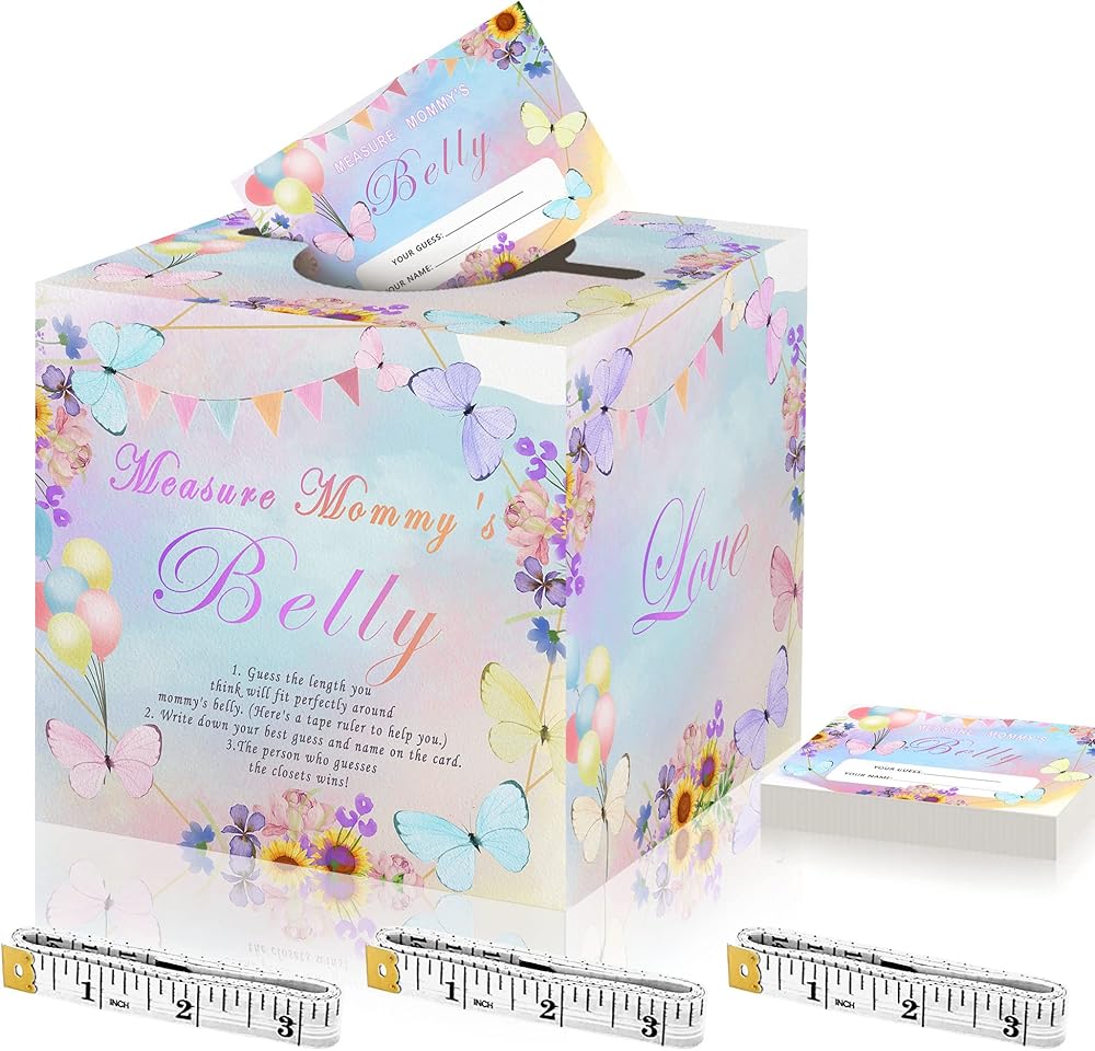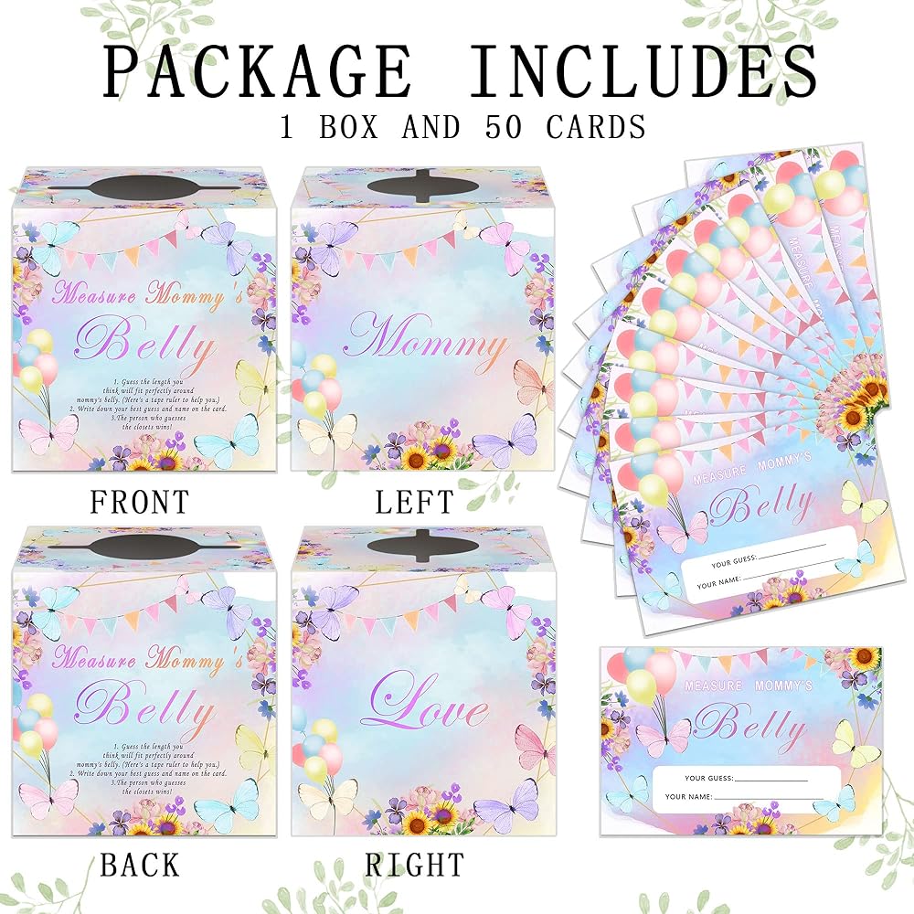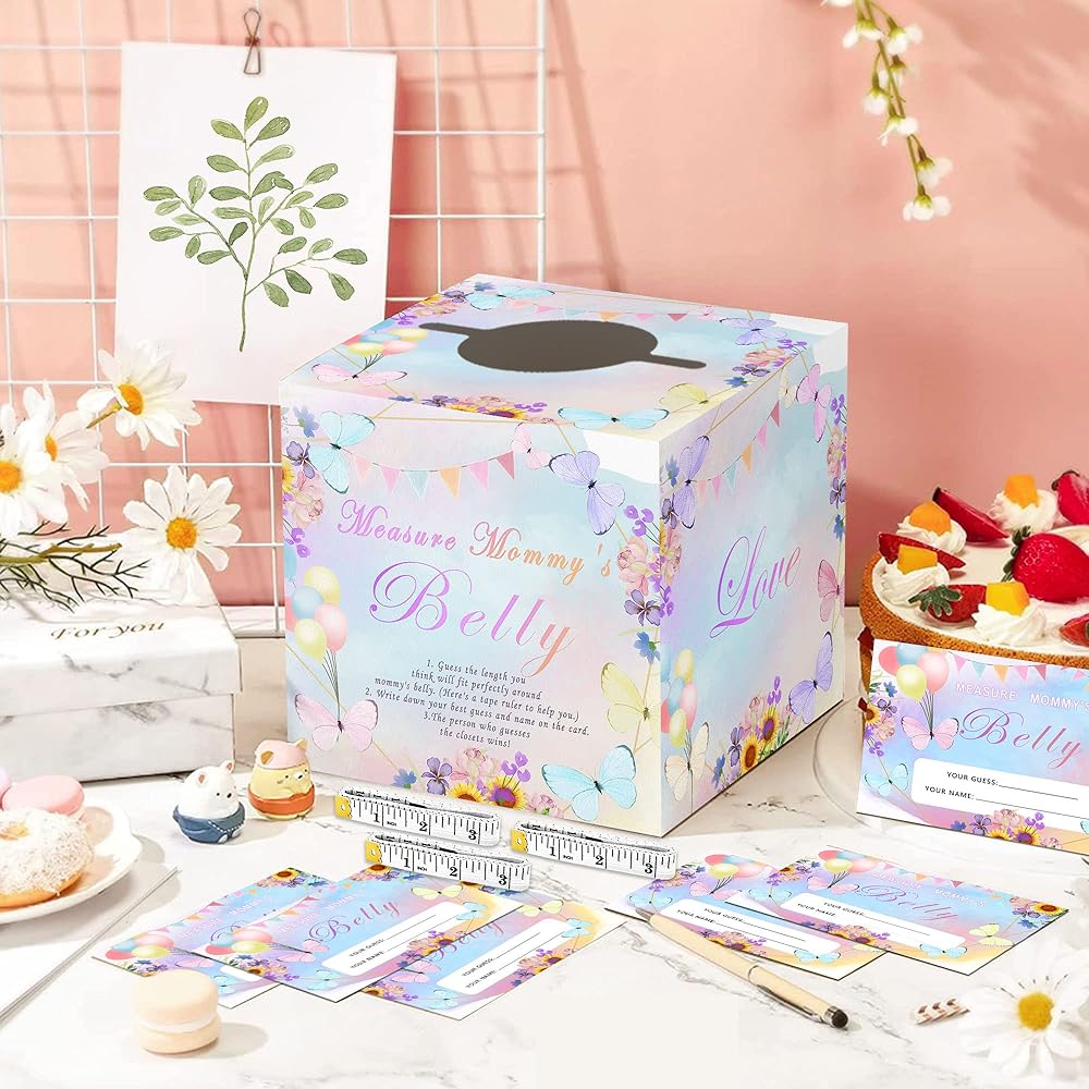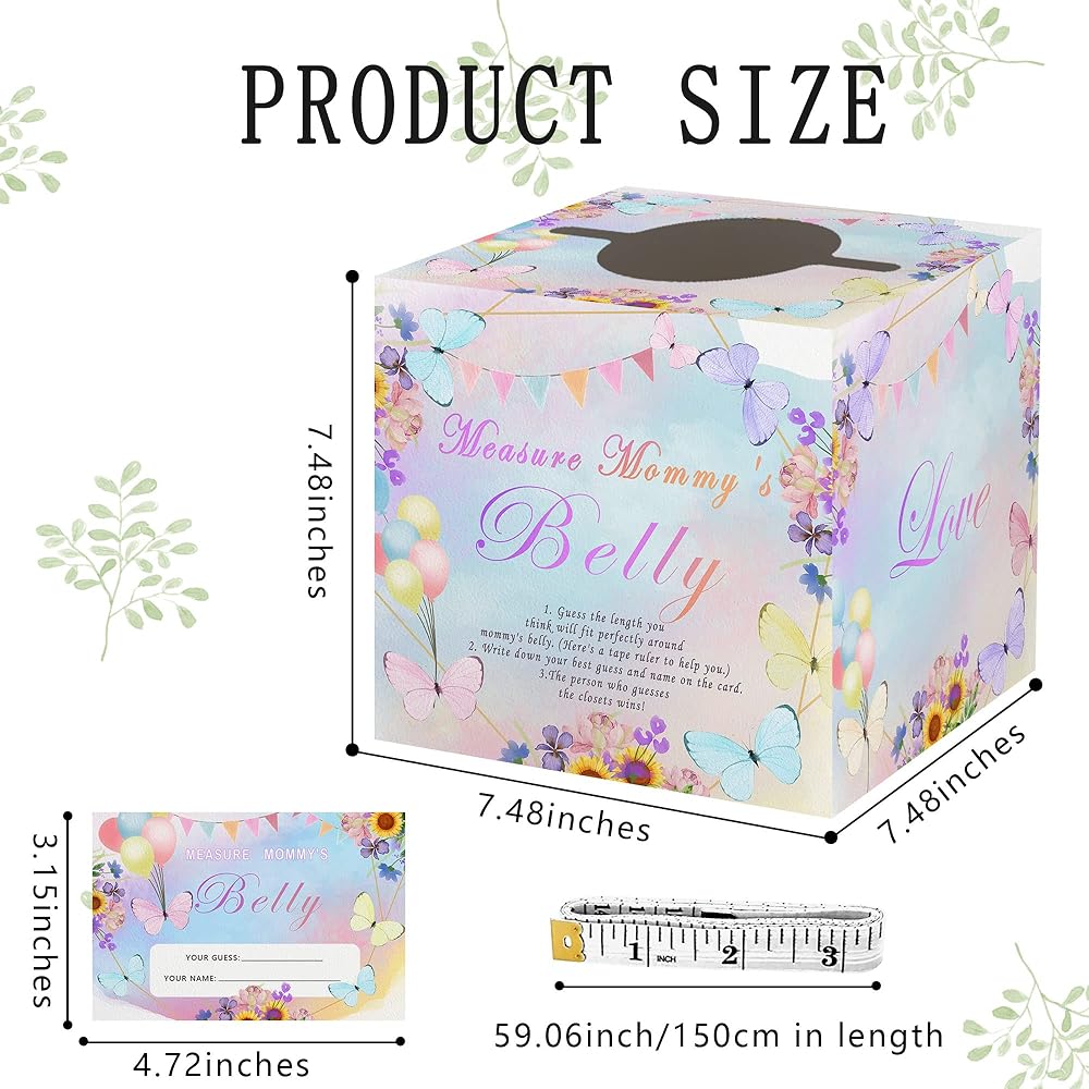 Azbuk تخمين مدى حجم لعبة بطن الأم لاستحمام الطفل، 50 بطاقة تخمين حجم بطن الأم على شكل فراشة، لوازم تزيين نشاط استحمام الطفل، مع 3 أشرطة قياس وصندوق تجميع واحد