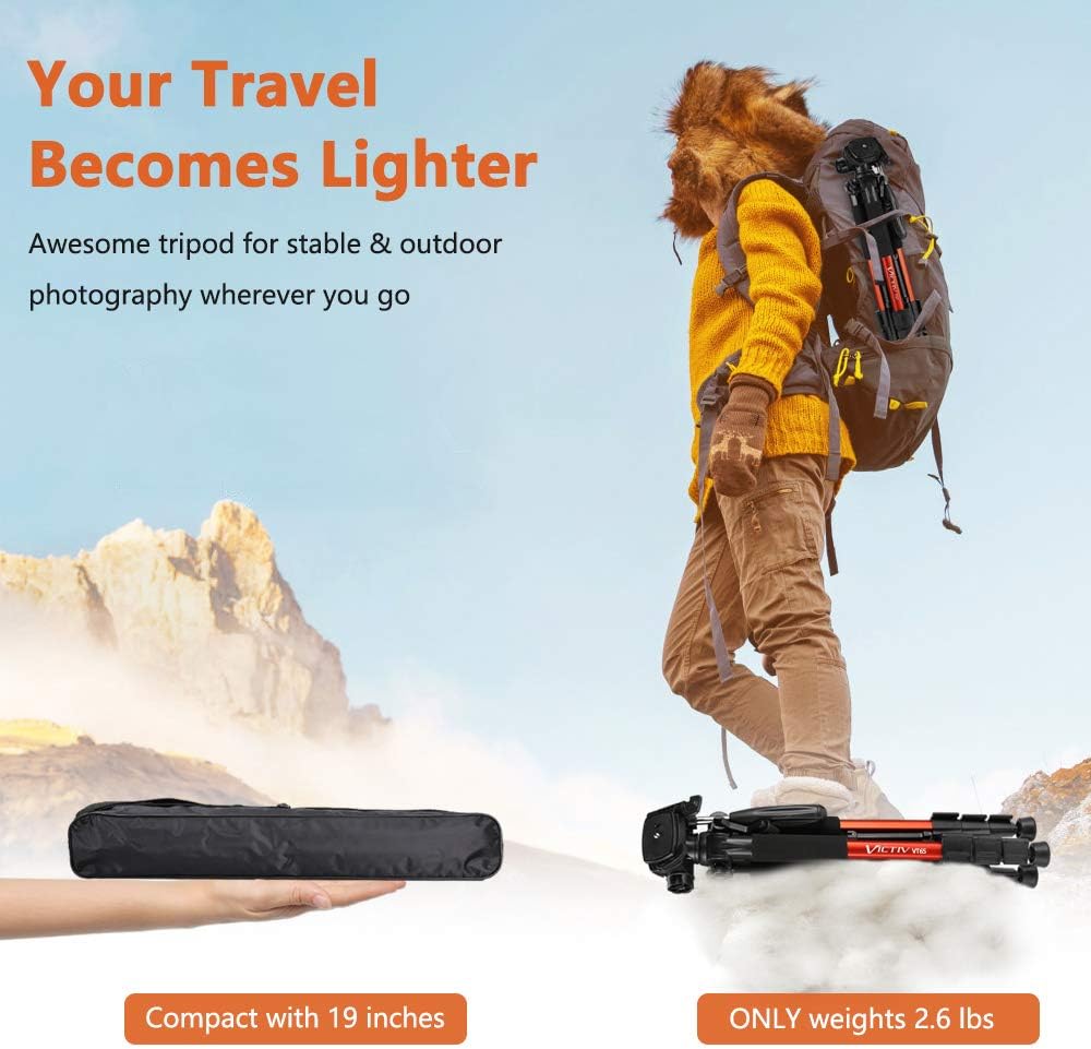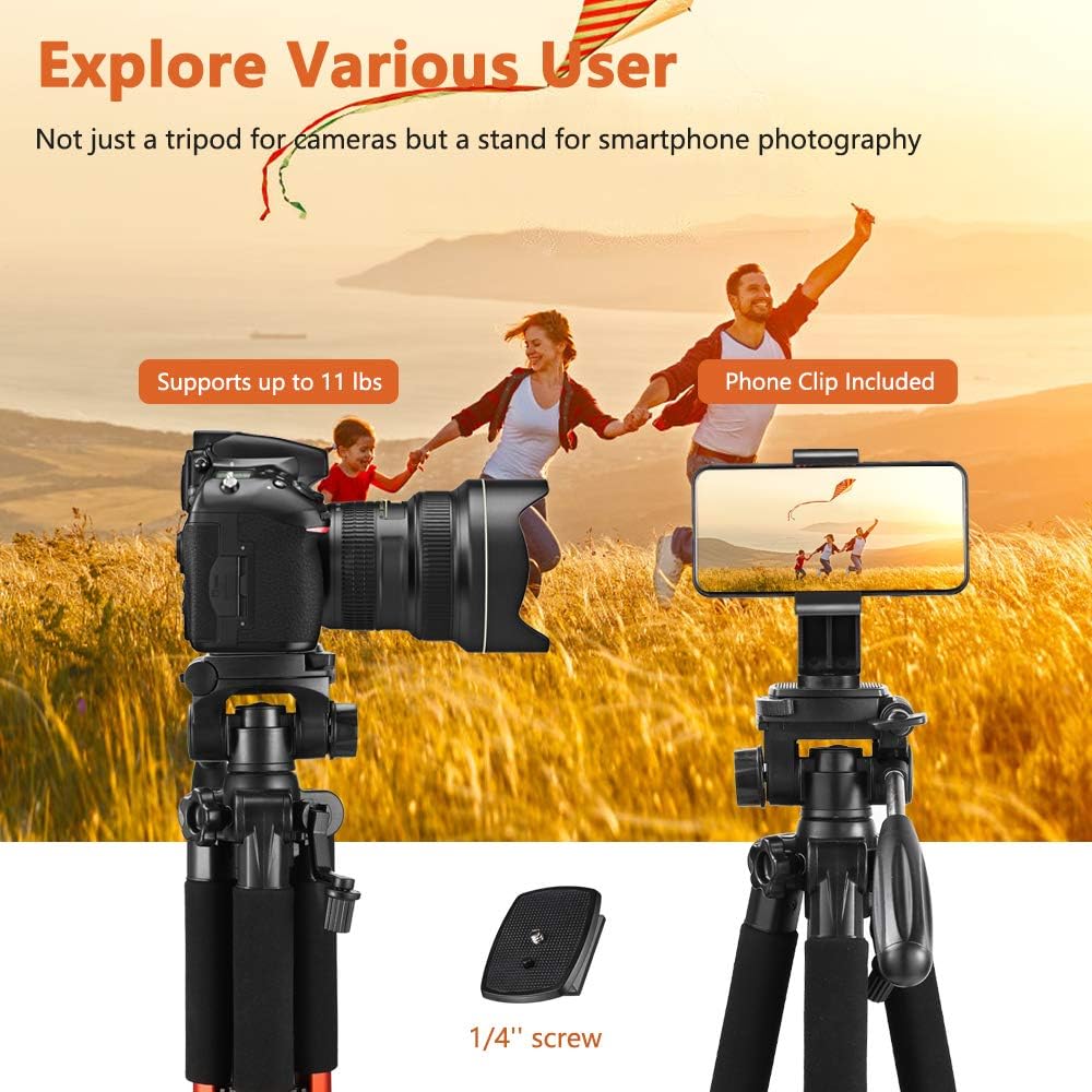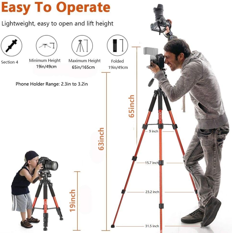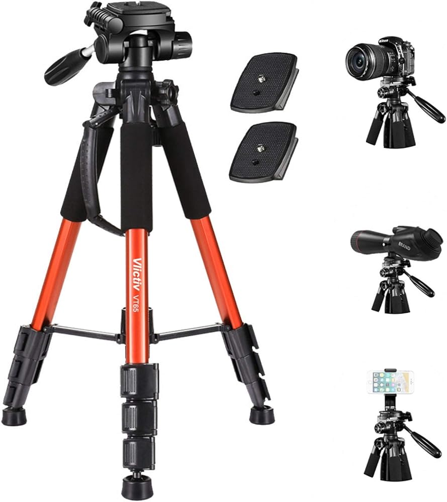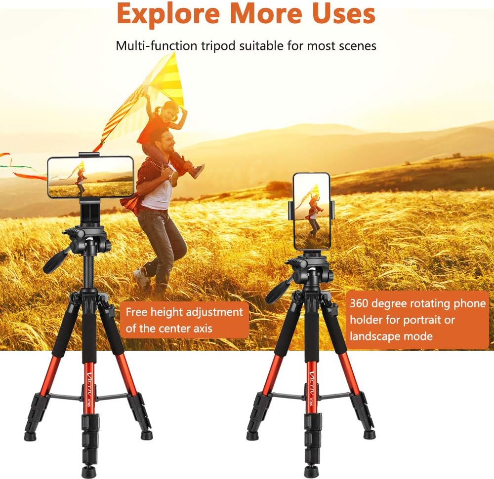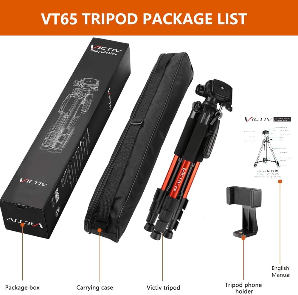 حامل ثلاثي من الألومنيوم مقاس 65 بوصة من Victiv للكاميرا، حامل ثلاثي للهاتف مدمج وخفيف الوزن يحمل ما يصل إلى 8.8 رطل بالإضافة إلى حامل الهاتف ولوحة تحرير سريعة إضافية للسفر والعمل