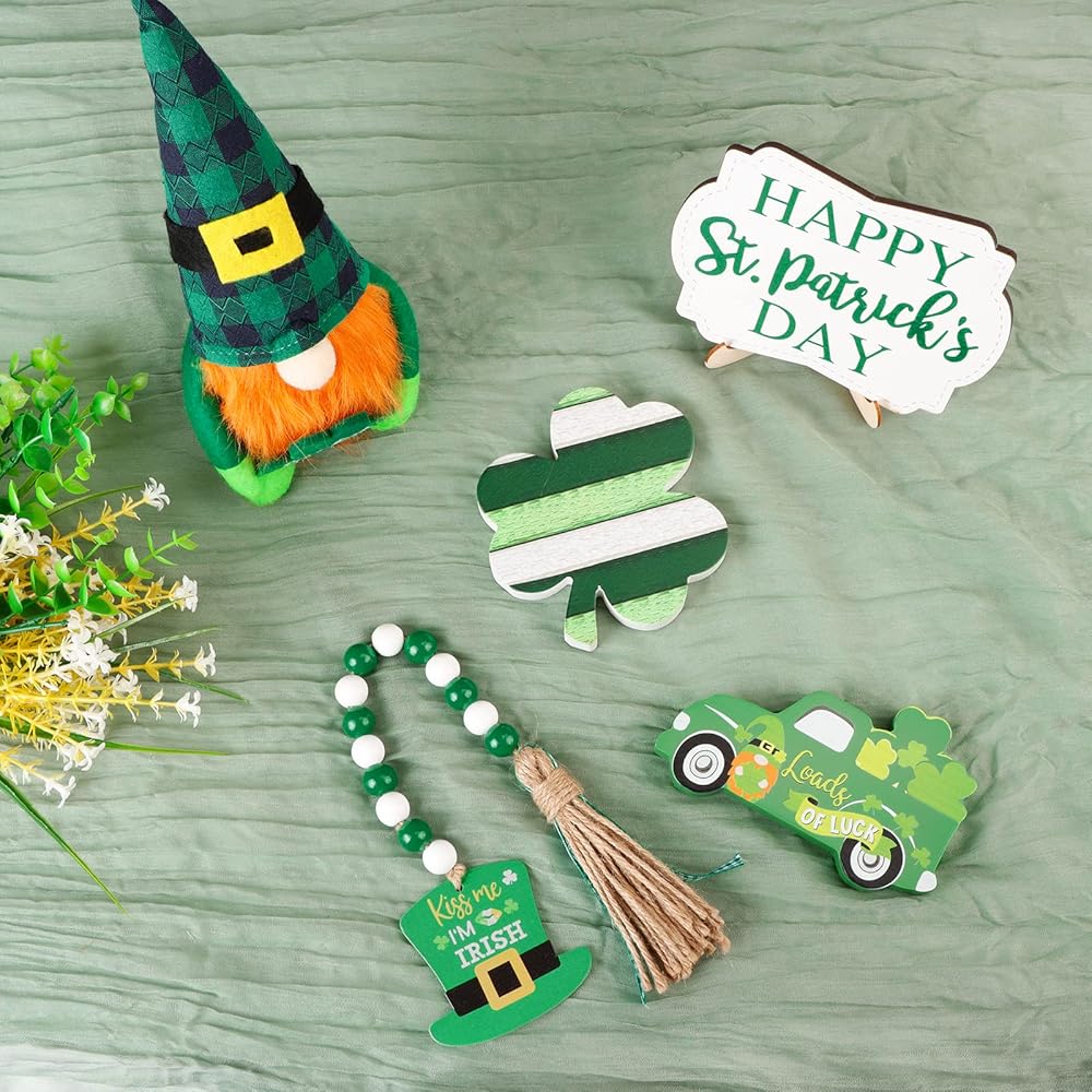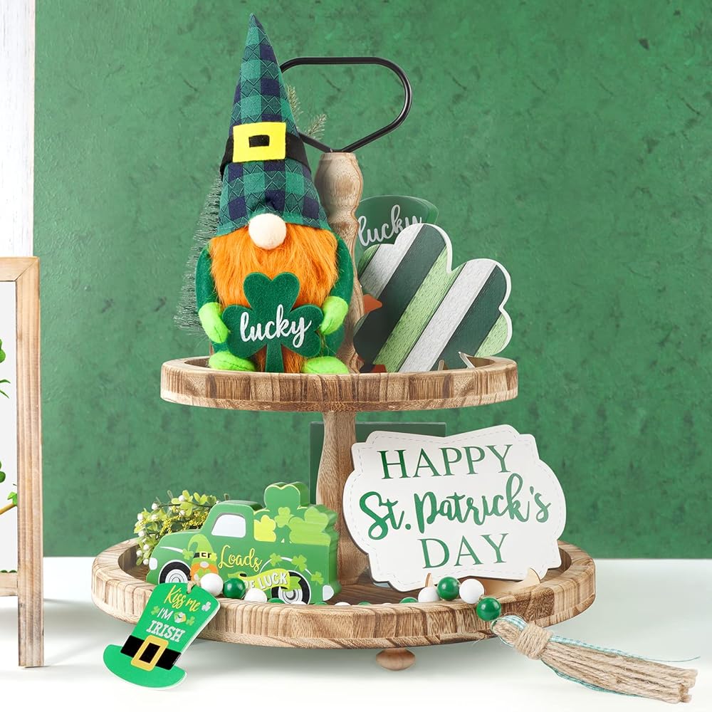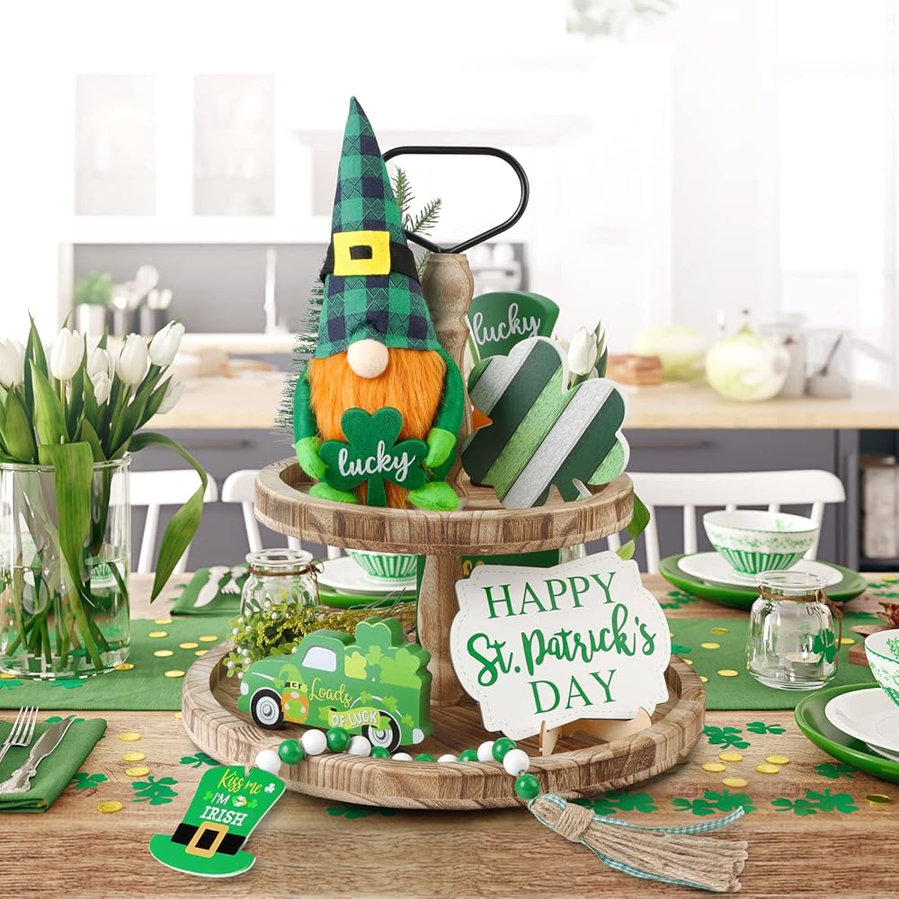 صينية ديكور ذات طبقات لعيد القديس باتريك، مجموعة ديكورات عيد القديس باتريك مع اقزام قطيفة و3 لافتات خشبية واكليل خرز خشبي للمنزل (الصينية غير متضمنة)