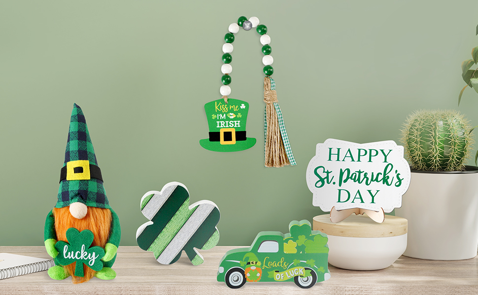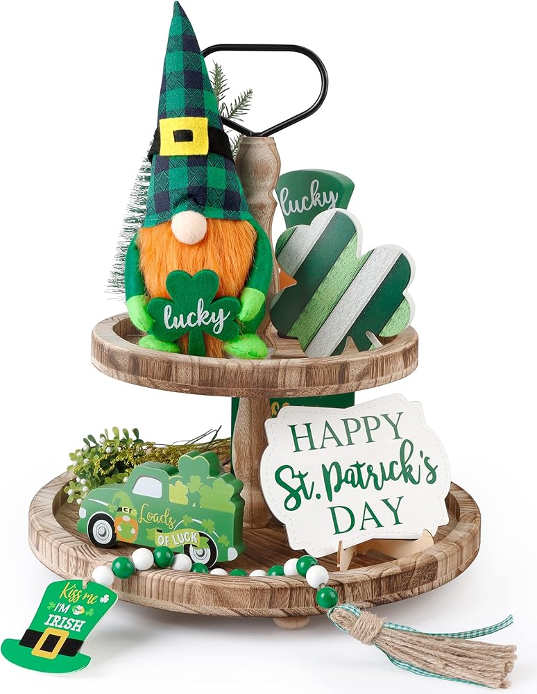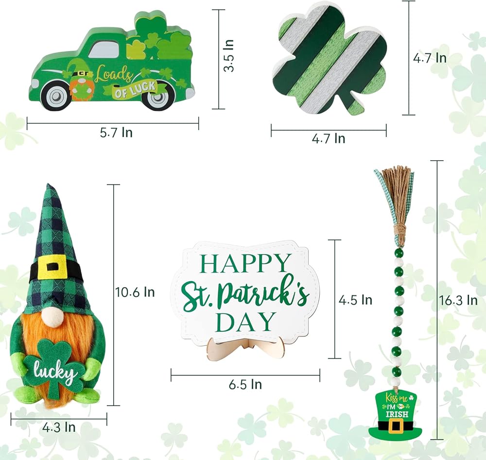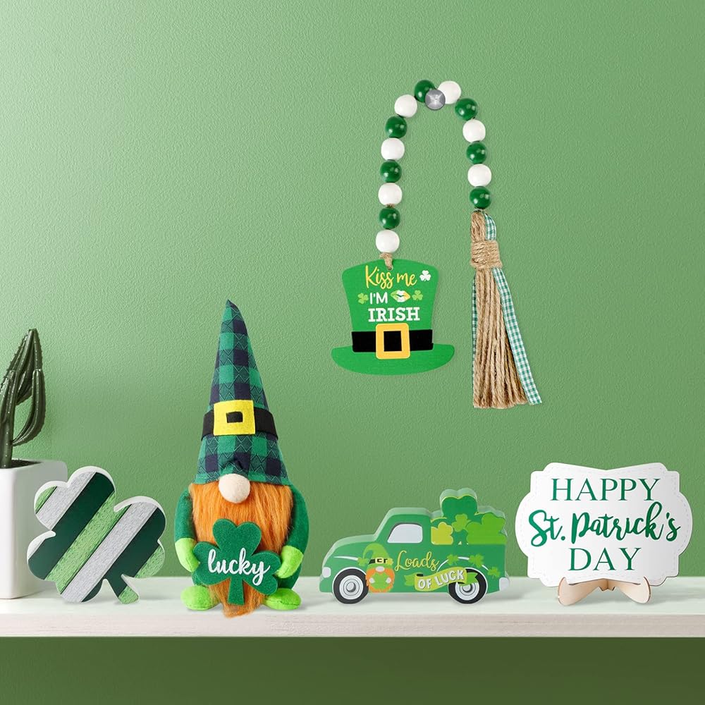 صينية ديكور ذات طبقات لعيد القديس باتريك، مجموعة ديكورات عيد القديس باتريك مع اقزام قطيفة و3 لافتات خشبية واكليل خرز خشبي للمنزل (الصينية غير متضمنة)