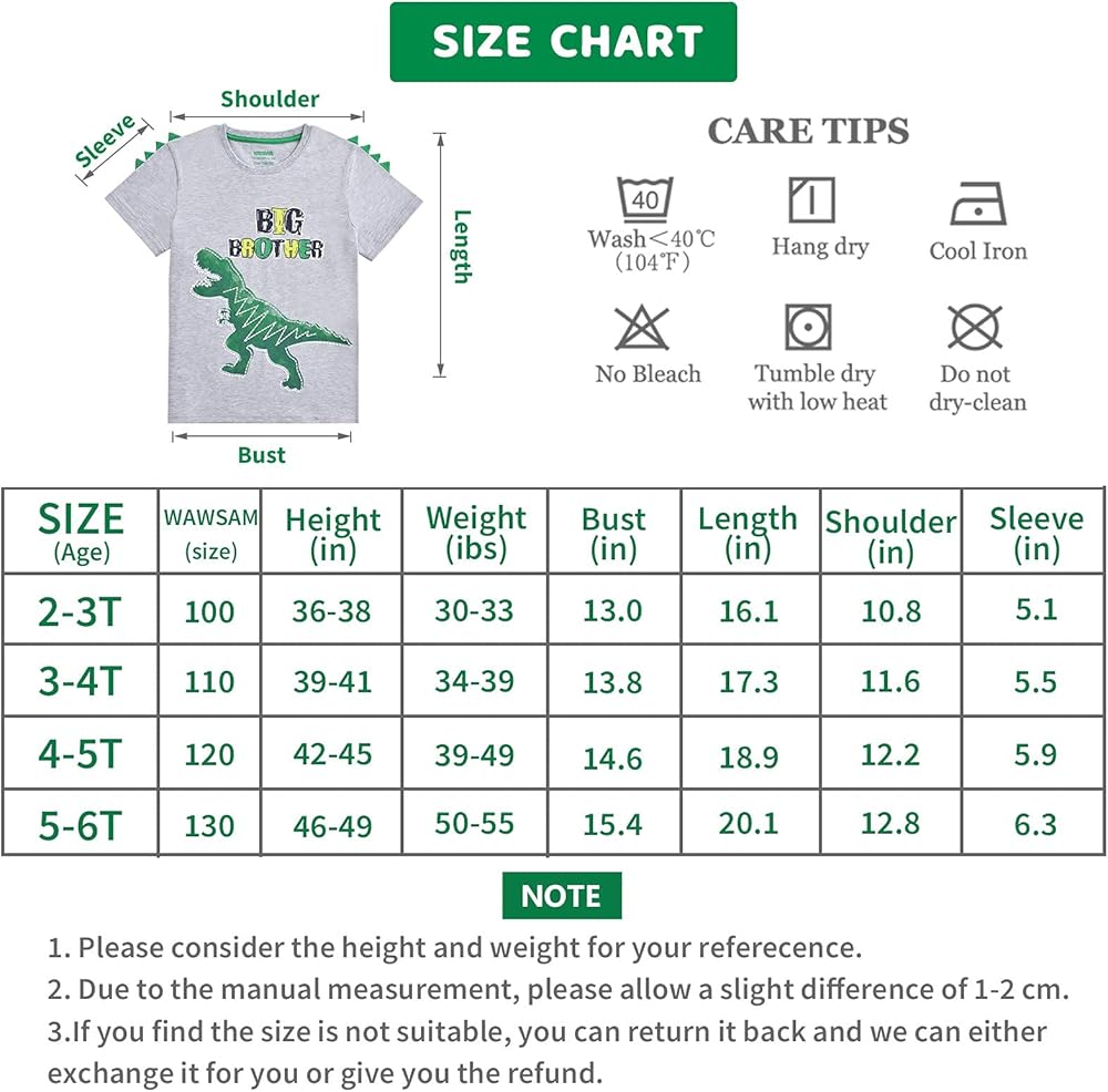 5-6T-- عرض الصدر: 15.4 بوصة، طول التيشيرت: 20 بوصة، الكتف: 12.5 بوصة، طول الكم: 6.3 بوصة. الارتفاع الموصى به: 46-129 سم.