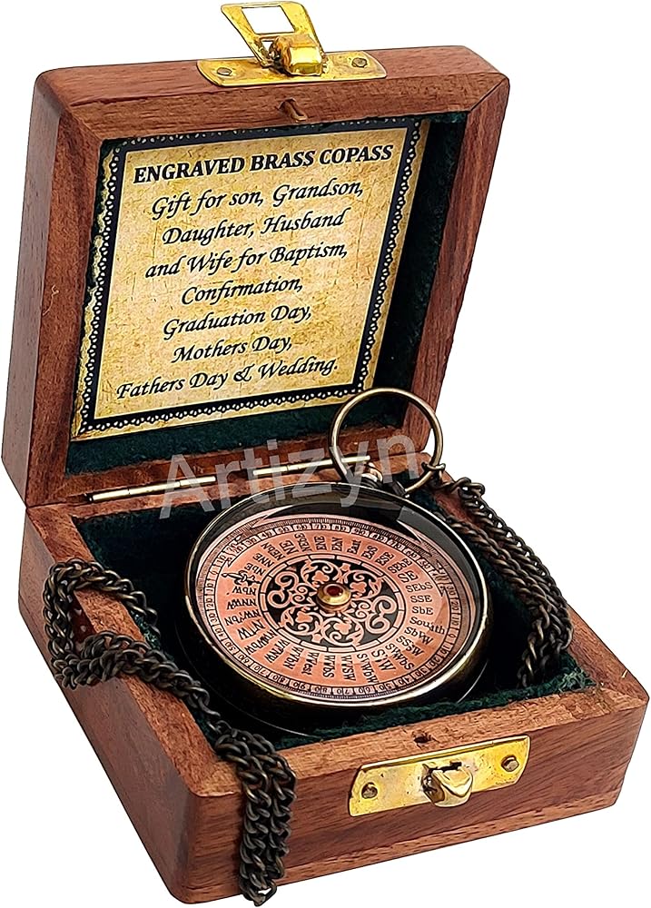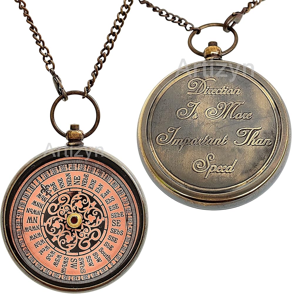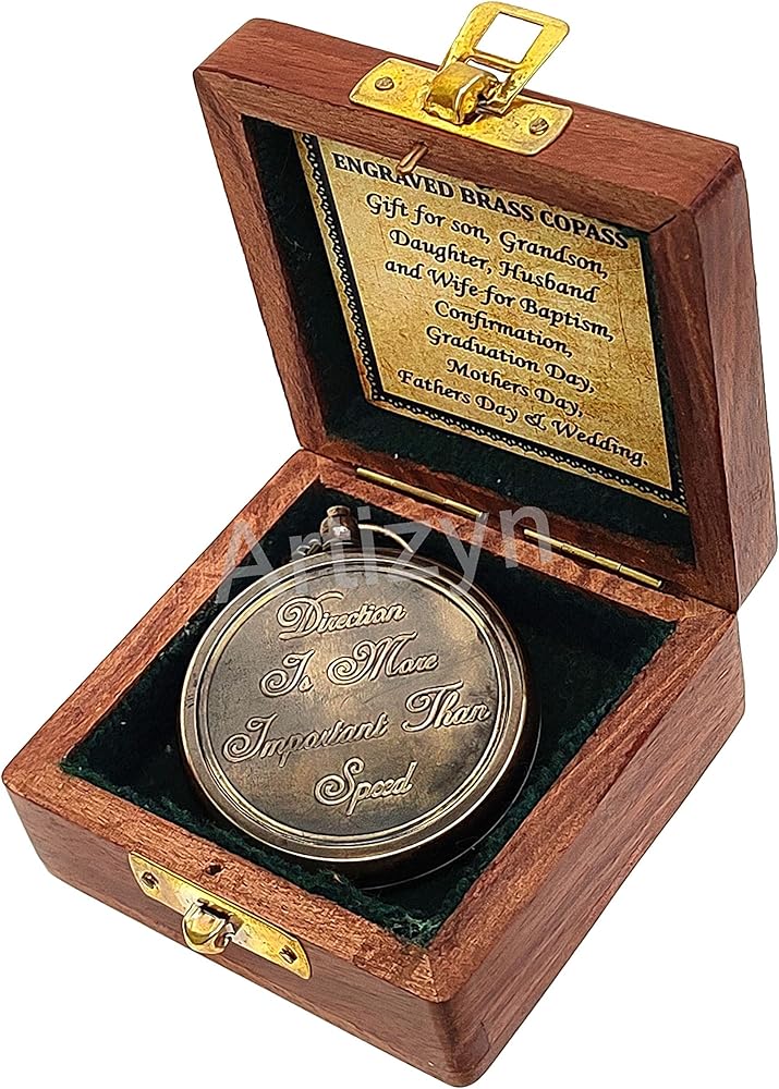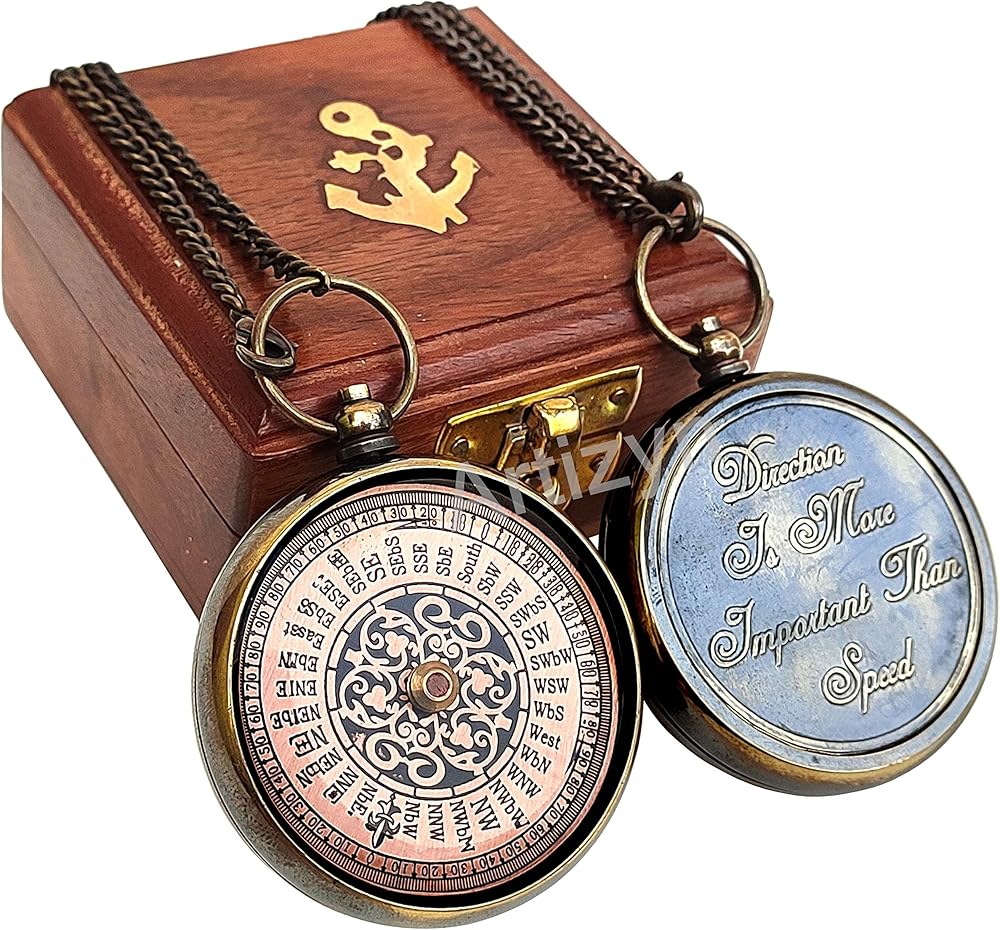 • LOCKET COMPASS : Antique brass compass is corrosion resist, packed in a good quality wooden storage box with 25 inches long chain & engraved with "Direction is More Important Than Speed" Quote. Detailed brass compass which will help you find and navigate your way to home.