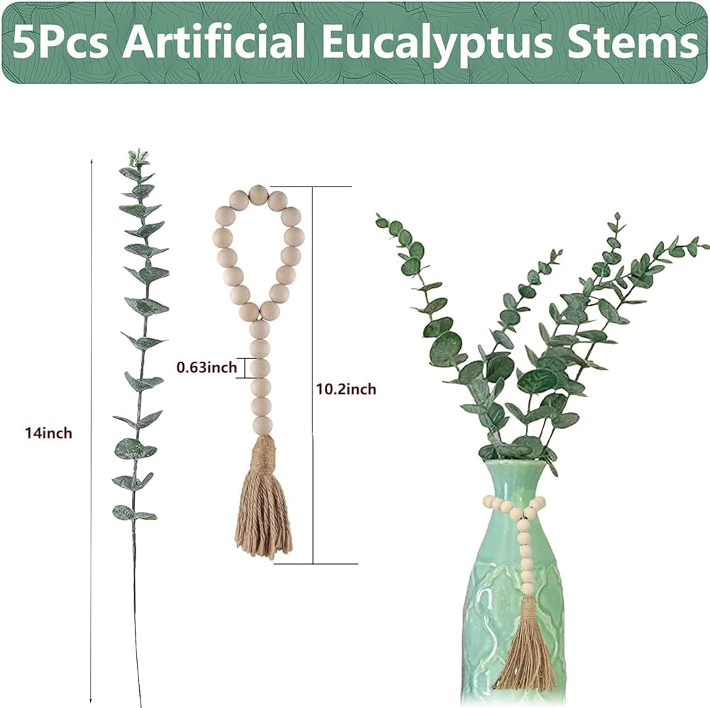 【المادة والكمية】- أوراق الأوكالبتوس مصنوعة من البلاستيك عالي الجودة والسيقان من سلك حديدي، يمكنك ثني الفرع بأشكال مختلفة. تحتوي كل عبوة على 5 قطع من سيقان الأوكالبتوس الصناعية مقاس 35.56 سم وقطعة واحدة من إكليل الخرز الخشبي، كل فرع من أغصان الأوكالبتوس يحتوي على حوالي 25 ورقة.