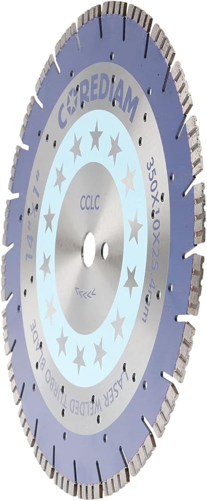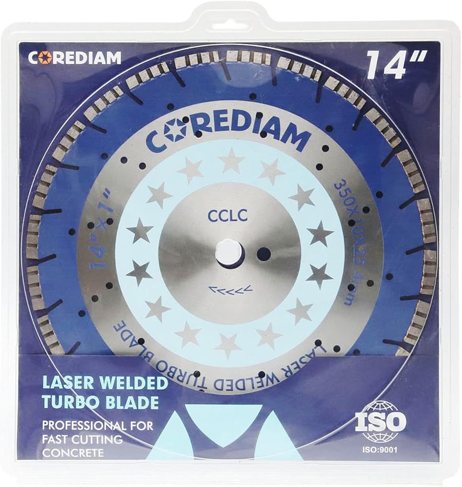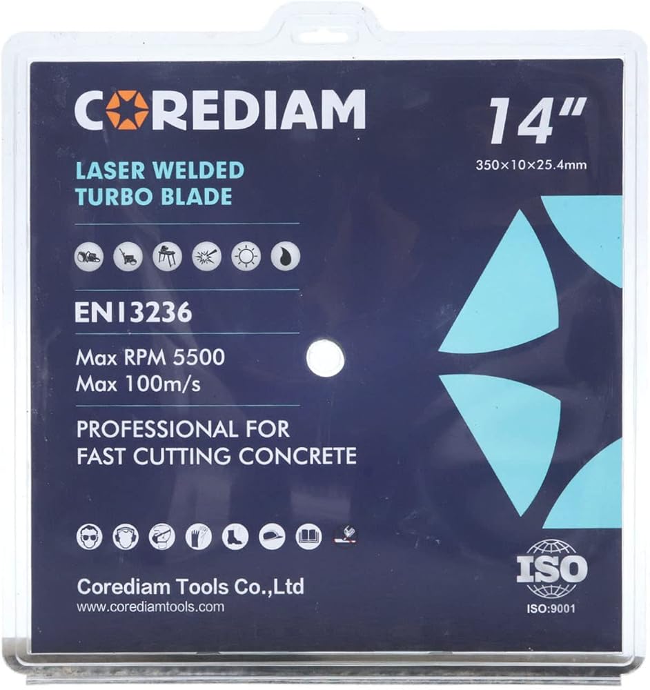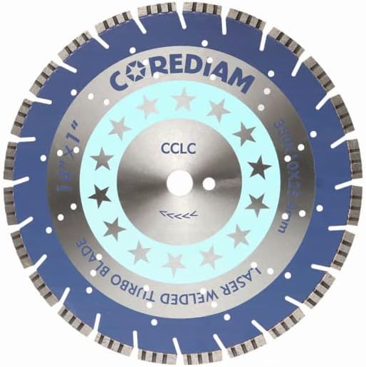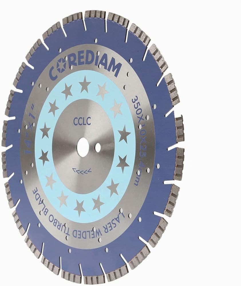 شفرة ماسية مقاس 14 بوصة من COREDIAM، شفرة سريعة ملحومة بالليزر مع ارتفاع قطعة 10 مم لقطع الخرسانة الخضراء والخرسانة الإسفلتية والمواد الكاشطة الأخرى، قطع رطب/جاف، 1 بوصة