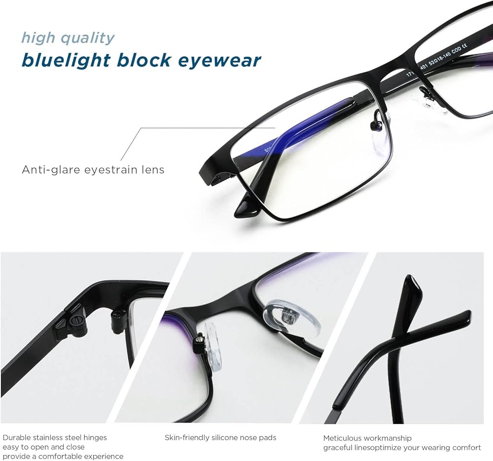 مادة عالية الجودة: الإطار المعدني مصنوع من مواد عالية الجودة، وهي خفيفة الوزن ومتينة، ولن تشعر بالتعب عند ارتداء النظارات الزرقاء الخفيفة لفترة طويلة.