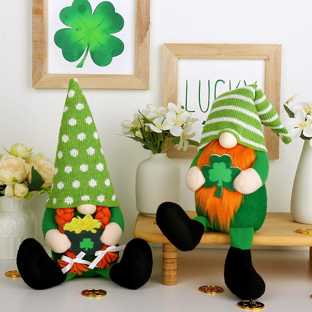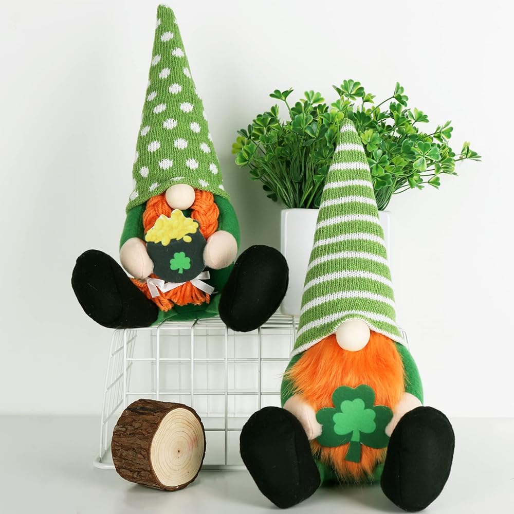 PACKAGE INCLUDES: You will get 2 pieces of St. Patrick's Day Irish leprechaun gnomes with wooden noses and big feet, 1 piece of gnome with polka dot knitted hat holding a pot of gold coins, 1 piece of gnome with striped pattern knitted hat holding a lucky shamrock. As a St Patricks Day centerpiece decorations set, add a happy festive atmosphere to your room decor.