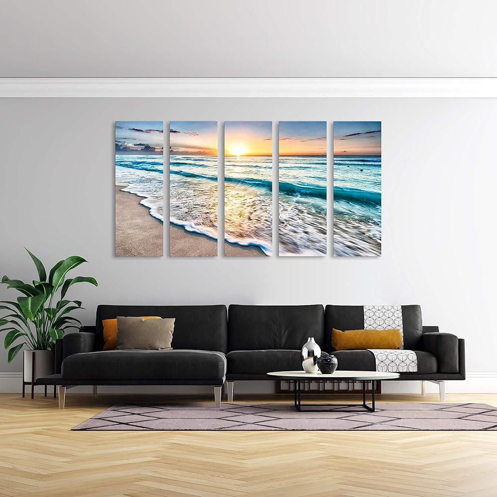 S02258 قماش يطبع جدار الفن شاطئ غروب الشمس المحيط طبيعة الصور امتدت ومؤطرة لوحات موجات زرقاء على قماش لغرفة المعيشة غرفة نوم المنزل مكتب ديكورات الجدار ديكور 12 × 32 بوصة × 5 قطع