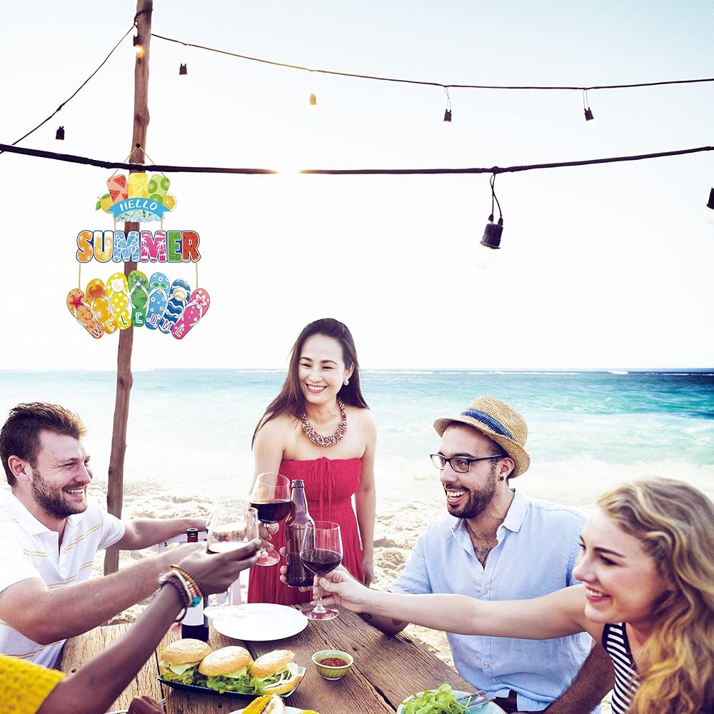 • Three Part Wreath: Embrace the season with our vibrant summer decorations for home! Our charming wreath consists of three parts that each embody the essence of summer. Featuring colorful ice cream, a wooden “SUMMER” sign cut-out embellished with Hawaiian style, and a wooden plate of summer beach slippers, complete with a "WELCOME" message.