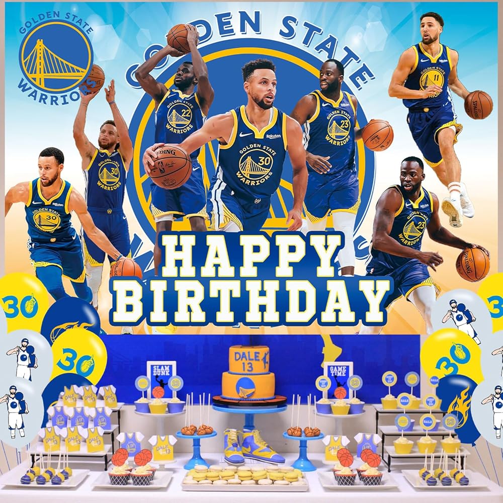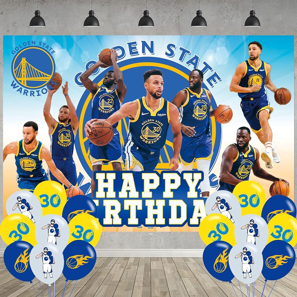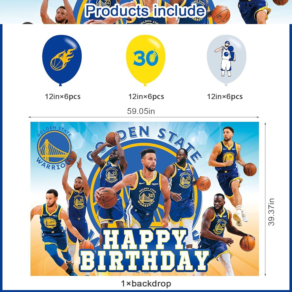 مقاس كرة السلة جولدن ستيت: 5 قدم (عرض) × 3 أقدام (ارتفاع)/150 سم × 100 سم، 18 قطعة من بالونات حفلات كرة السلة جولدن ستيت.