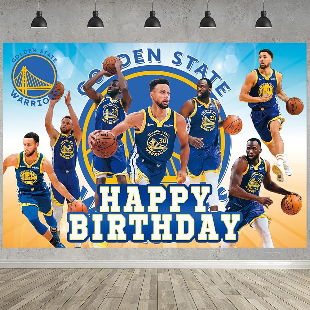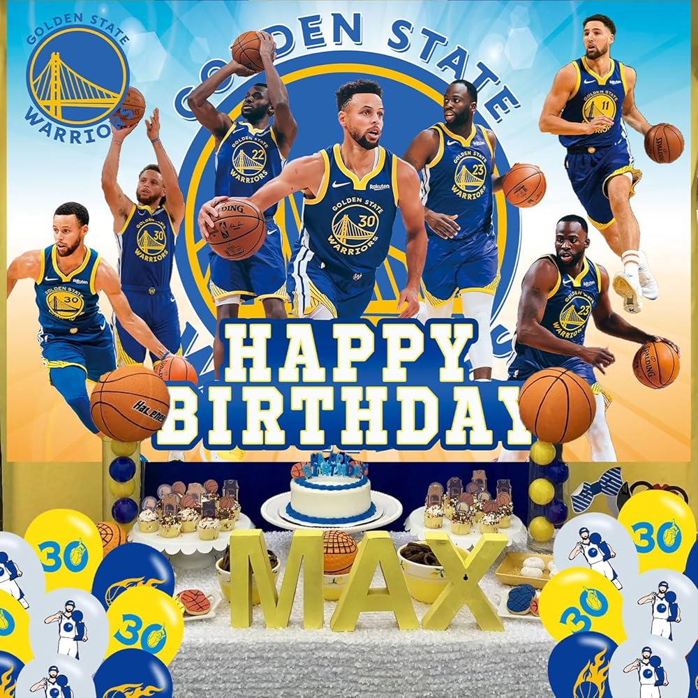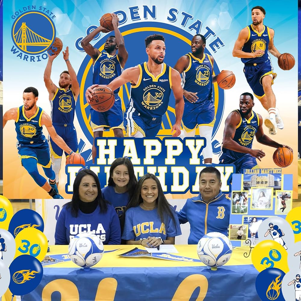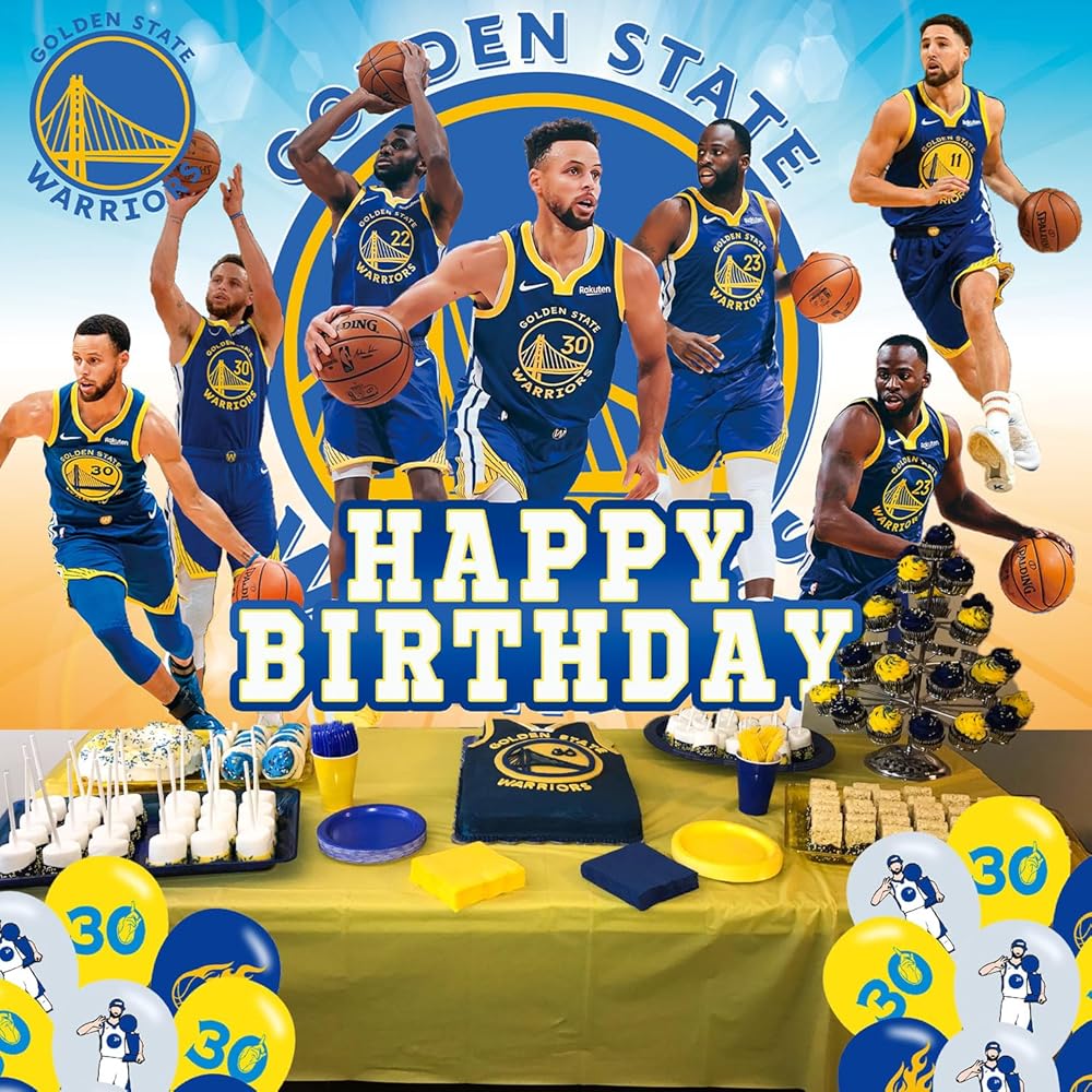 مقاس كرة السلة جولدن ستيت: 5 قدم (عرض) × 3 أقدام (ارتفاع)/150 سم × 100 سم، 18 قطعة من بالونات حفلات كرة السلة جولدن ستيت.