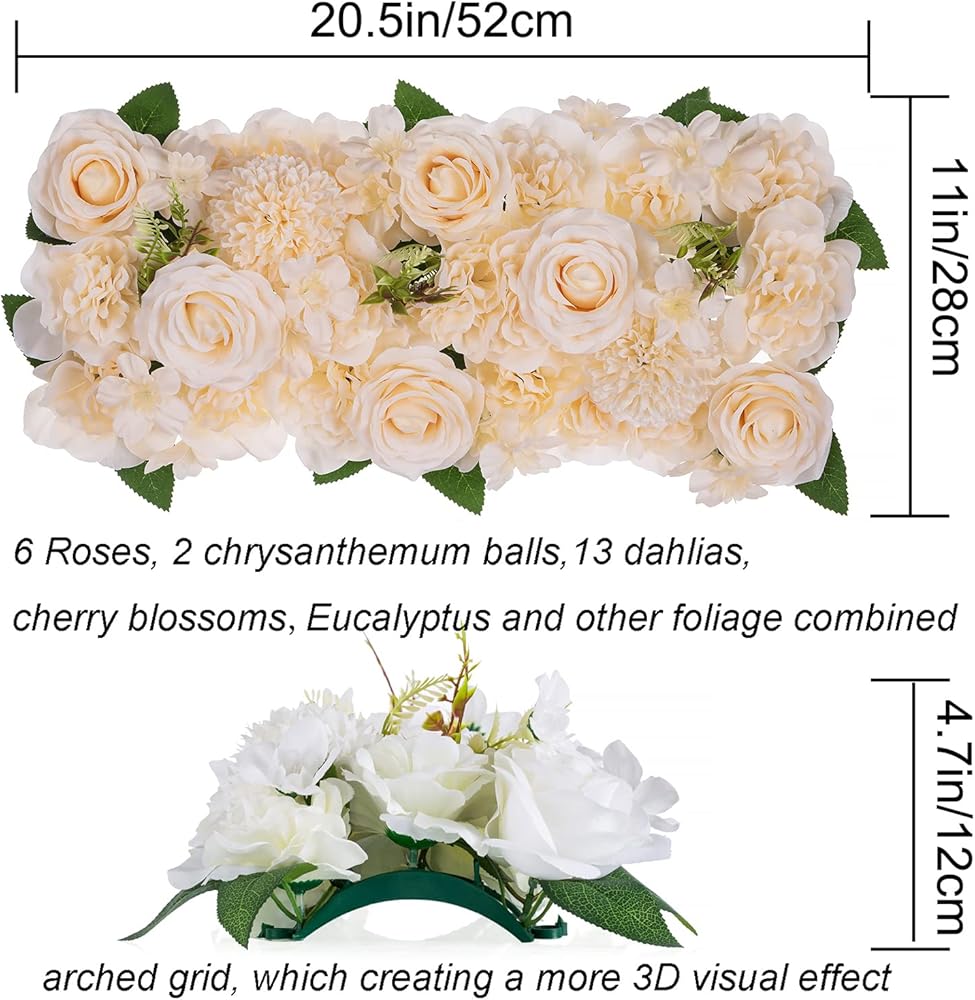 • تصميم فريد: يبلغ مقاس ألواح الزهور الخاصة بنا 20.5 بوصة (طول) × 11 بوصة (عرض) × 4.7 بوصة (ارتفاع). يبلغ عرض ألواح الزهور الشائعة حوالي 2/3، مما يظهر شكل مستطيل متخصص. ومع ذلك فإن الارتفاع تقريبًا مرتين منها بفضل تصميمها الفريد من نوعه للشبكة المقوسة، مما يخلق تأثيرًا بصريًا ثلاثي الأبعاد. وبالتالي، فإن الزهور الاصطناعية أكثر حيوية وتفتحًا. هناك نباتات فاخرة: 6 ورود كبيرة، كرتان أقحوان، 14 زهرة أضاليا، العديد من الكرز أزهار والعديد من أوراق الأوكالبتوس وأوراق الشجر الخضراء الأخرى.