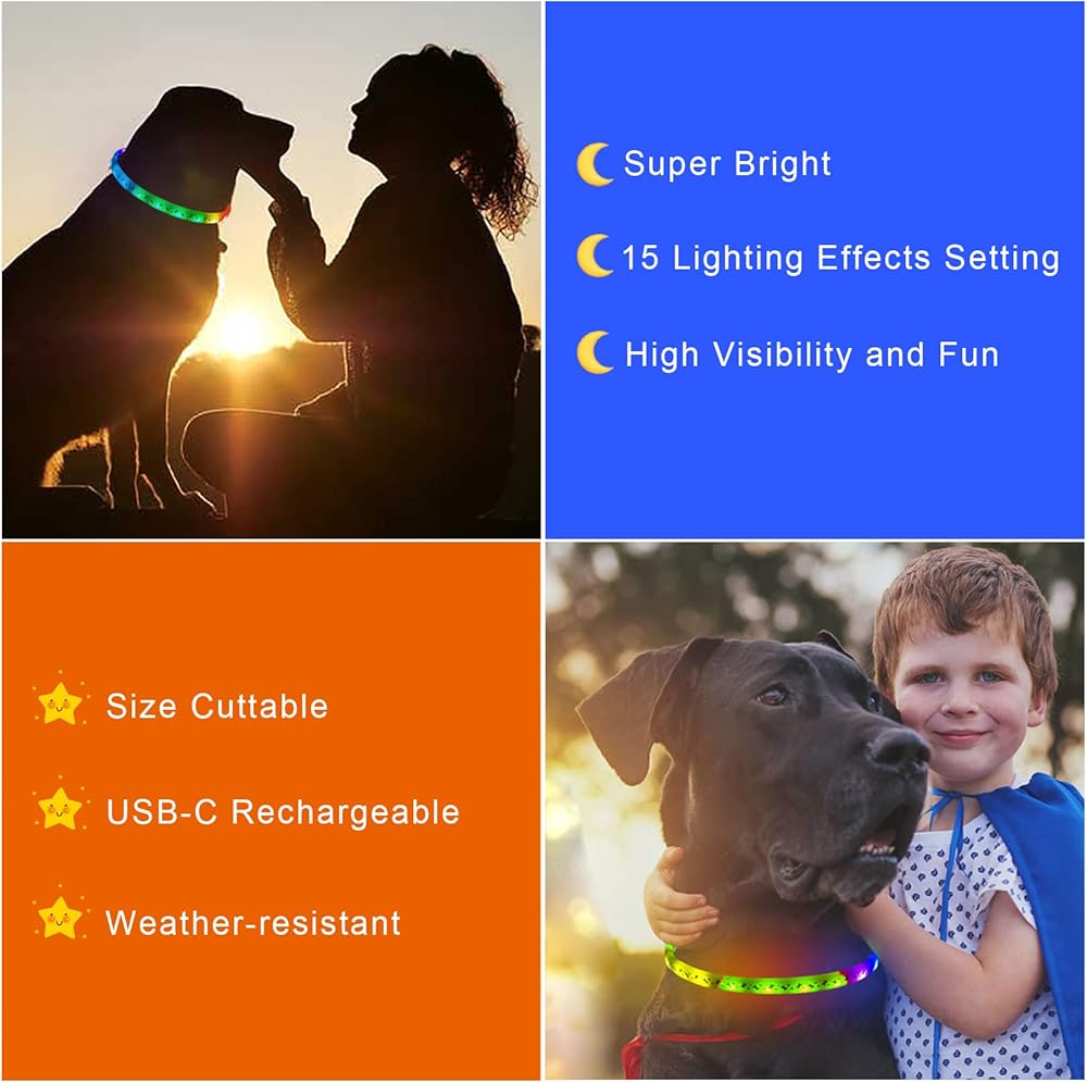 【شحن لمدة ساعة واحدة يعمل لمدة تصل إلى 8 ساعات】يعمل طوق الكلب المحدث القابل لإعادة الشحن عبر USB-C في الظلام على جعل الشحن أكثر ملاءمة من طريقة USB الصغيرة القديمة. يمكن أن تستمر ساعة واحدة من الشحن لمدة 6-8 ساعات للوميض (يتضمن كابل USB)