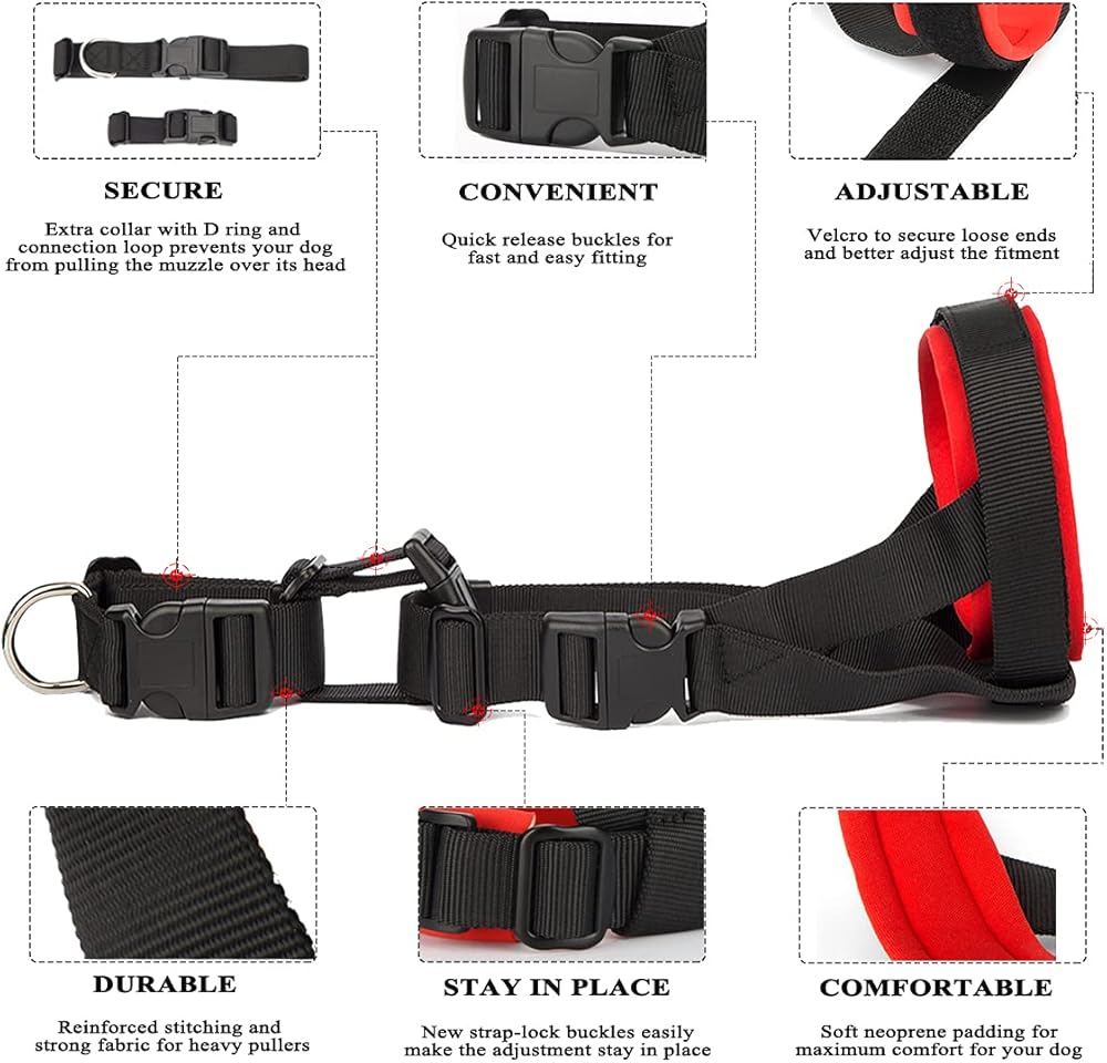 • قابل للتعديل وآمن: تم تصميم جزء الخطم بخطاف وحلقة، والتي يمكن تعديلها للبقاء بشكل جيد وملائم بشكل مريح. ليس لدى الكلاب أي مشكلة في ارتدائها لفترات طويلة. توجد أبازيم سريعة الفك على حزام الرقبة والطوق، لذلك يمكنك تعديلها بحرية للحصول على ملاءمة مثالية. بعد وضع بلح البحر على كلبك، لا يزال من الممكن فتح فم الكلب قليلًا ولكن ليس بإحكام حتى لا يضغط على خطم الكلب بقوة.