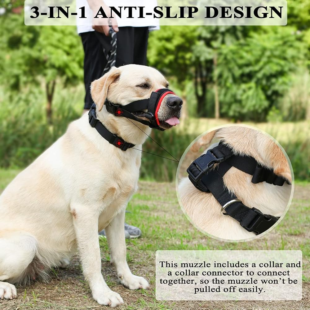 • تصميم 3 في 1 مضاد للانزلاق: لماذا تختارنا؟ تأتي هذه الكمامة الناعمة للكلاب مع طوق للكلاب وموصل مناسب. ليس عليك أن تهتم بكيفية توصيل الكمامة بالياقة بعد الآن. إن واقي فم الكلب المتصل بالطوق سيجعل من الصعب السقوط.