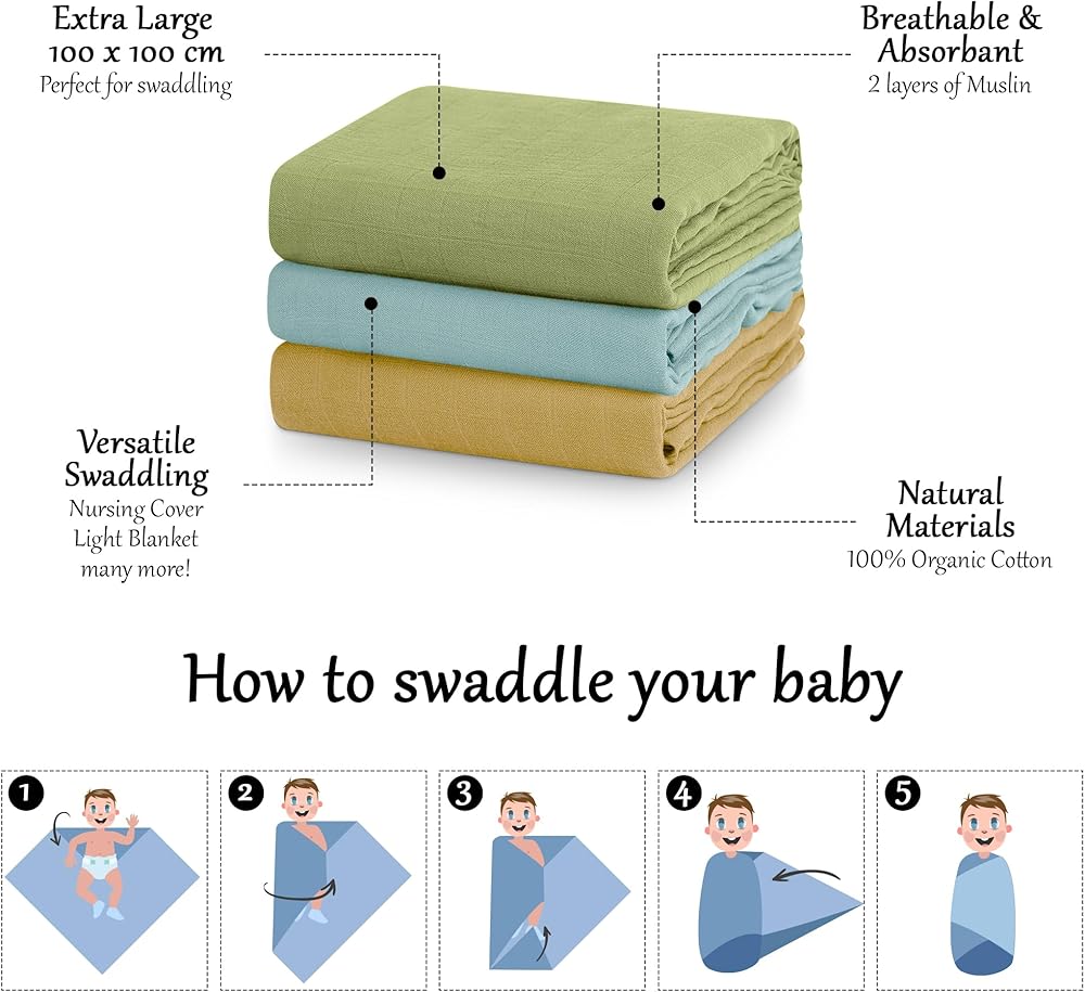 SOFT, MACHINE WASHABLE - Contains 3 Prewashed, Generously Sized (100*100cm) Muslin Swaddle Blankets that get Softer with Every Wash.
