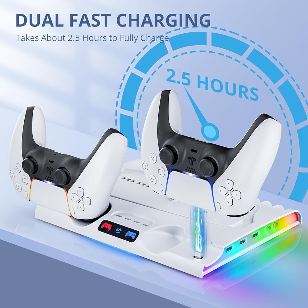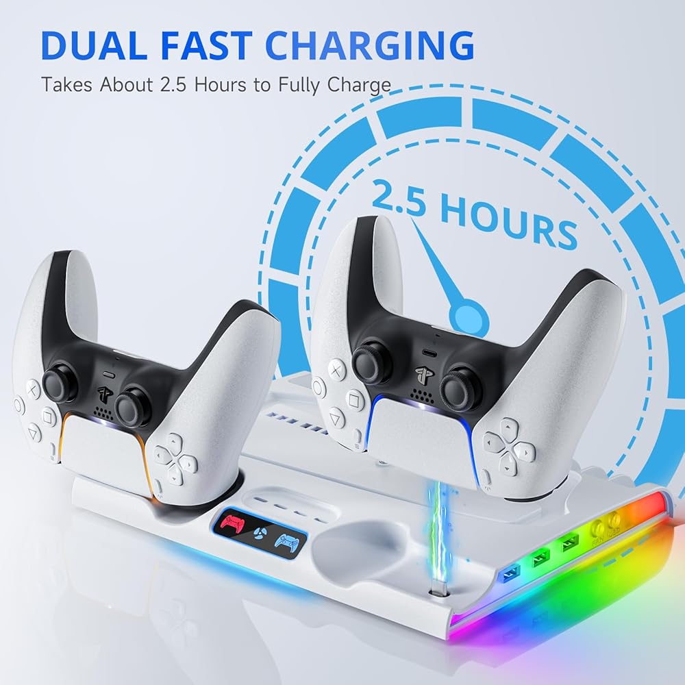 【وحدات تحكم مزدوجة سريعة و3 منافذ USB】مع منافذ شحن وحدة التحكم المزدوجة، يمكن لمحطة الشحن شحن 2 P5 DualSense أو وحدات التحكم الأصلية بالكامل خلال 2.5 ساعة. بالإضافة إلى ذلك، تحتوي محطة الشحن على 3 منافذ USB لنقل البيانات وتوصيل الأجهزة الأخرى مثل الماوس أو لوحة المفاتيح.