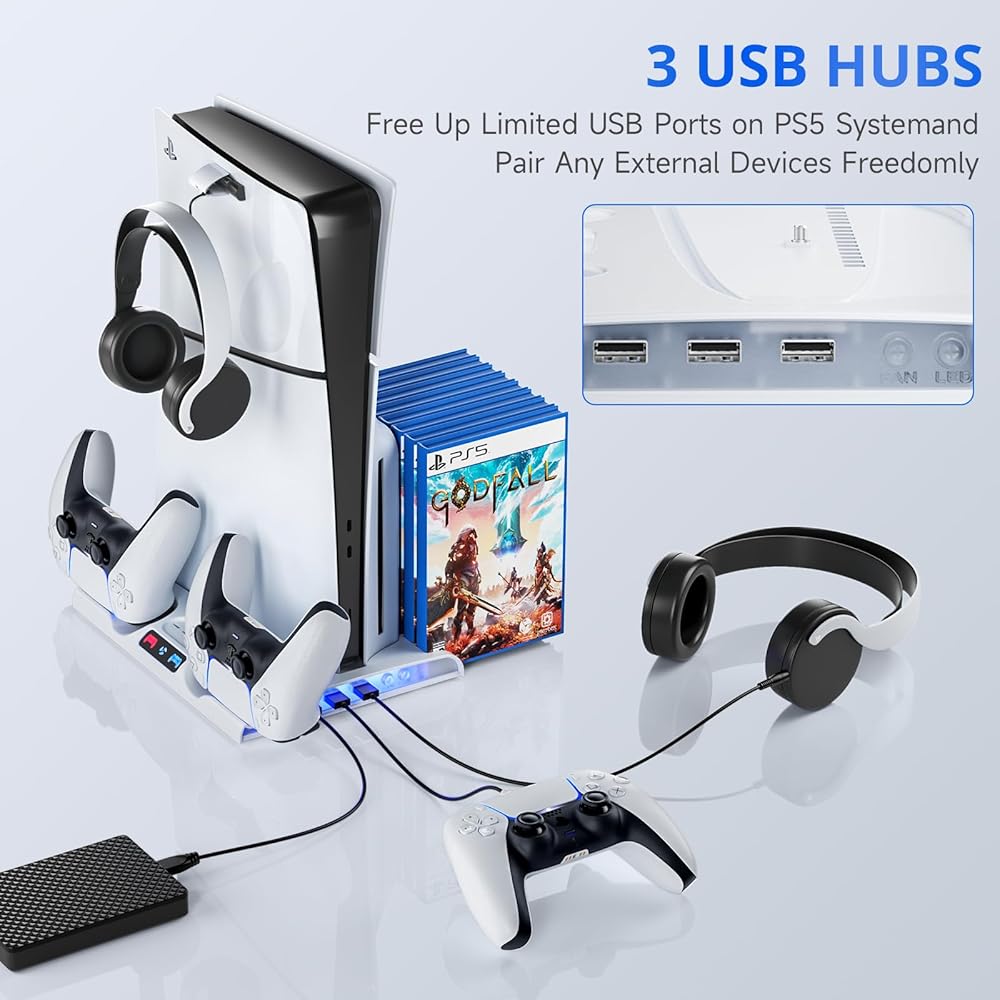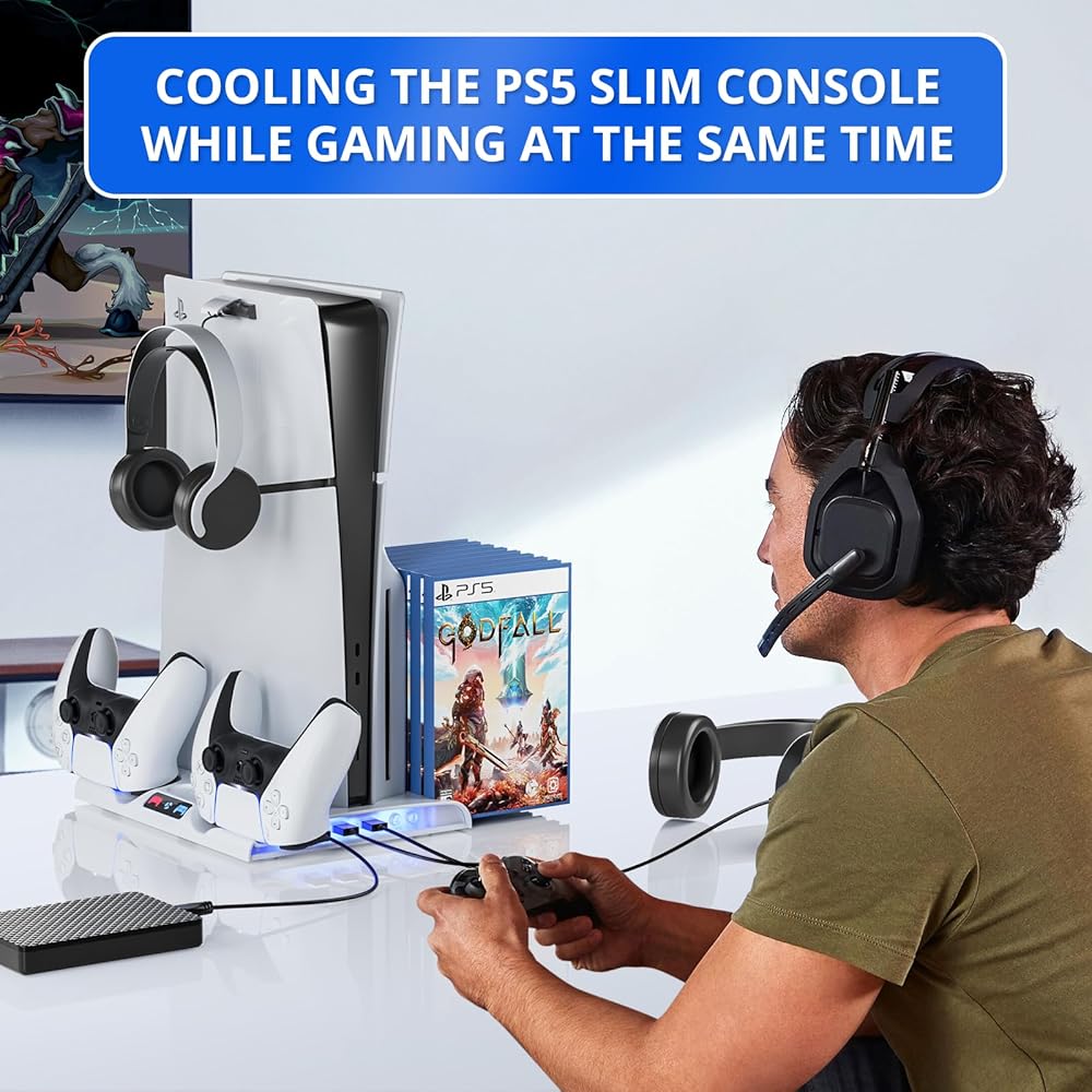 حامل BRHE الجديد لجهاز PS5 النحيف مع محطة شحن وحدات التحكم، ومحطة تبريد لوحدة التحكم الرقمية / القرص النحيف PS5، وملحقات PS5 النحيفة مع مراوح التبريد و8 قطع لتخزين الألعاب لجهاز Playsation 5 Slim (أبيض)