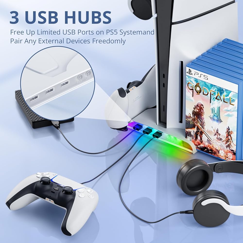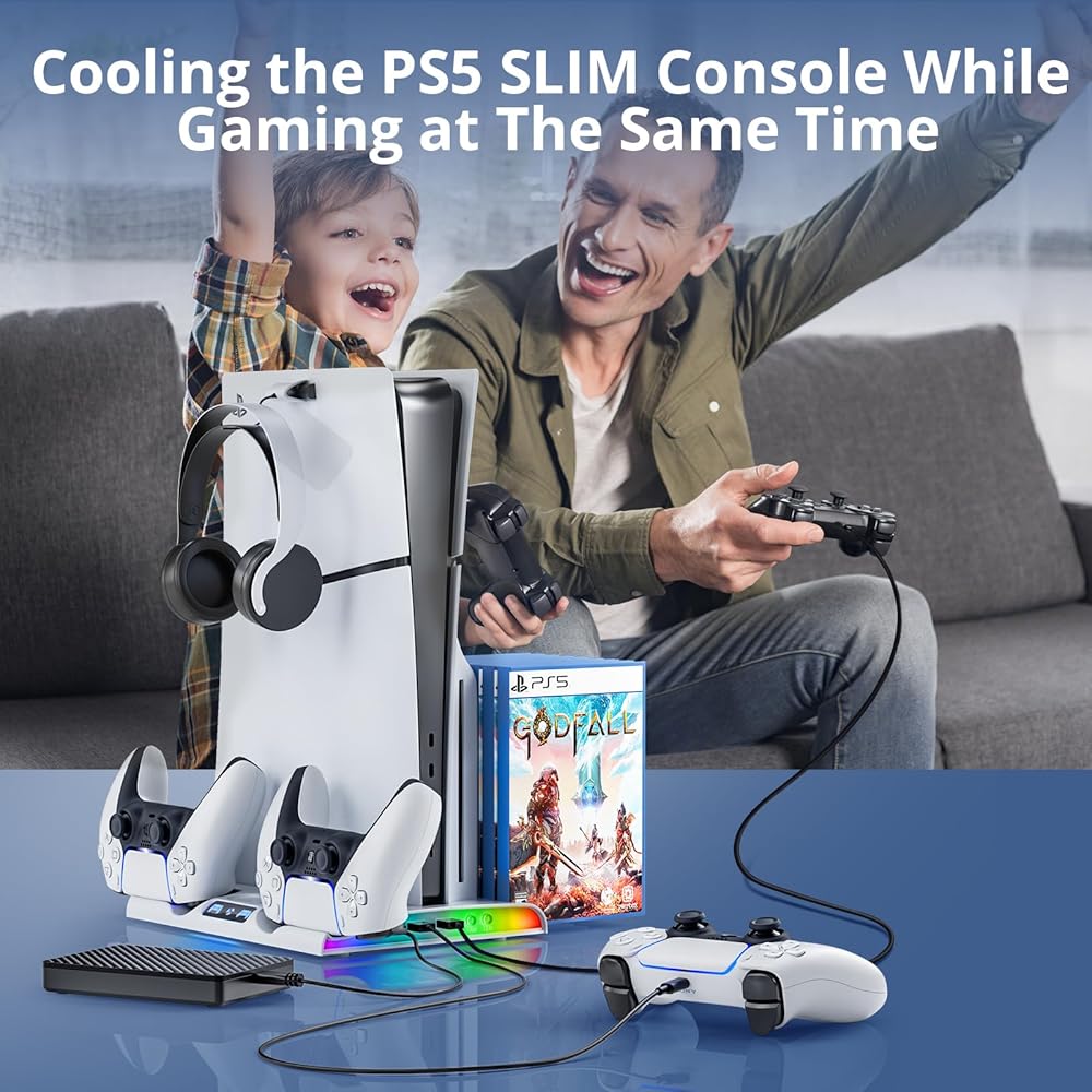 【حامل شحن RGB لوحدة التحكم PS5 Slim】: مصمم خصيصًا لإصدار PlayStation5 Slim الرقمي والأقراص، مع مروحة تبريد شفط عالية الكفاءة، وشاحن وحدة تحكم مزدوجة، ومؤشر شحن LED، و3 منافذ USB، ومؤشر الطاقة، و8 أقراص تخزين للألعاب.