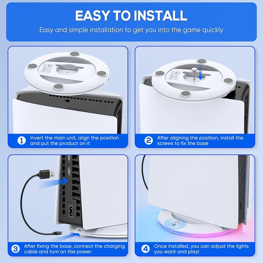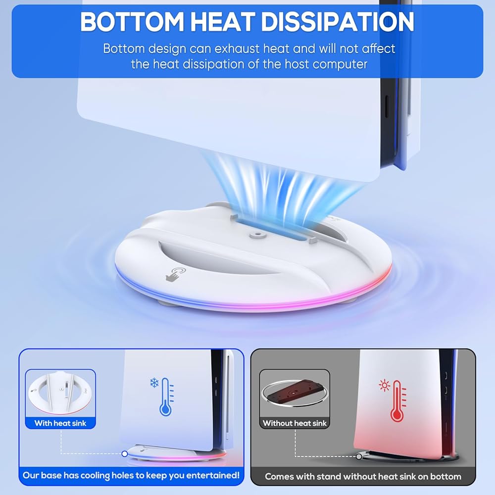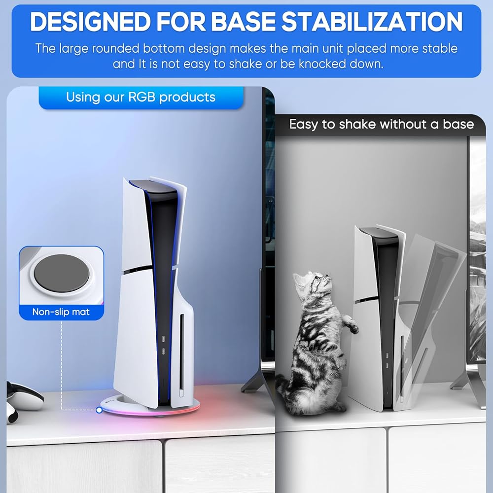الحامل متوافق مع بلاي ستيشن 5 سليم ديسك/الإصدار الرقمي، يمكنك وضعه عموديًا بدون إطار، يقوم الحامل بعمل جيد في منع الانزلاق والإمالة بفضل البطانة المطاطية في الأسفل (ليس لجهاز بلاي ستيشن 5 القديم)