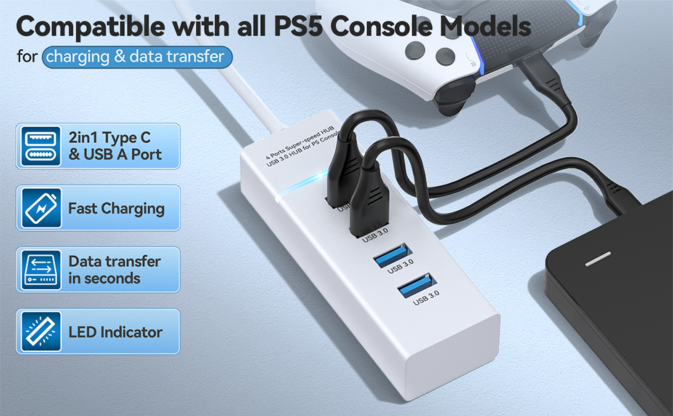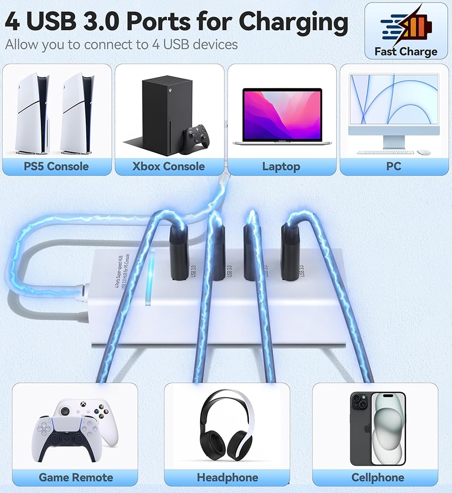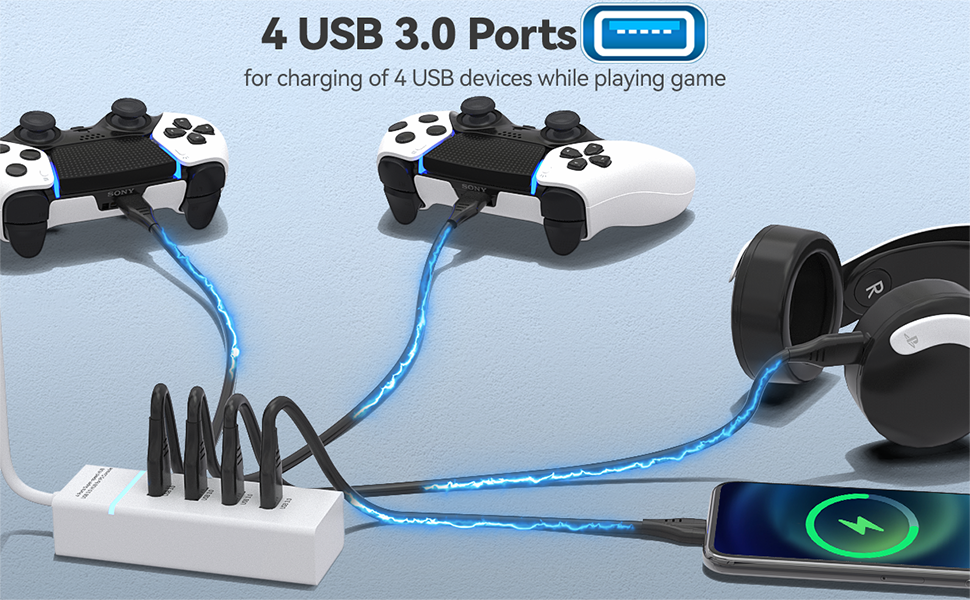 【موزع USB PS5 مع شحن سريع ونقل التاريخ】4 منافذ USB مدمجة لمزامنة البيانات بسرعات عالية تصل إلى 5 جيجابت في الثانية، محور USB رفيع للغاية مصمم لأربعة وحدات تحكم Playstation 5. لا يدعم مقسم USB الخاص بنا نقل دارا فحسب، بل يوفر أيضًا 4 الأجهزة التي يتم شحنها في نفس الوقت، مثل لوحة المفاتيح والماوس والطابعة ومحركات الأقراص الثابتة والمزيد من أجهزة USB.