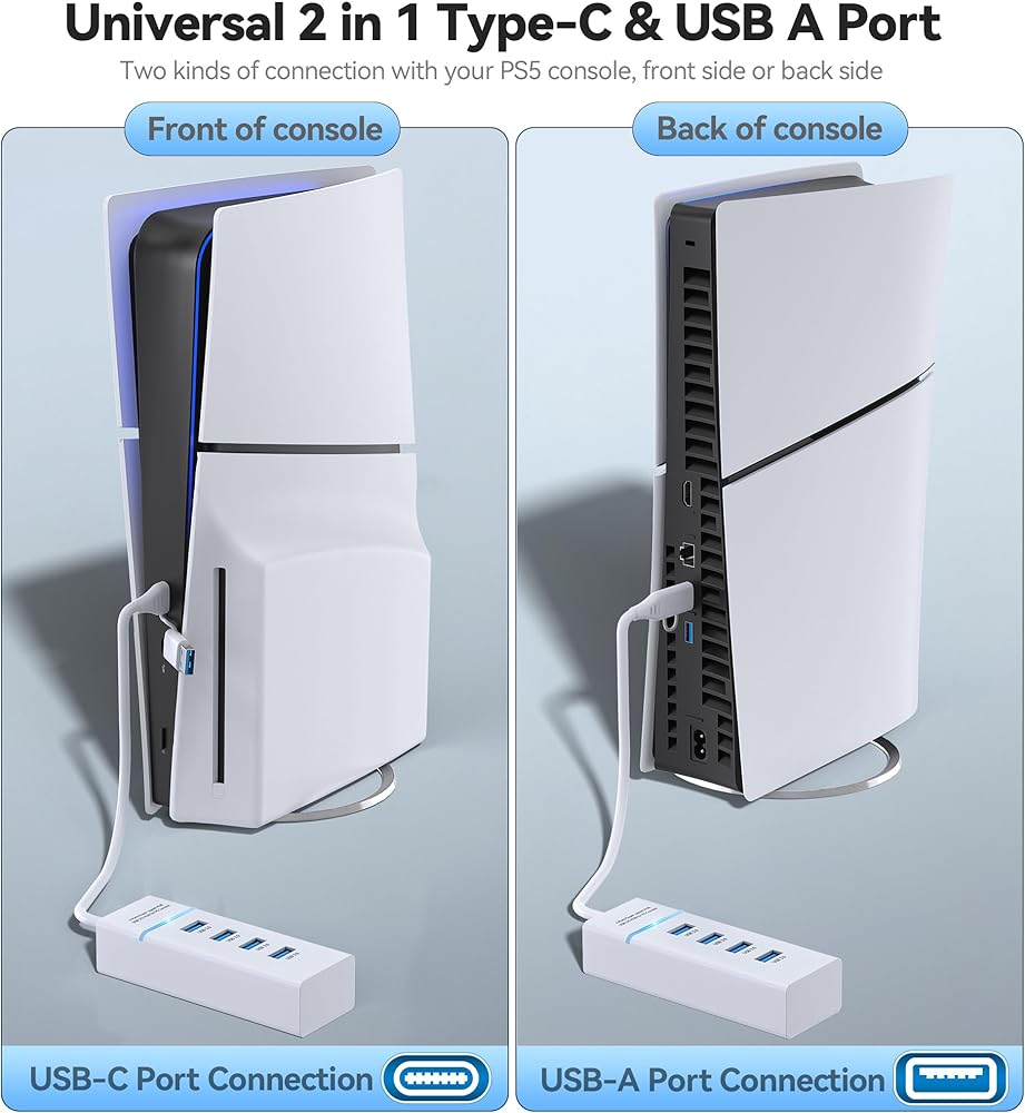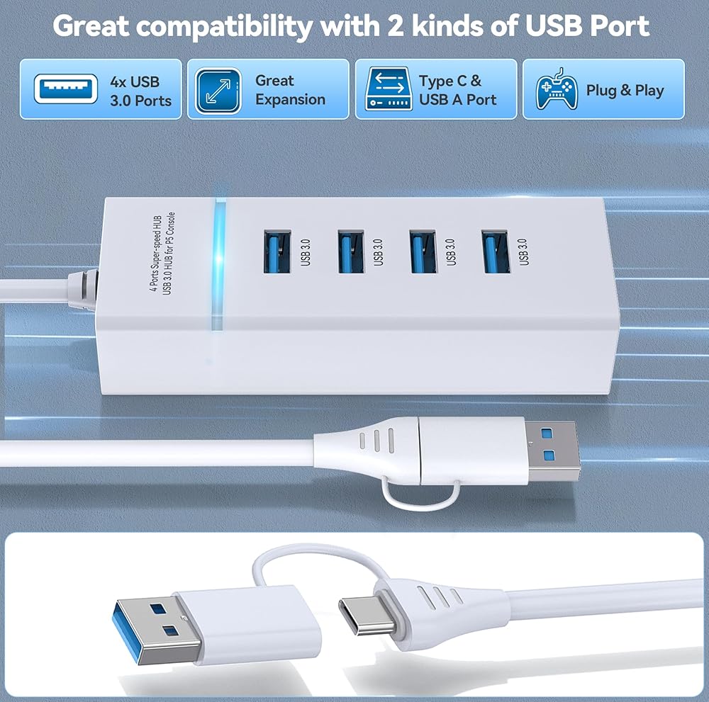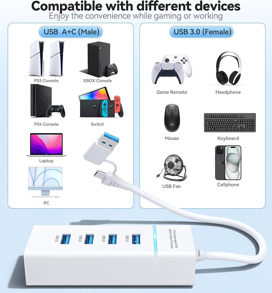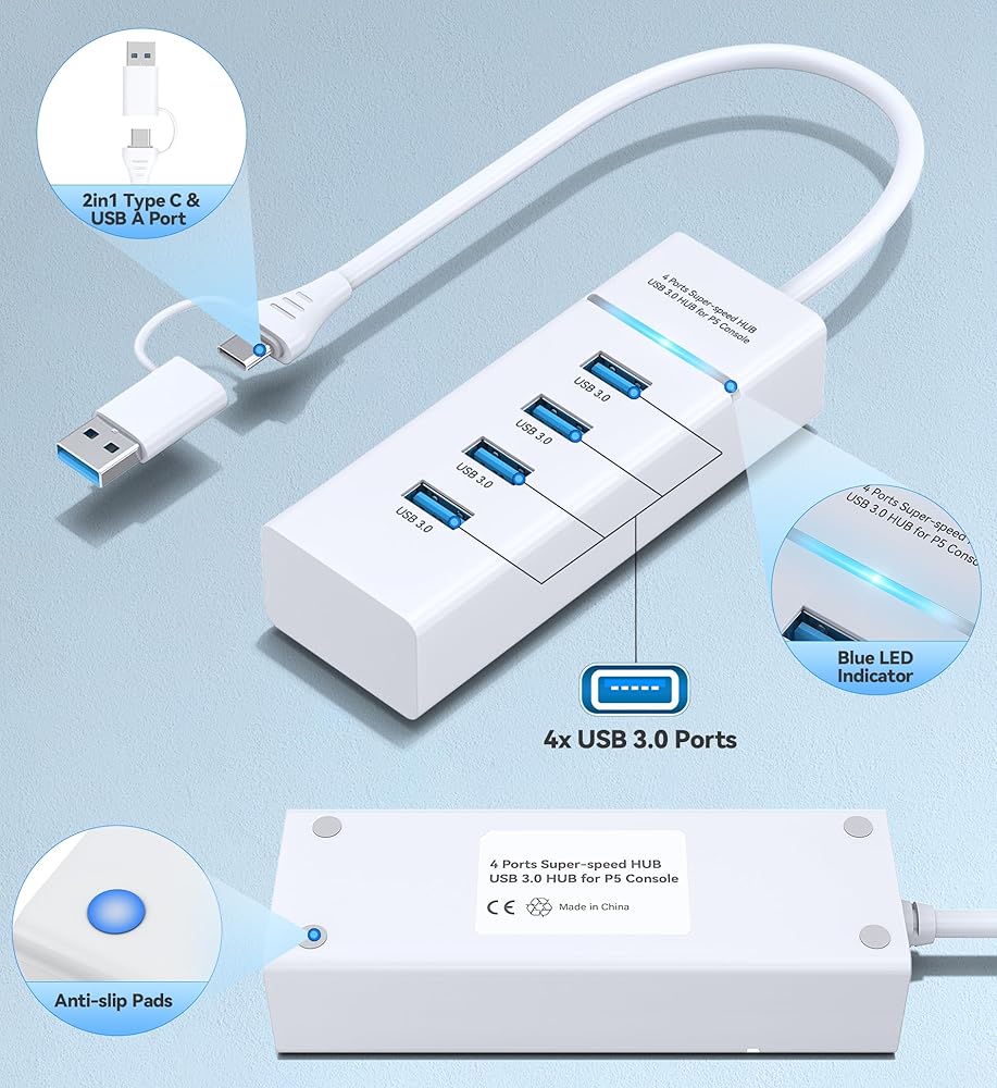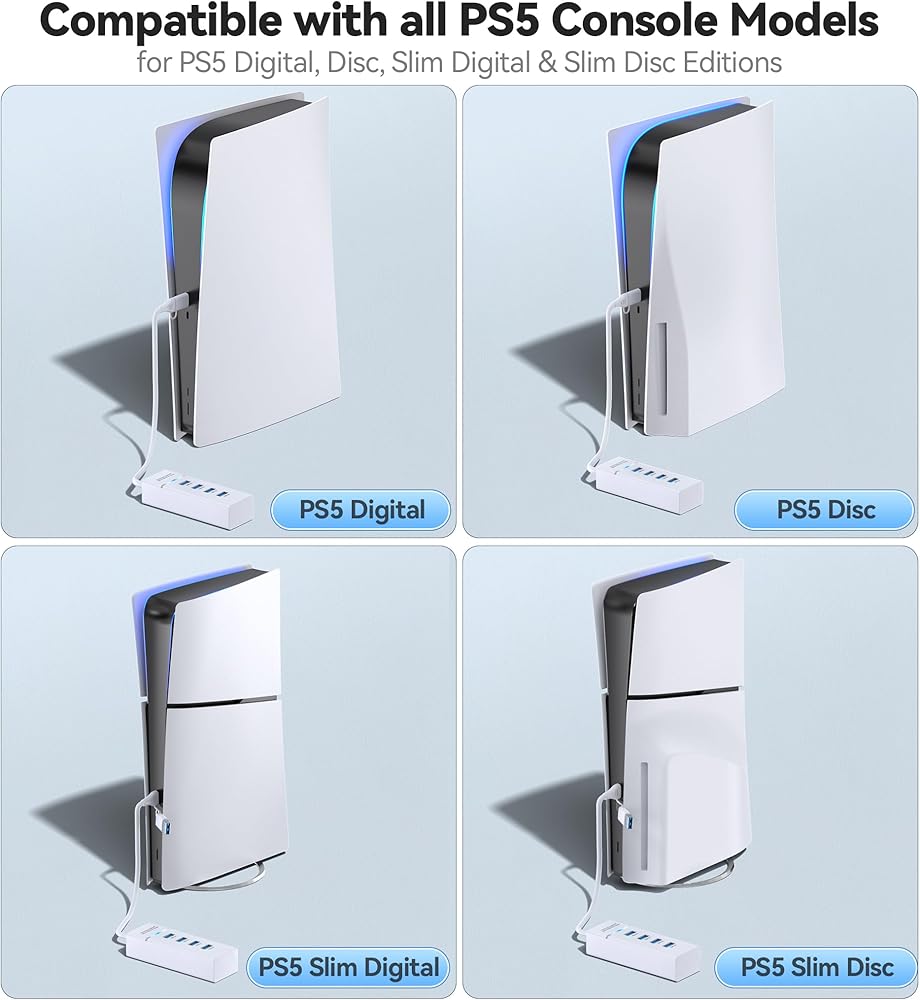 توافق واسع: يتوافق موسع محور PS5 USB C مع جميع وحدات تحكم أجيال PS5 (2023 PS5 SLIM و2020 PS5)، وجميع أنظمة الكمبيوتر الشخصي التي تعمل بنظام التشغيل Windows وMac OS وAndroid. ومتوافق مع أجهزة واجهة USB 3.0 مثل وحدة تحكم ps4، ومروحة USB، وقارئ البطاقات، ووحدة التحكم في الألعاب، والكاميرات الرقمية، وSurface Pro 3، وMacbook Pro، وMacbook Air، إلخ.
