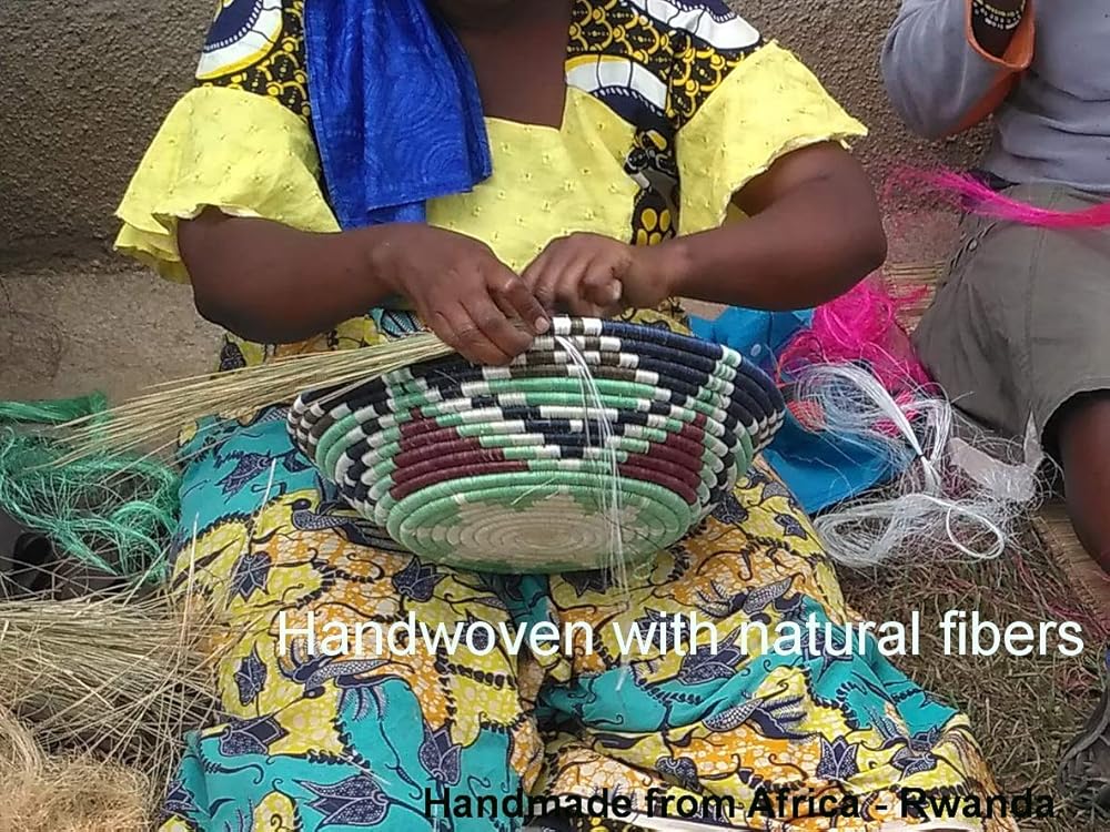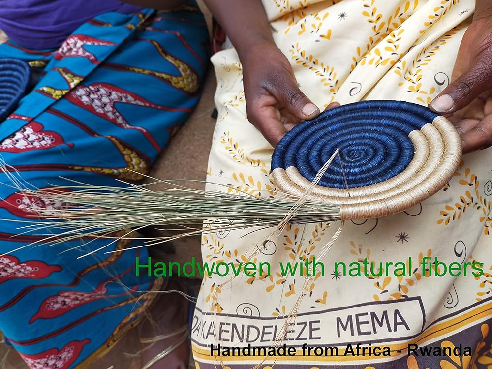 These trivets are handmade in Rwanda by our artisans team specialized in sisal and banana fiber baskets and trivets. For this pure handmade we use locally grown, renewable resources such as banana stalks (use to weave the external part of trivet) and banana leaves fibers (inside part of trivet). When start to get dry and turns golden, brown, banana stalks and leaves are selected by the artisan from local villages where naturally grows and transformed into this beautiful work of art. After the trivets are woven they are smoked over a coconut husk to obtain their golden brown color. This process leaves behind a smoky scent which will dissipate with time. It can be used as a table or furniture display, for dining table to protect from heat damage or as a original gift (definitely a hit of a gift). Approximately 11'' Diameter. Handmade from Africa | Authentic & Unique | Fair Trade Product | 100% Handmade with love, passion and pride | A great opportunity to support African Artisans.