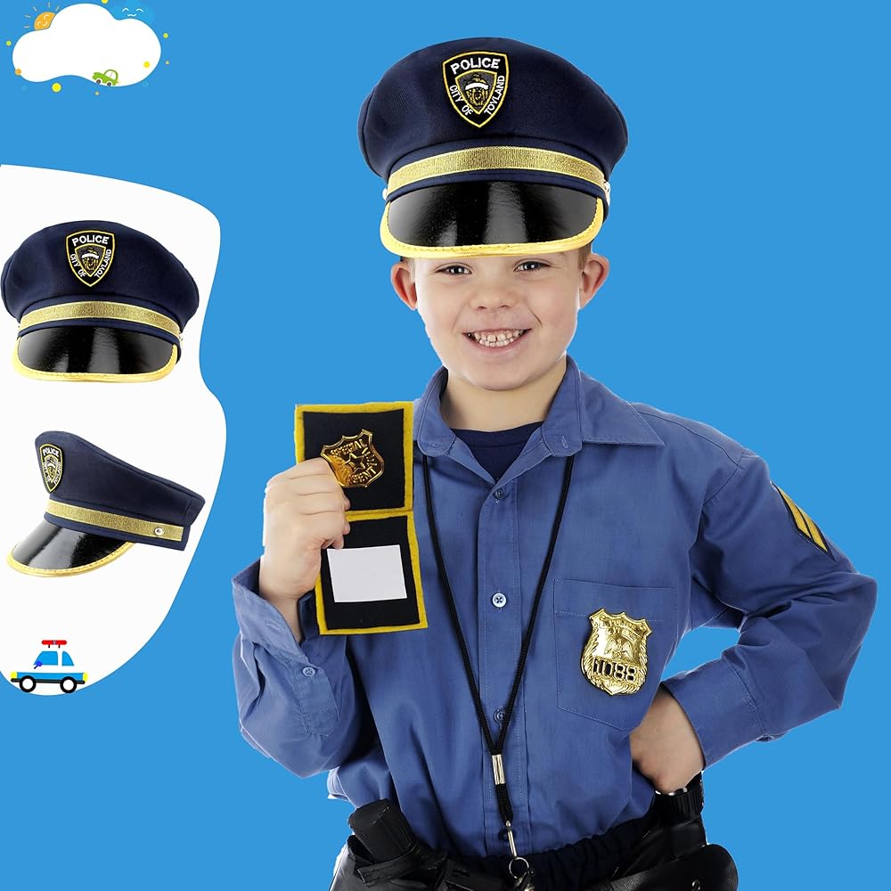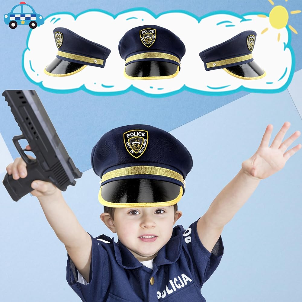 تصميم كلاسيكي: الجزء الأمامي من قبعة مكتب شرطة الأطفال مصمم بشارة ذهبية مطبوعة عليها حروف "POLICE"، والحافة مزينة بزخرفة ذهبية، كلاسيكية وفريدة وعصرية. يبدو الطفل وكأنه رجل شرطة حقيقي بعد ارتدائه، وهو الإكسسوار الرائع لأزياء الشرطة