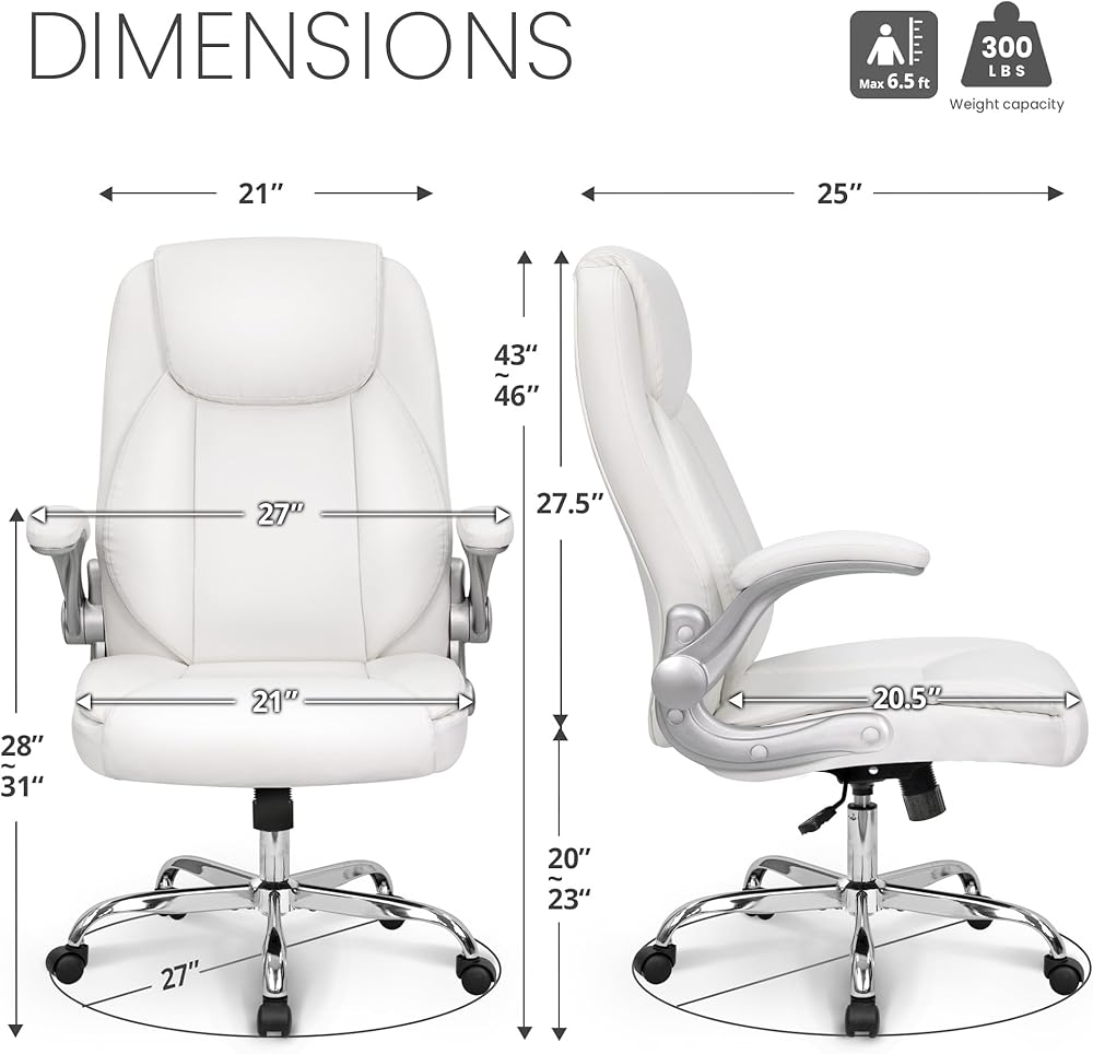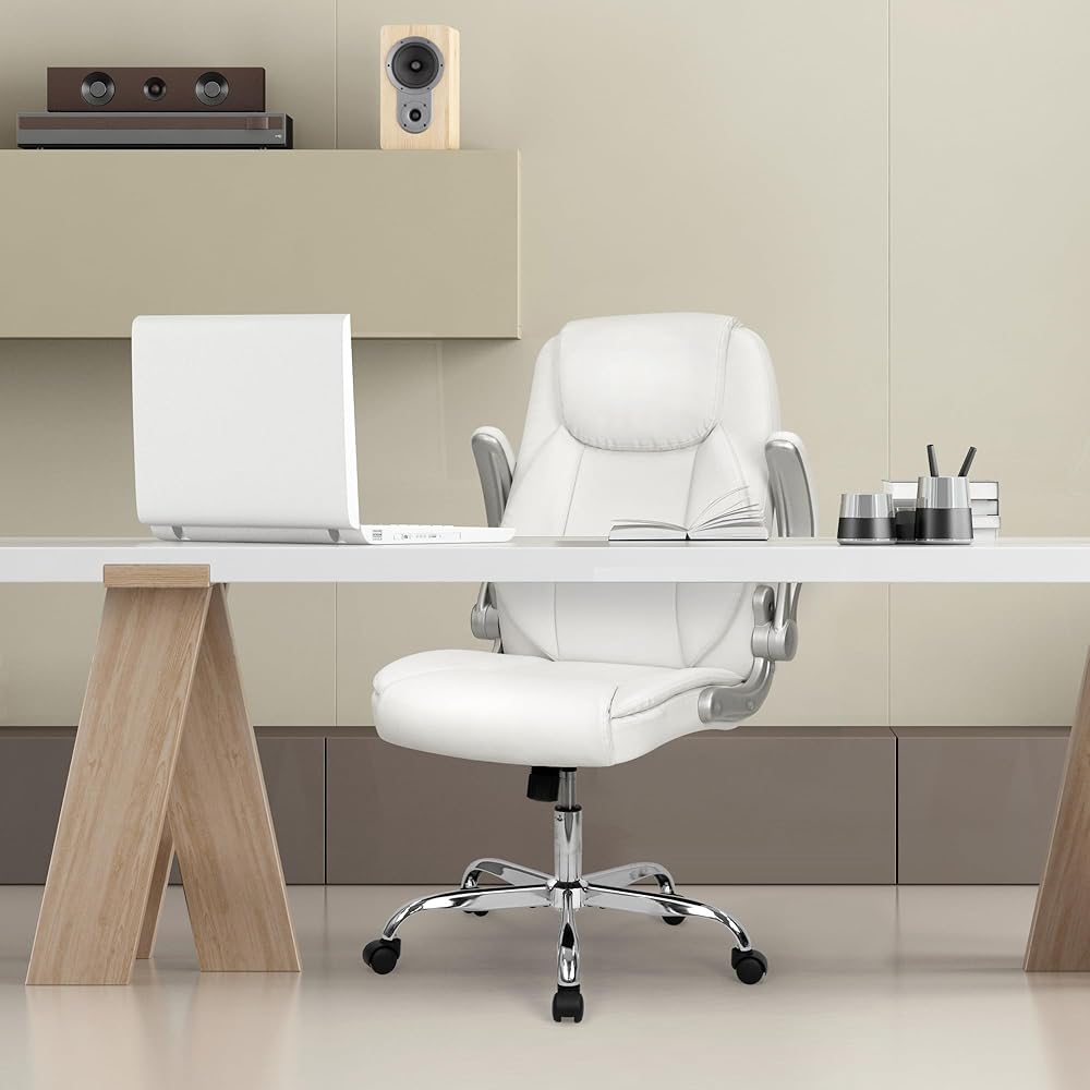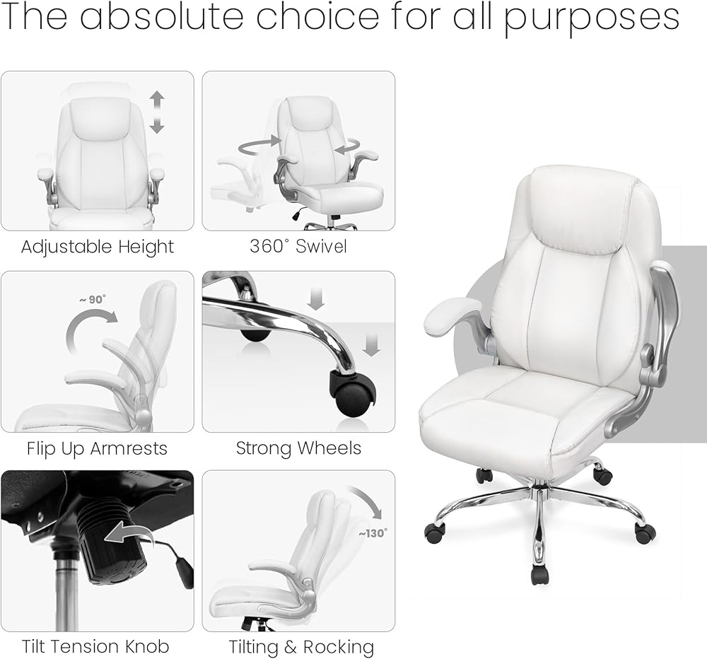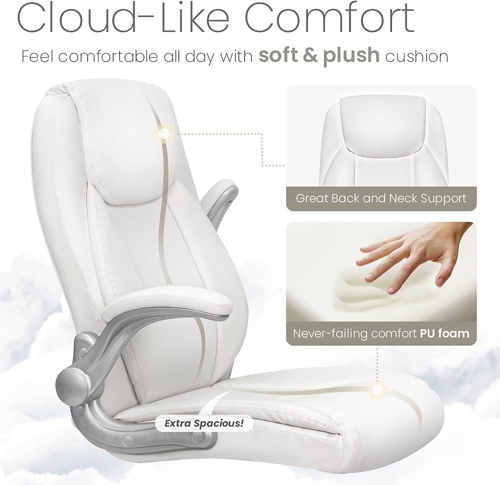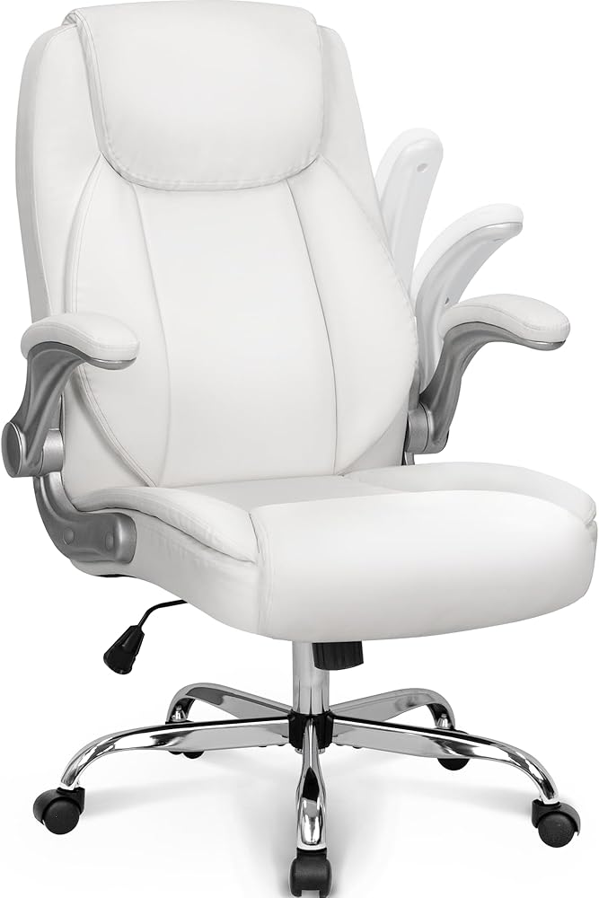 NEO CHAIR كرسي مكتب مريح من جلد البولي يوريثان، كرسي تنفيذي مبطن قابل للطي ومسند للذراعين، كرسي كمبيوتر قابل للتعديل ارتفاع عالي الظهر وعجلات دعم قطنية دوارة لكرسي مكتب الألعاب (أبيض)