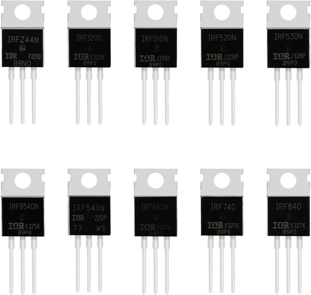 • قناة N: IRFZ44N، IRF3205، IRF510N، IRF520N، IRF530N، IRF540N، IRF640N، IRF740، IRF840. القناة P: IRF9540N