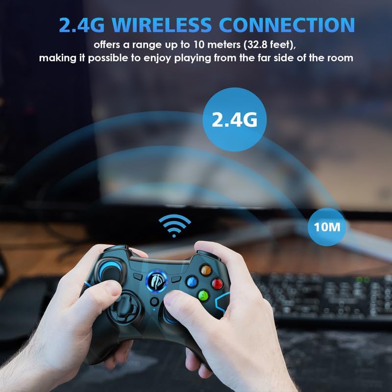 🎮[نقل لاسلكي 2.4 جيجا] تضمن تقنية النقل اللاسلكي 2.4 جيجا اتصالًا مستقرًا دون أي تأخير، وتوفر نطاقًا يصل إلى 10 أمتار (32.8 قدمًا)، مما يجعل من الممكن الاستمتاع باللعب من الجانب البعيد من الغرفة.