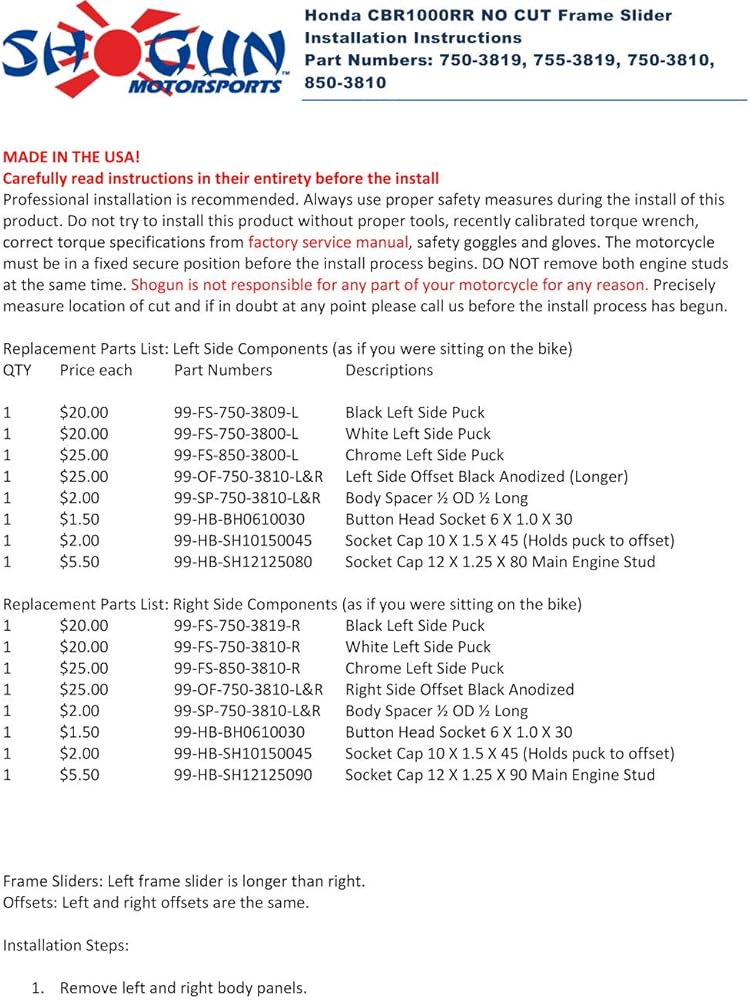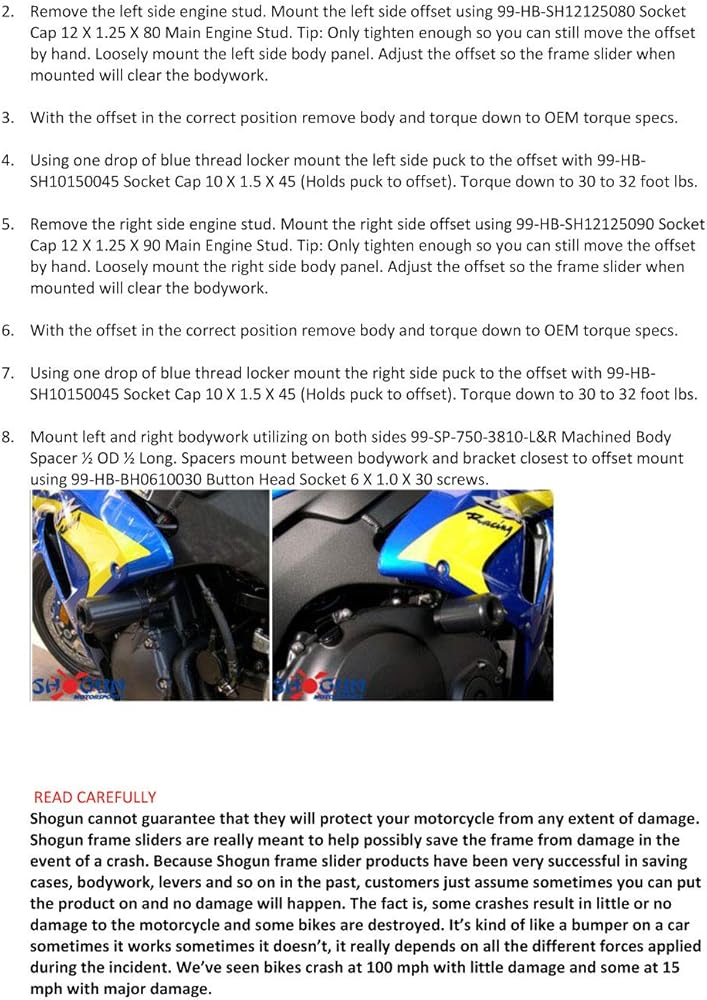 تحتوي جميع مجموعات شوجان موتورسبورتس القياسية على قطع غيار متوفرة إلى جانب ضمان استبدال القرص المجاني لمدة عام واحد لمجموعات الأبيض والأسود وPA2. تأتي جميع مجموعات الإطارات المنزلقة مع أشرطة منزلقة للإطار الأيسر والأيمن وجميع أدوات التركيب اللازمة. (اتصل بـ شوجان موتورسبورتس للحصول على التفاصيل.)