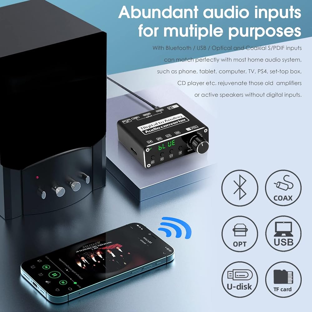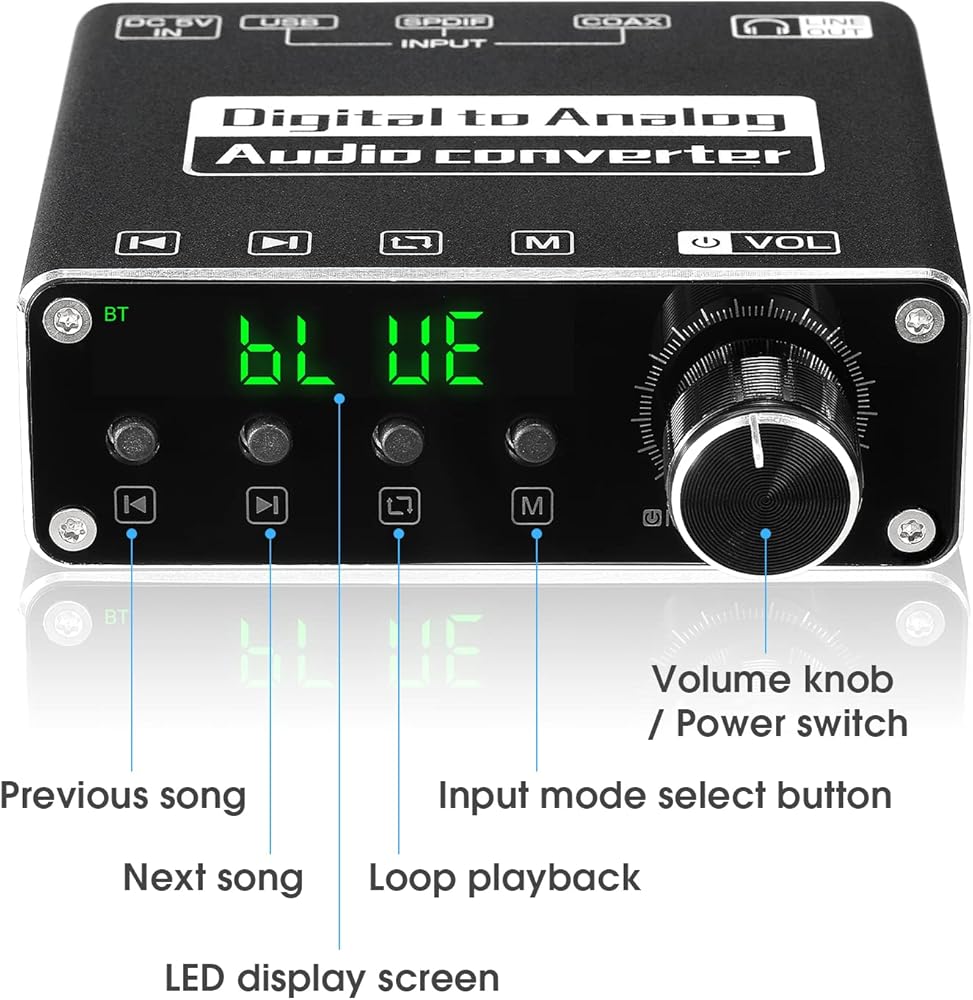 ملحقات كاملة وسهولة الاستخدام: مع شاشة LED لإظهار حالة العمل بوضوح، تأتي مع جميع الكابلات، لا حاجة إلى شراء إضافي؛ جهد تشغيل تيار مستمر 5 فولت مع حماية من الجهد الزائد OVP ودائرة فلتر مزدوجة، مناسب جدًا لاستخدام نظام الصوت في المنزل/سطح المكتب/السيارة/القارب.