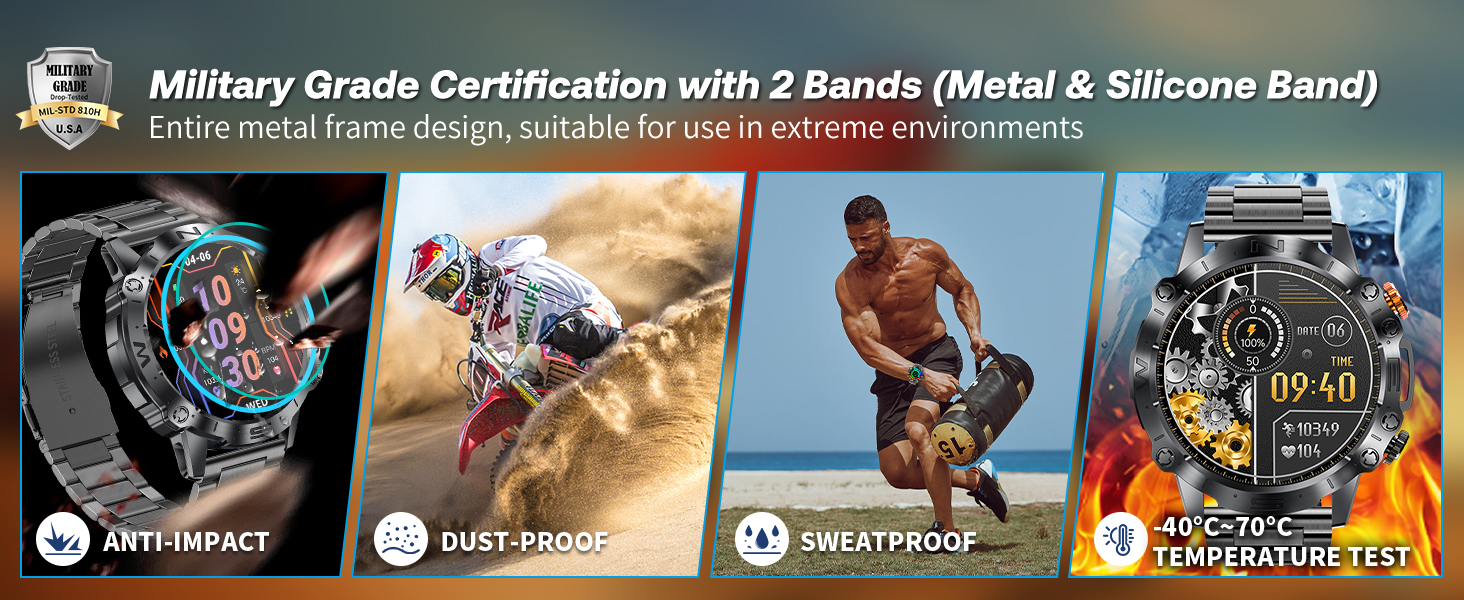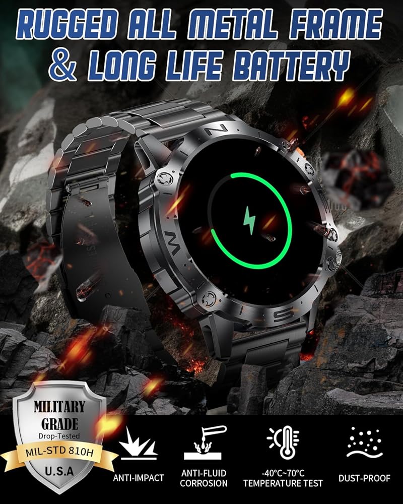 ⌚ 【ساعة ذكية معتمدة من الدرجة العسكرية مصنوعة بالكامل من المعدن】خضعت لأقسى اختبارات المتانة على الكوكب - محاكاة الصحارى والغابات المطيرة وظروف القطب الشمالي - تخضع هذه الساعة الذكية من الدرجة العسكرية لـ 15 تجربة صارمة لتحقيق مرونة لا مثيل لها - مما يثبت أن الساعة فقط تم تصميمها بشكل متين بما فيه الكفاية لأي بيئة ويمكن أن تكون ذكية بما يكفي لسهولة الوصول إليها، مما يمكّن مرتديها أينما تقود الحياة. بفضل تصنيف IP67 لمقاومة الماء، تتحمل الساعة رذاذ الماء والعرق والعواصف الممطرة - ويمكن ارتداؤها أثناء غسل اليدين أو في المطر الخفيف (رغم أنها غير مناسبة للسباحة أو الغمر لفترة طويلة).