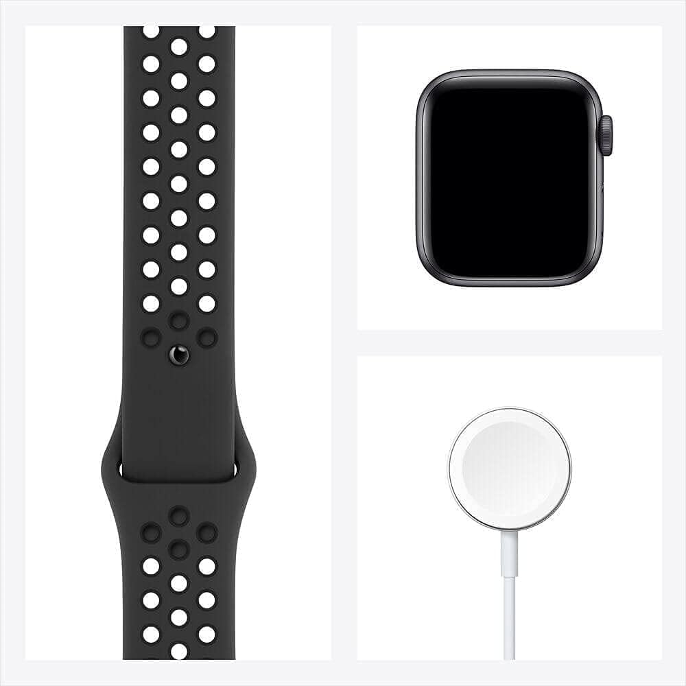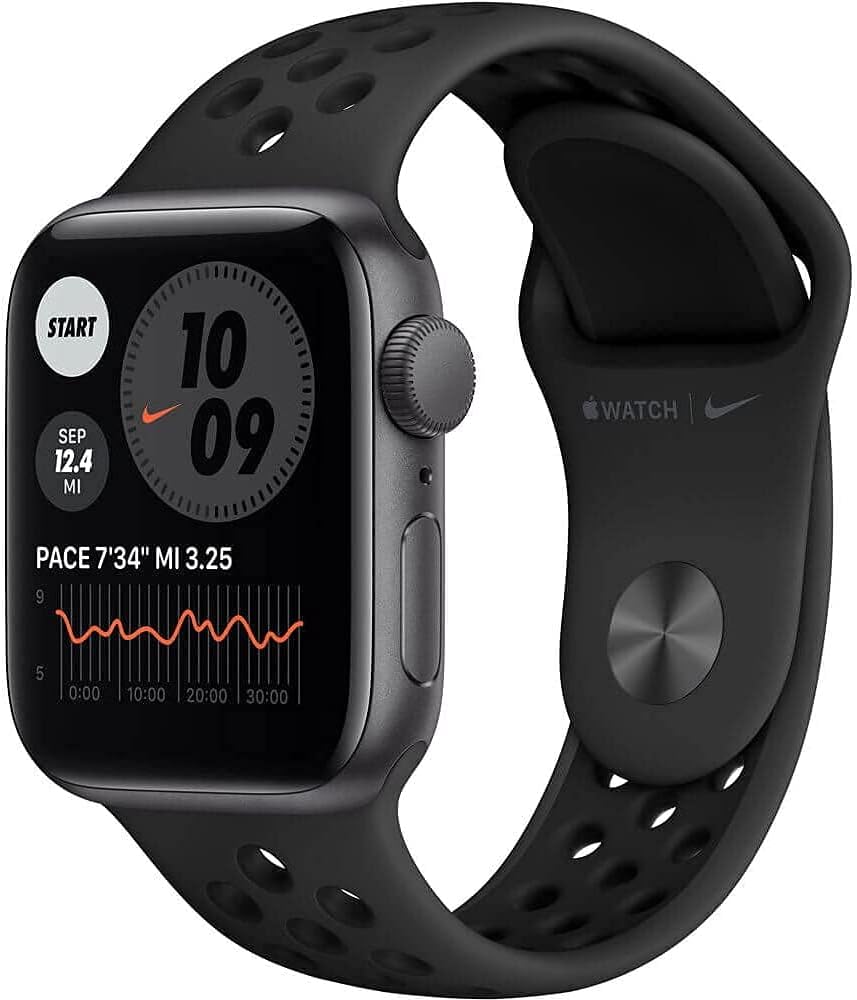 Apple Watch Nike SE (نظام تحديد المواقع العالمي (GPS)، مقاس 40 ملم) من الألومنيوم باللون الرمادي الفلكي مع حزام Nike الرياضي بلون فحمي/أسود (تم تجديده)