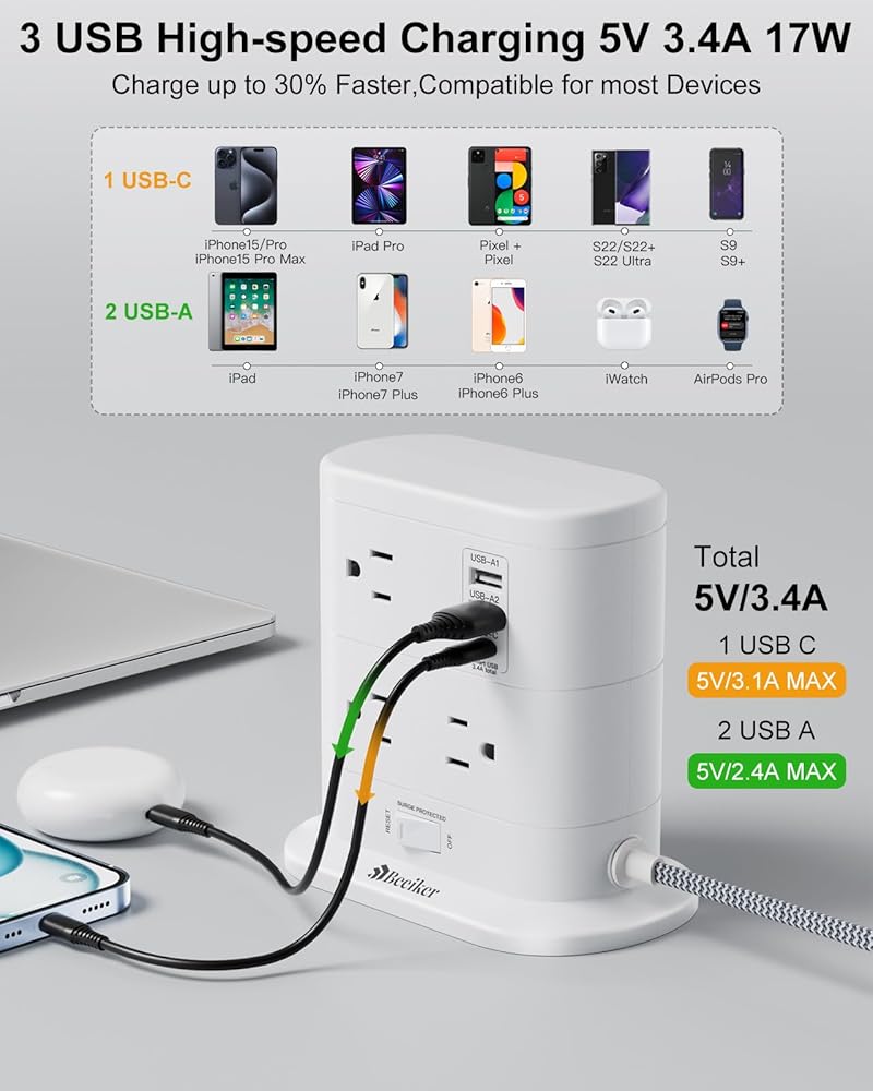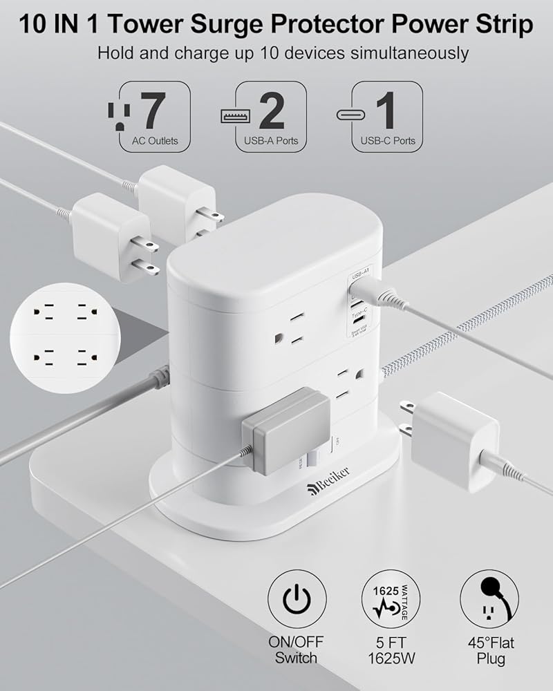 【10 في 1 شريط طاقة للحماية من ارتفاع التيار البرجي مع منافذ USB】- يتميز سلك التمديد ذو المنافذ المتعددة بـ 7 منافذ تيار متردد متباعدة على نطاق واسع (1625 وات/125 فولت/13 أمبير) ومنفذين USB-A 1 USB-C (5 فولت/3.4 أمبير/17 وات) إجمالي)، يمكنه شحن 10 أجهزة في وقت واحد. يمكنه شحن هاتفك الخلوي والكمبيوتر المحمول والكمبيوتر اللوحي والكاميرات وما إلى ذلك، وهو مناسب لملحقات المكتب وغرفة النوم الجامعي.