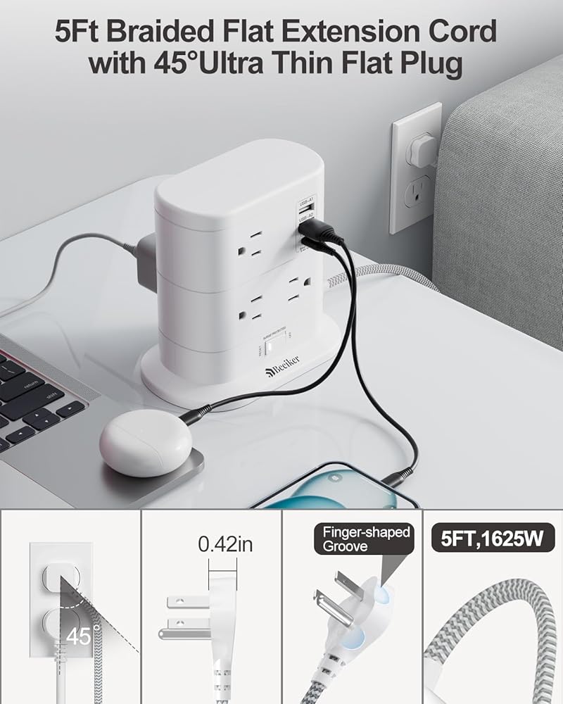 【أسلاك تمديد مضفرة بطول 5 أقدام مع قابس مسطح رفيع للغاية】مع قابس رفيع للغاية مقاس 0.42 بوصة فقط وتصميم زاوية يمين 45 درجة، يكون واقي التيار المزود بمنافذ USB أرق بكثير من المقابس التقليدية، والتي يمكن إغلاقها من الحائط بسهولة، والاختباء في الجزء الخلفي من الأثاث أو السرير أو الثلاجة. سلك تمديد مسطح بطول 5 أقدام و16AWG مصنوع من النحاس النقي، والذي يتمتع بقدرة حمل أفضل للتيار (13 أمبير). سلك الطاقة القماشي المضفر ليس من السهل تشويهه، وهو متين وأكثر أمانًا.